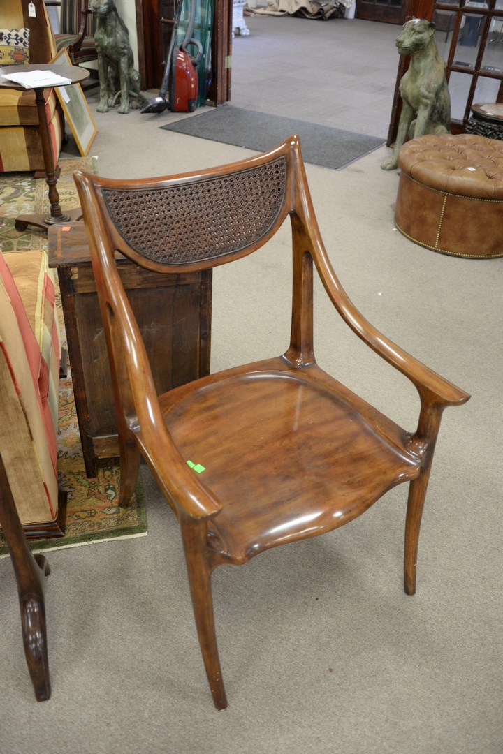Pair of Keno Brothers for Stickley Slope Armchairs, having rush backs and brass tags to the underside, height 38 inches, seat height 17 1/2 inches.