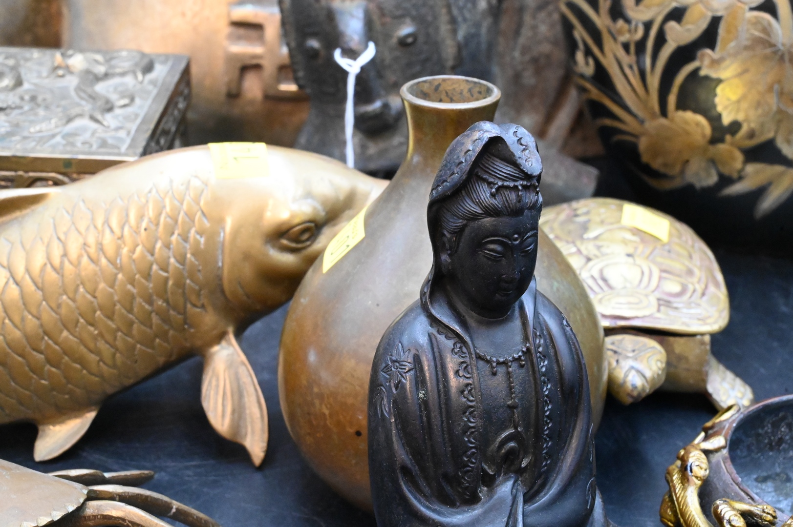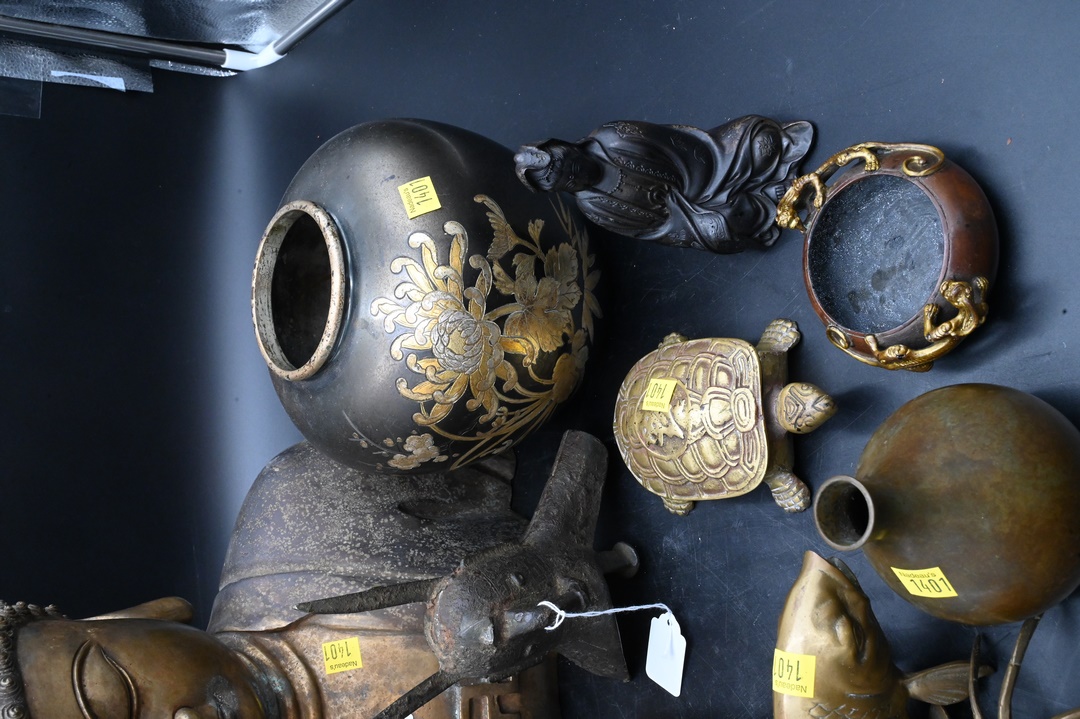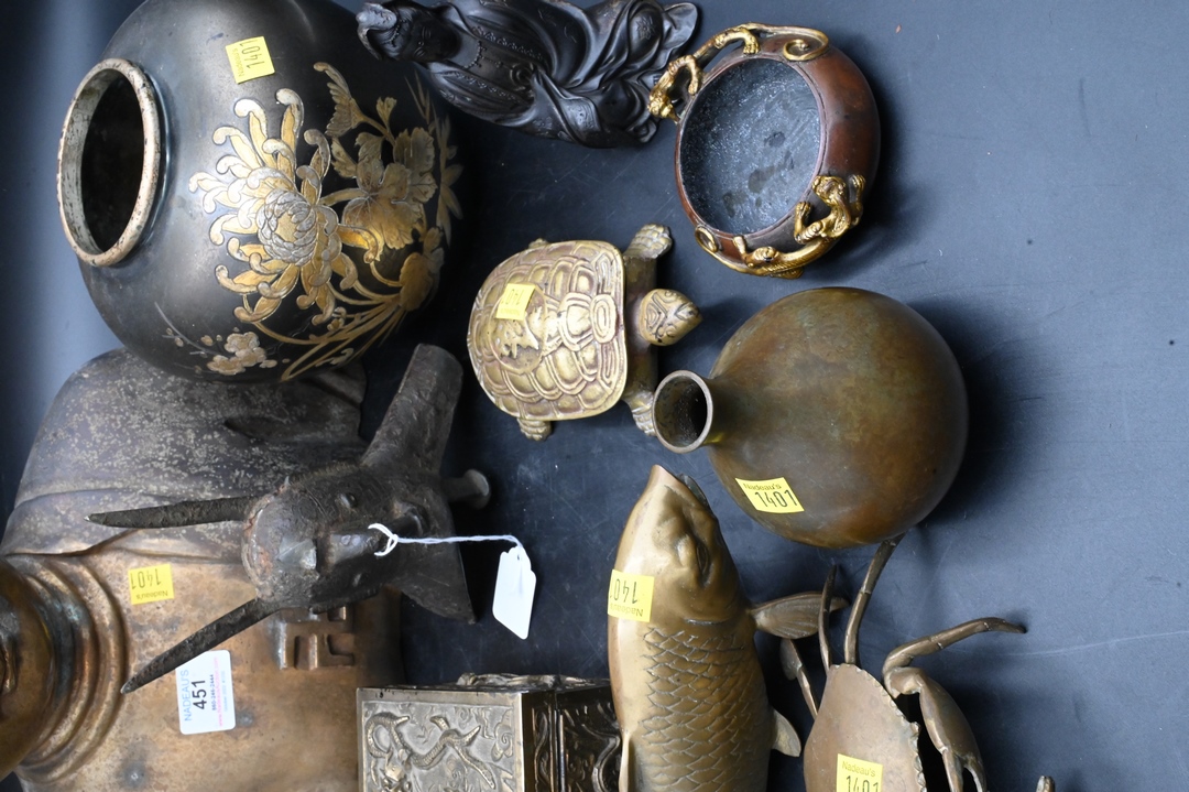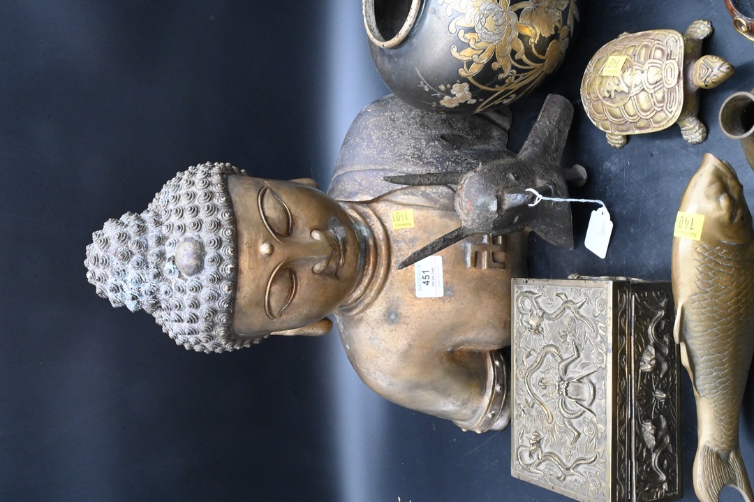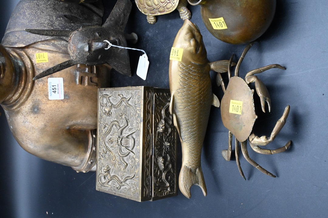 Ten Piece Chinese Brass and Bronze Group, to include a small Chinese seated Guanyin, height 5 inches, a 19th/20th century covered dragon box, length 7 inches, a 19th/20th century brush washer with Kylin handles, diameter 4 inches; along with a bronze drinking cup (jue), probably Ming Dynasty, and missing one leg, height 7 inches, gilt bronze bust of buddha, height 17 inches, Korean turtle box, length 6 inches; articulated crab box, width 5 inches; carp, length 6 1/2 inches; along with two Japanese vases, one of mixed metal, height 7 inches; the other small floral, height 5 inches.