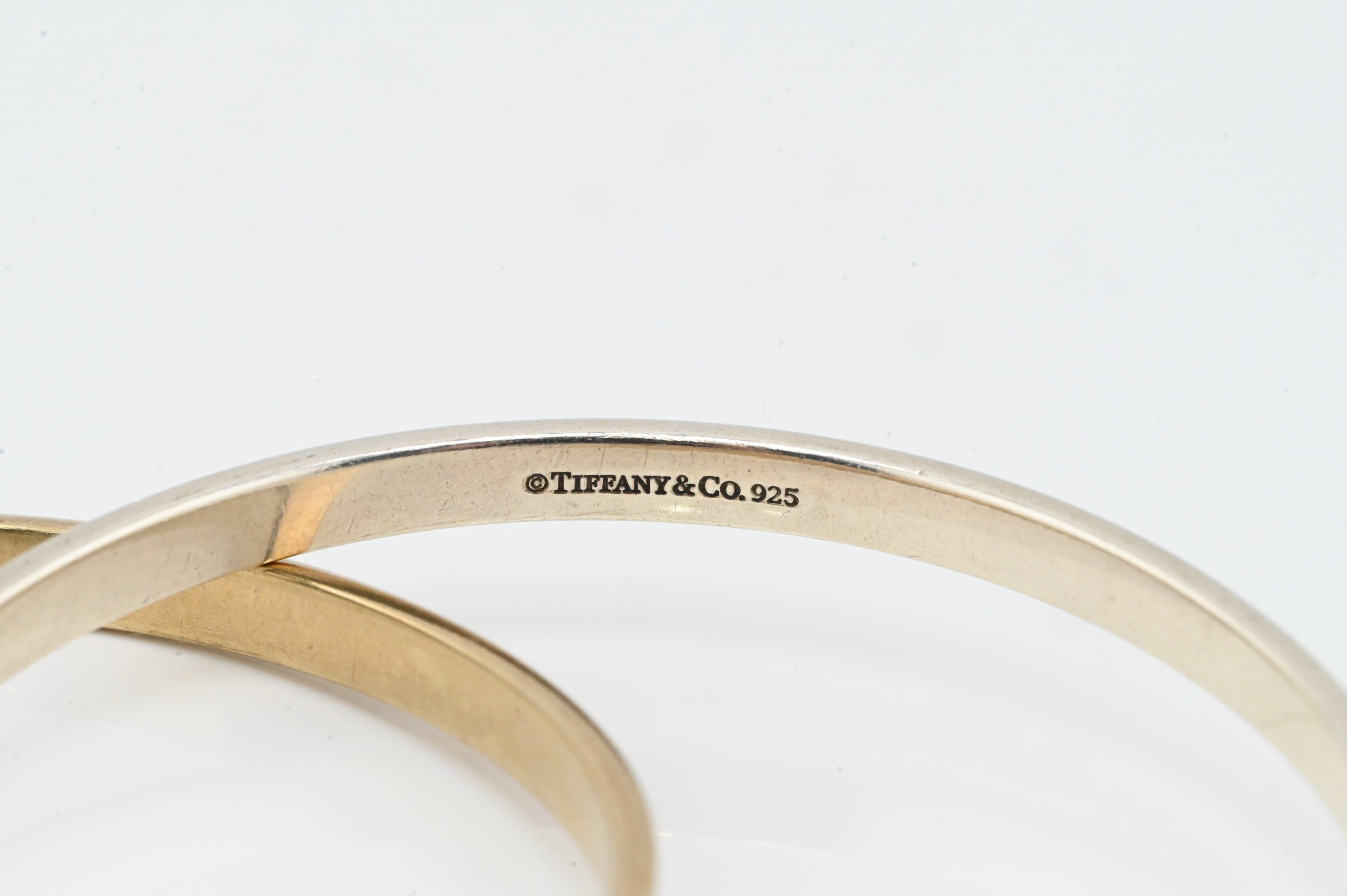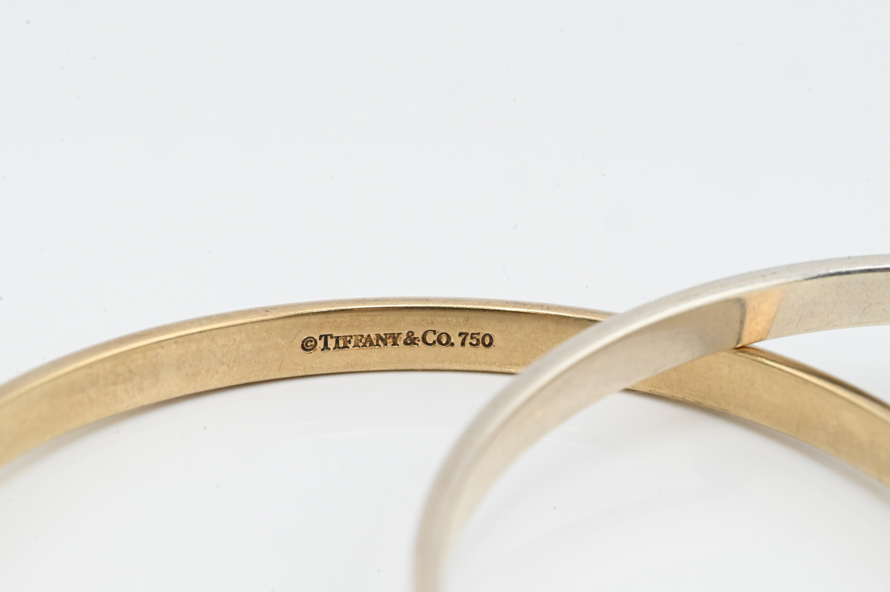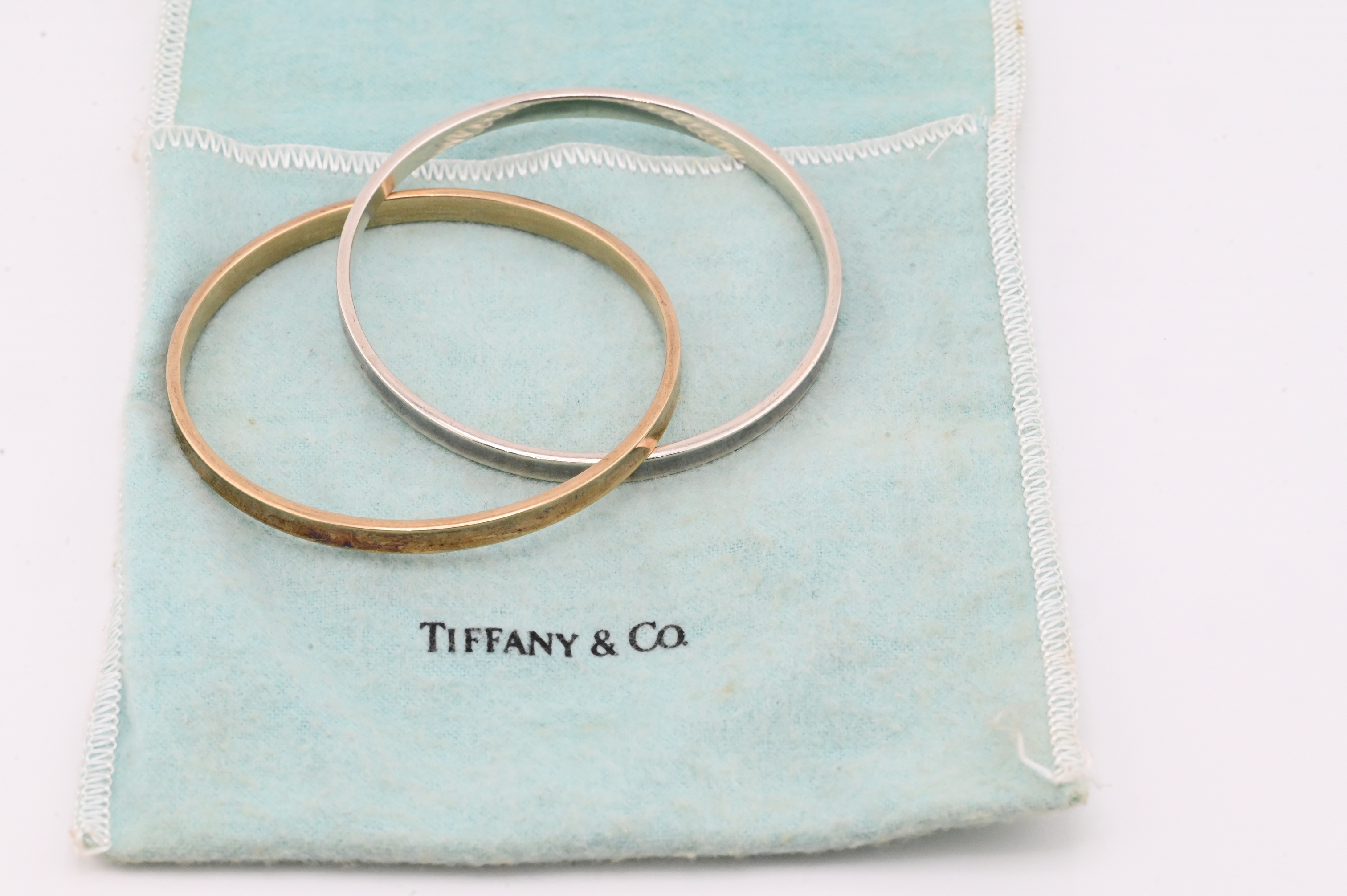 Comprising one 18K yellow gold bangle and one sterling silver .925 bangle, each marked T & CO 1837, designed to be worn interlocked, the gold bangle weighing 31.89 grams, the sterling silver bangle weighing approximately 0.6 troy ounces (20.6 grams), outer circumference approximately 9¼ inches, along with Tiffany and Co. felt pouch