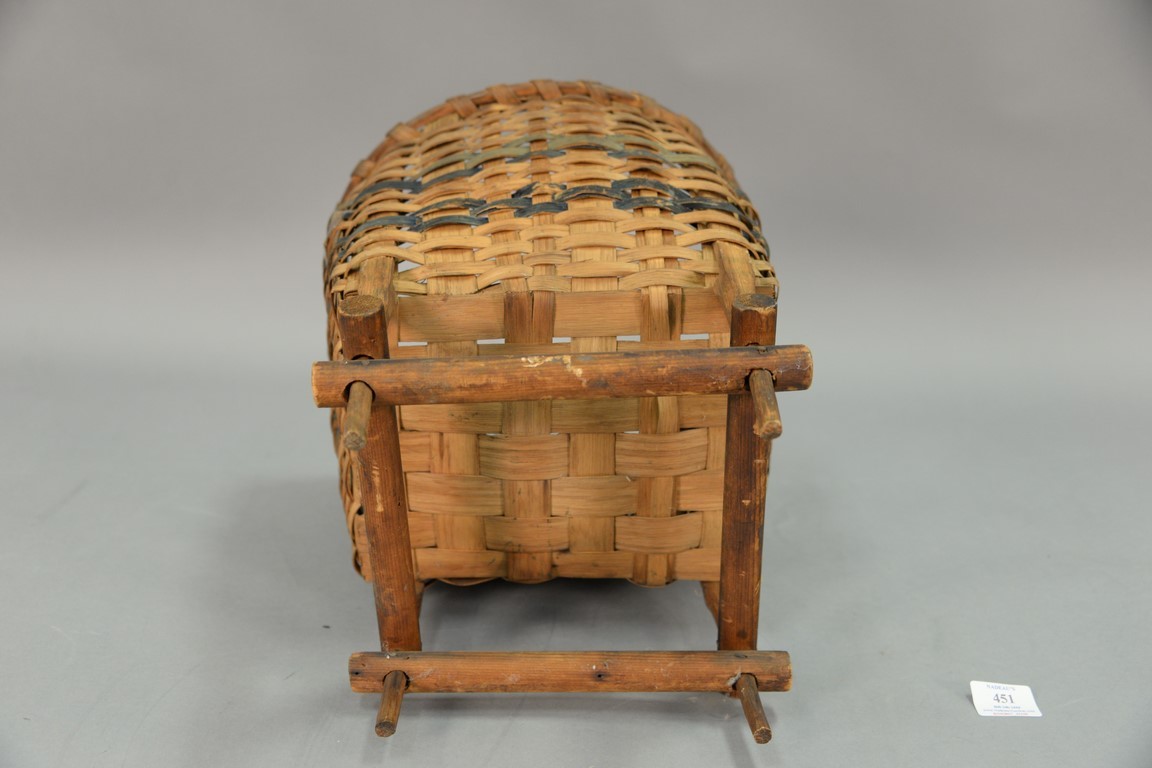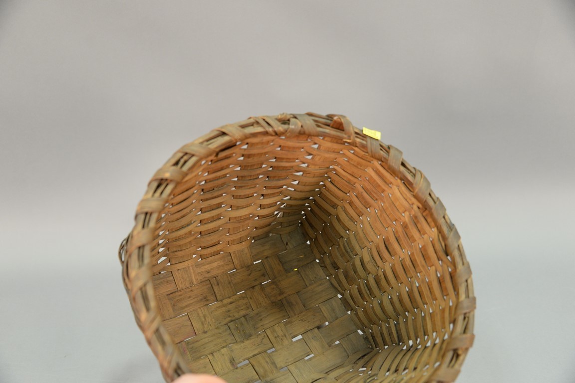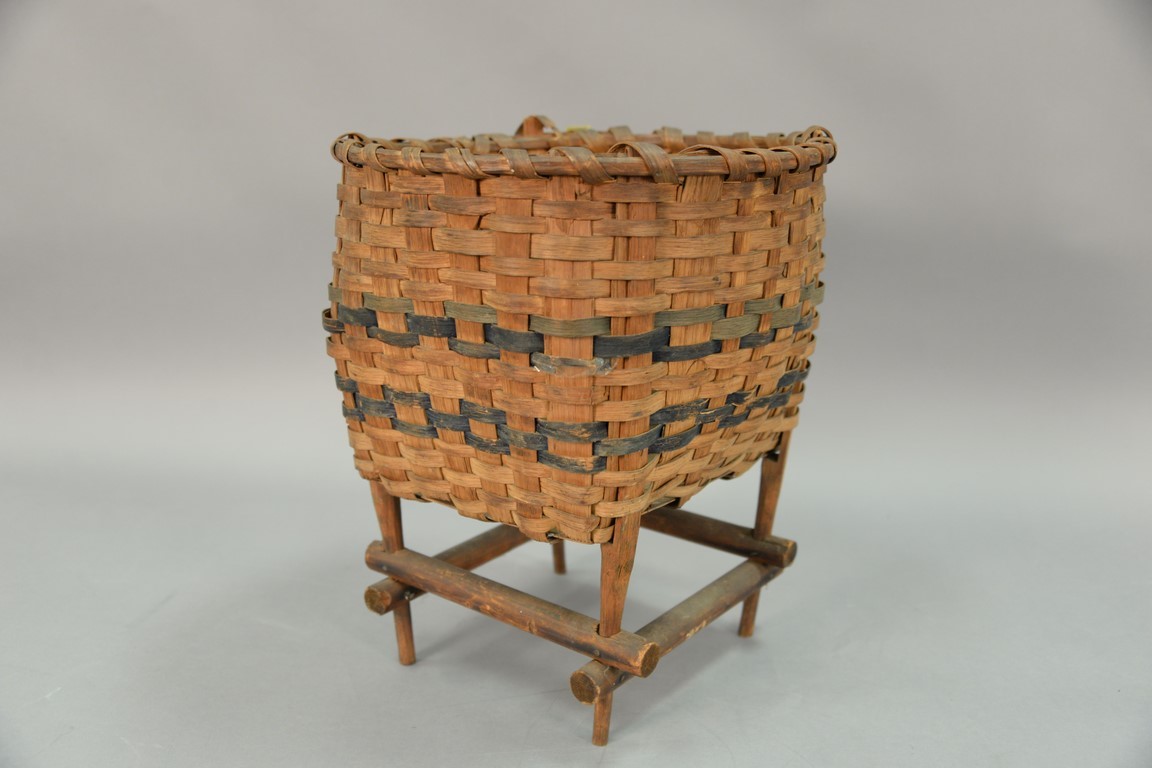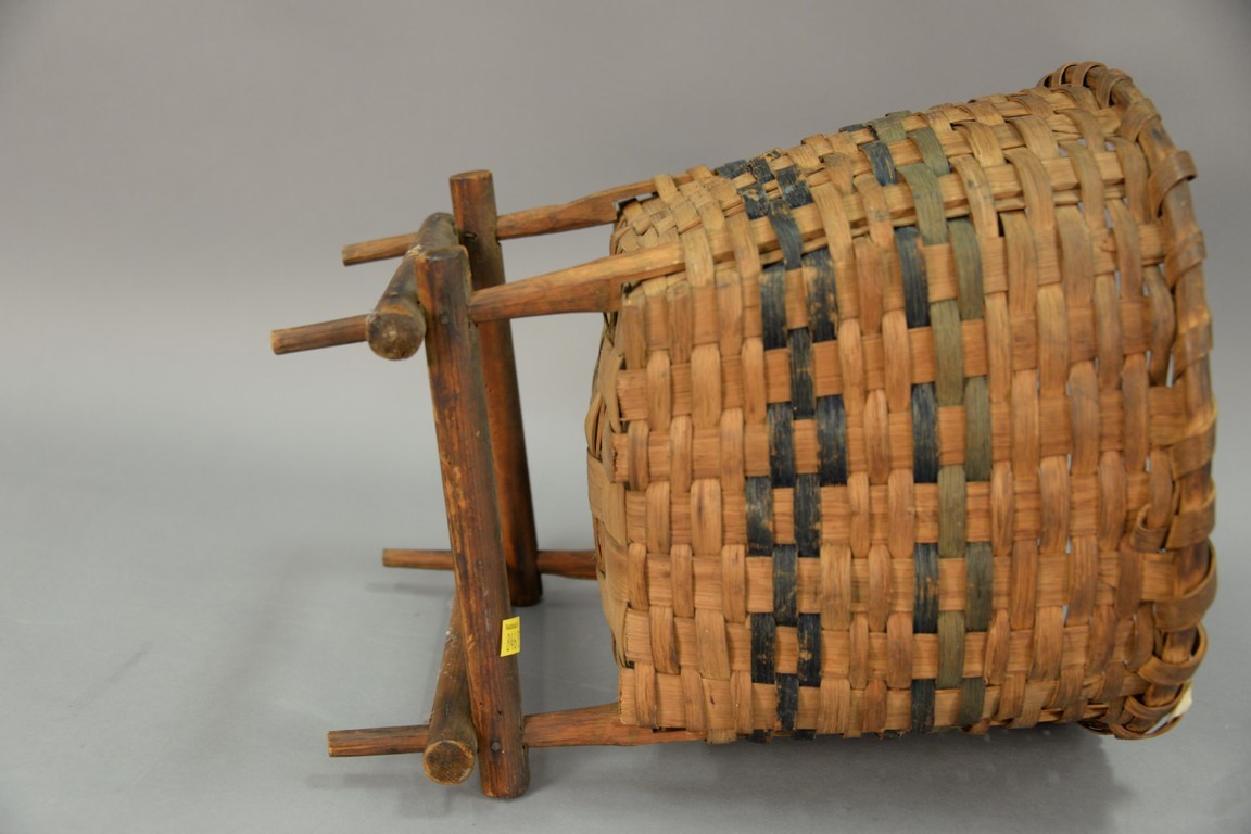 Lot 451: Woven splint basket with light blue paint on stretcher base stand, 19th century. ht. 15 1/2in., dia. 13 1/2in. Provenance: Estate…