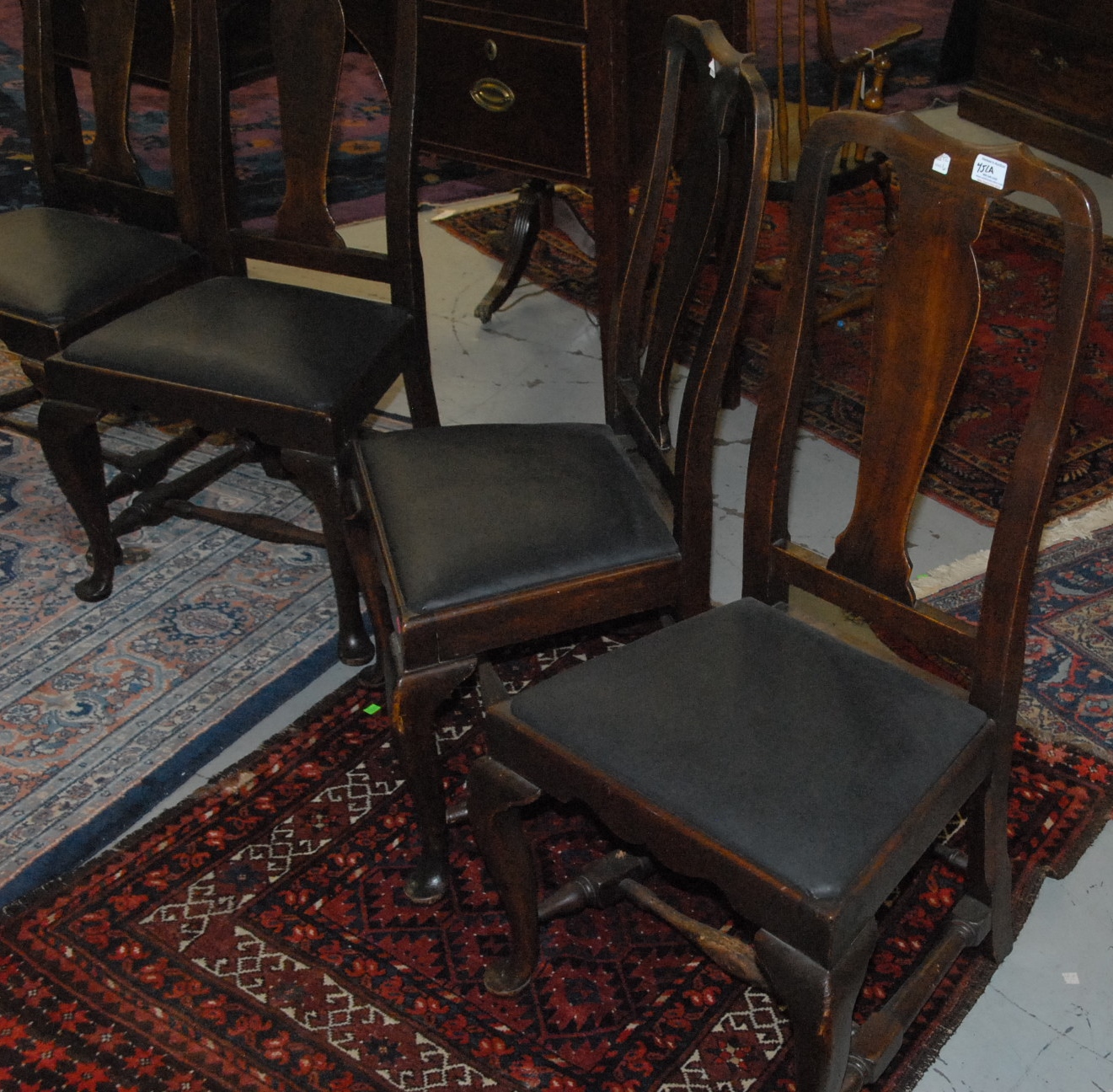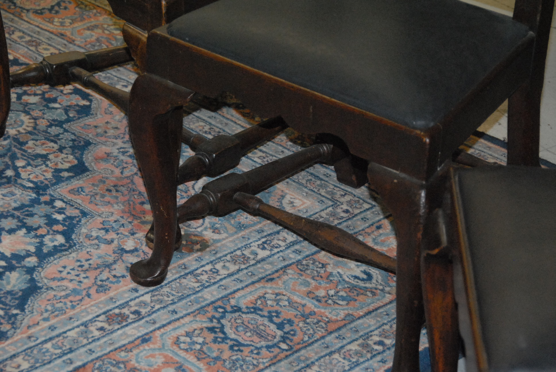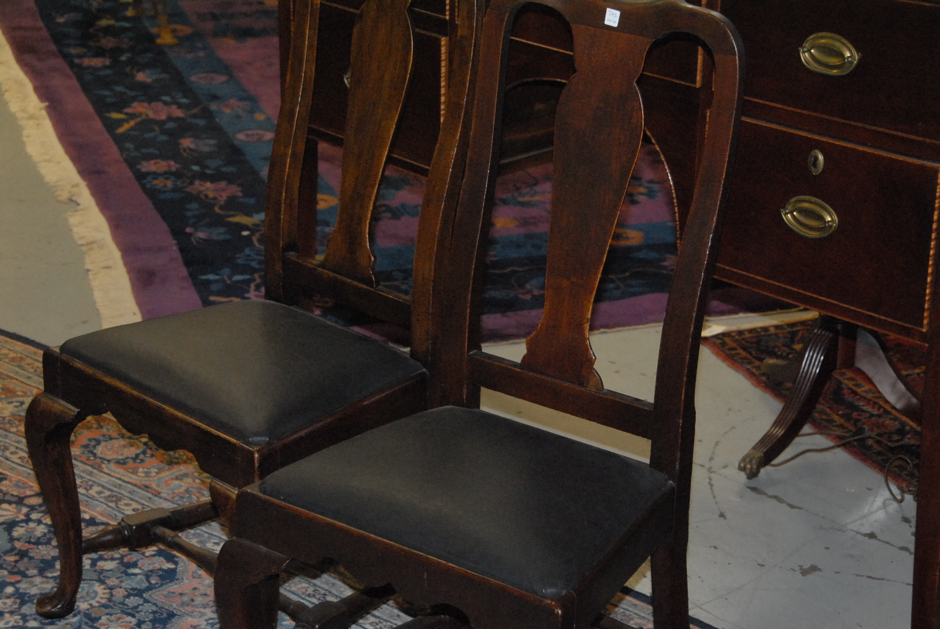 Lot 451A: Set of six mahogany Queen Anne style side chairs with scalloped front rail and cabriole legs connected with block and turned stretchers, early to mid 20th century.