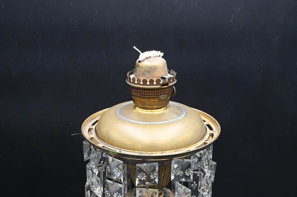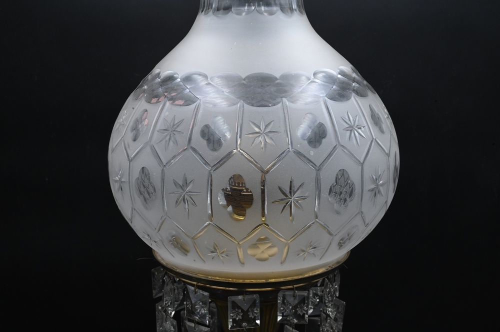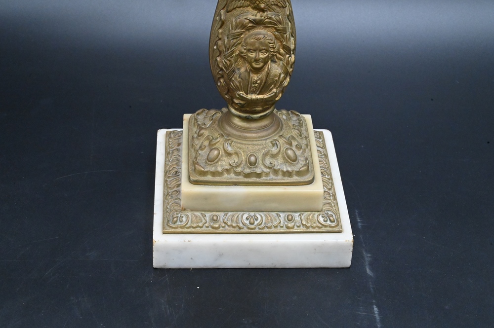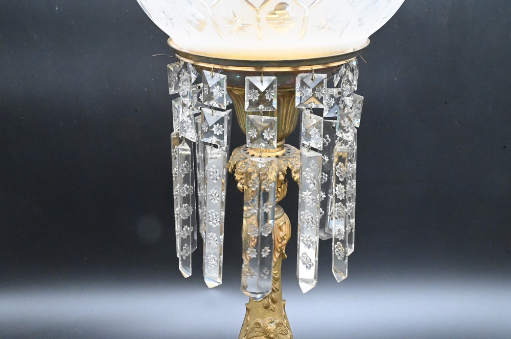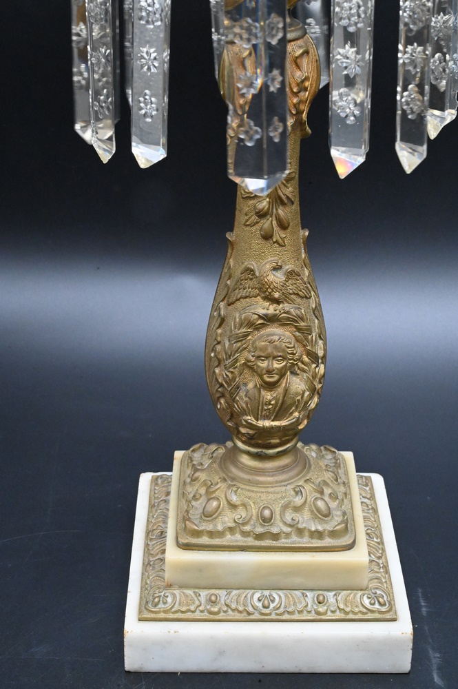 Lot 452: American Bronze George Washington Astral Lamp, having frost and clear glass shade, etched prism over bronze base with embossed eagle; along with a bust of George Washington, height 29 inches.