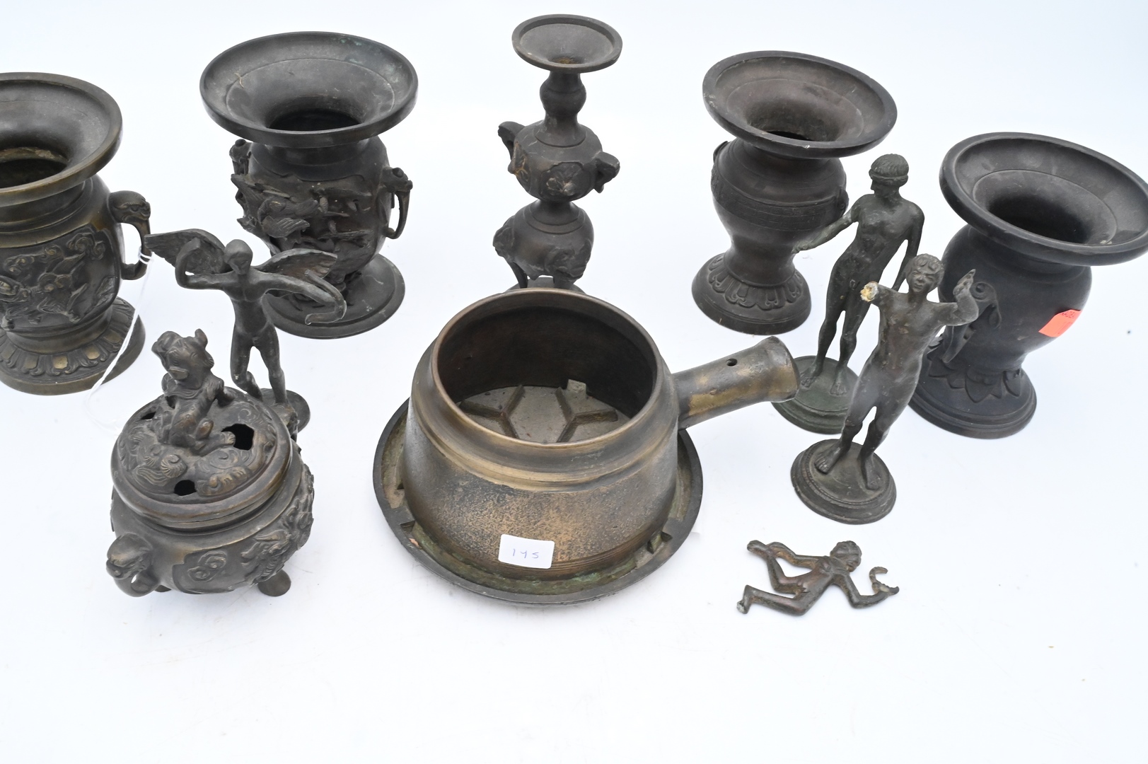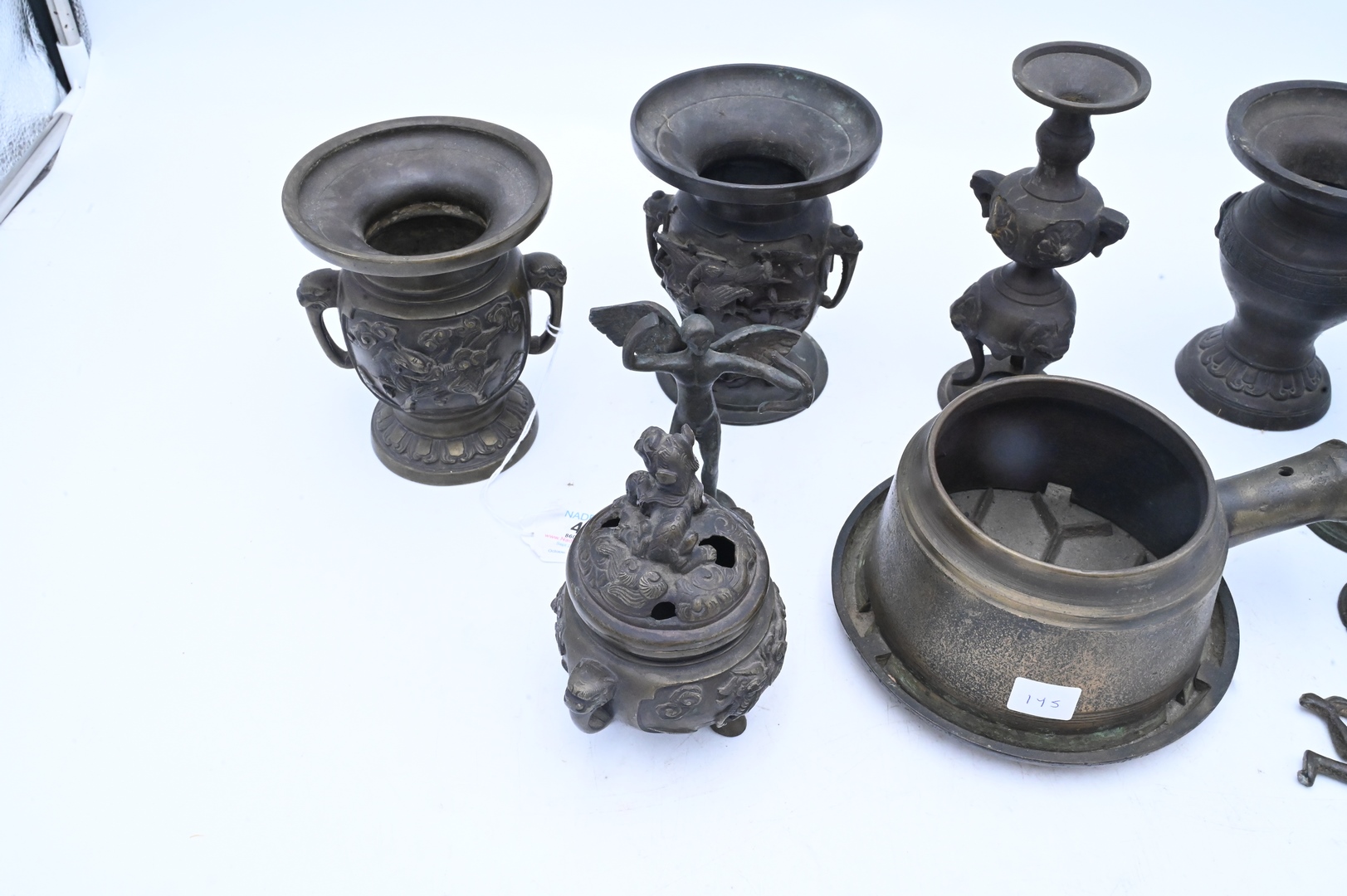 Assorted Group of 13 Items, to include four Japanese urns; bronze chinese censer with foo dog finial; bronze double gourd vase; small satsuma vase; a small bronze mirror; carved box with compass tallest 6 1/2 inches; along with a group of four bronze figures, one having disconnected arm but available, tallest 6 inches. Provenance: Estate of Wallace Bradway, New Haven, CT.