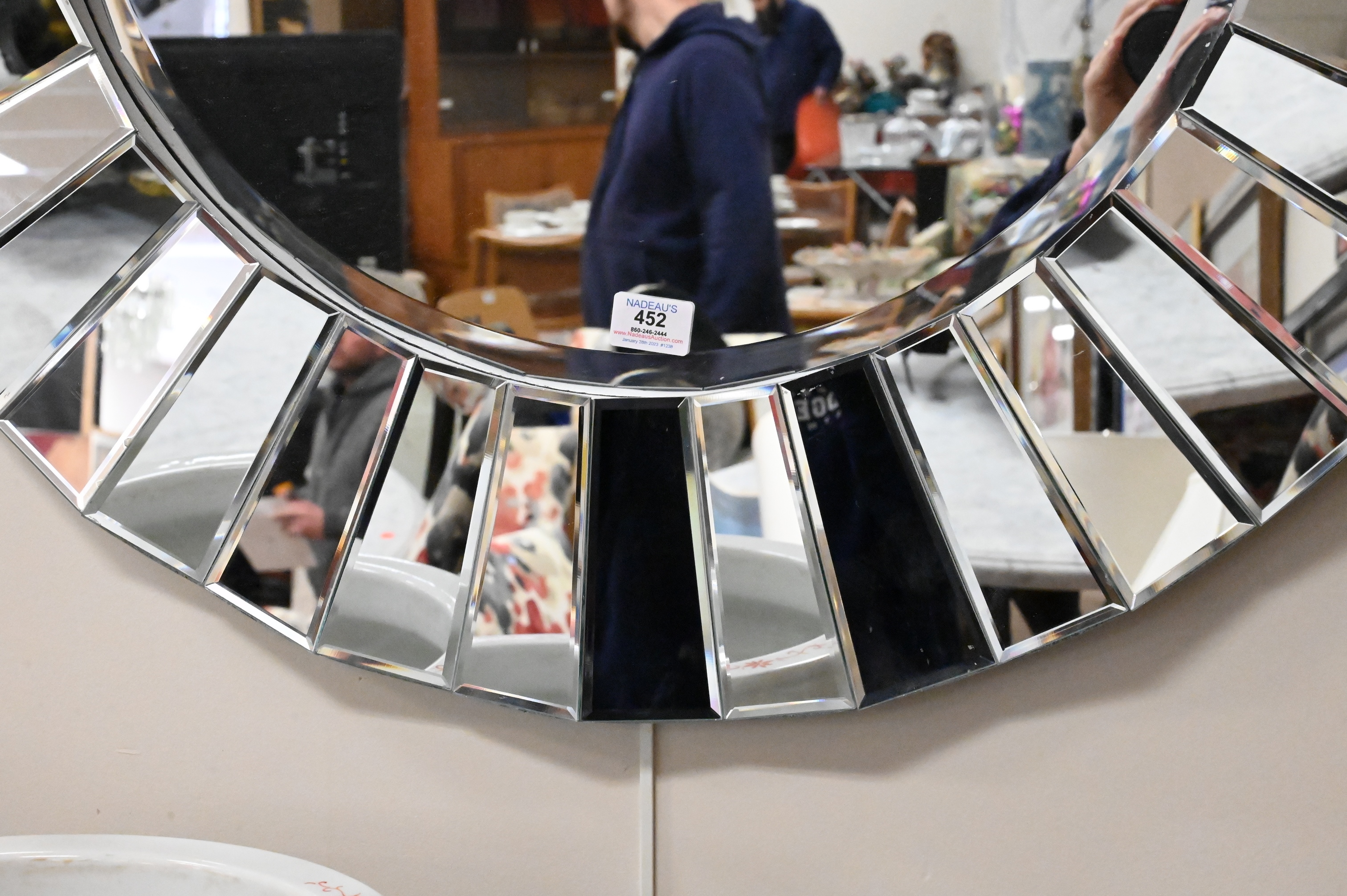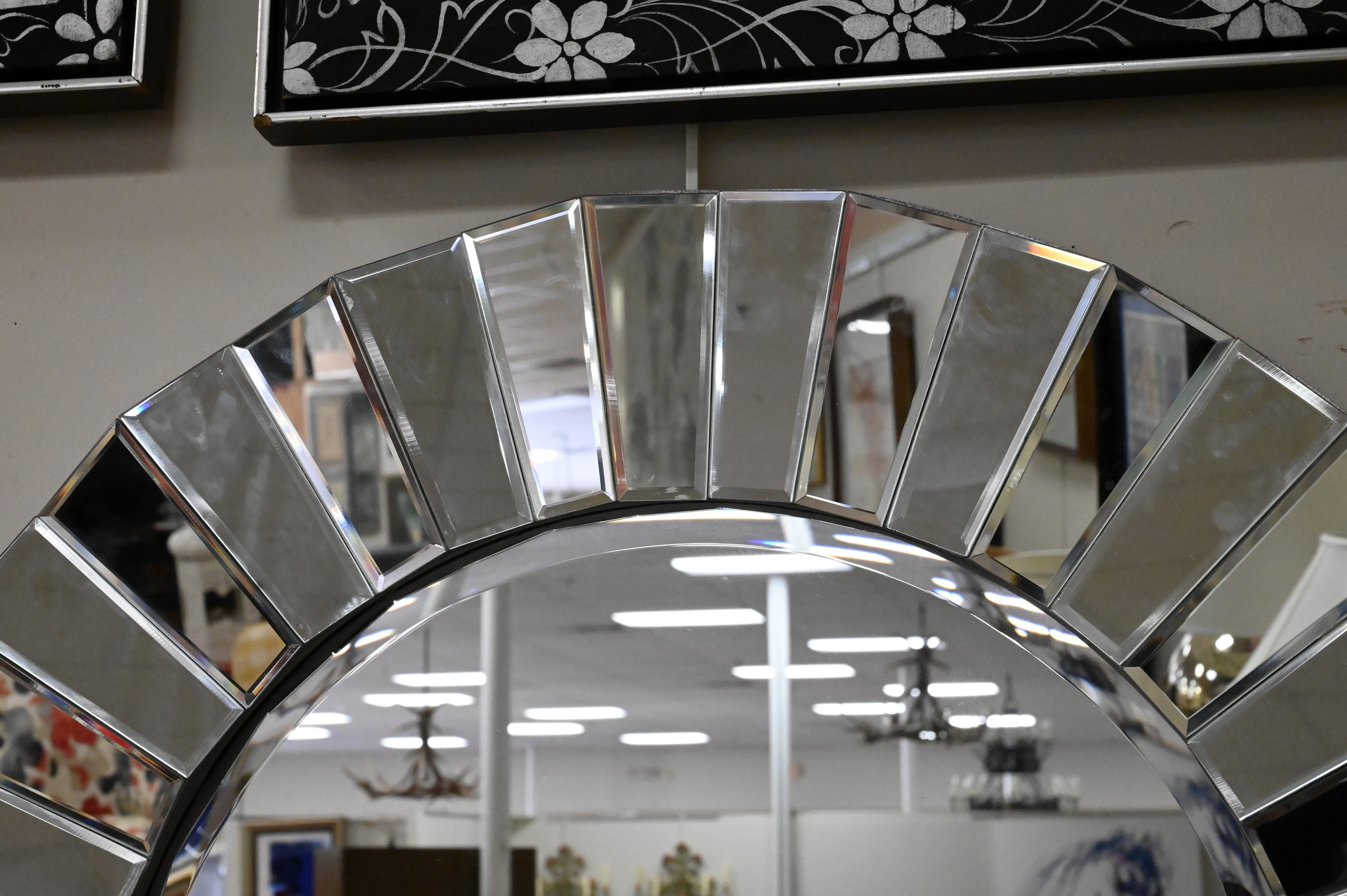 Contemporary Round Mirror, having trapezoid beveled glass mirror frame, diameter 35 inches.