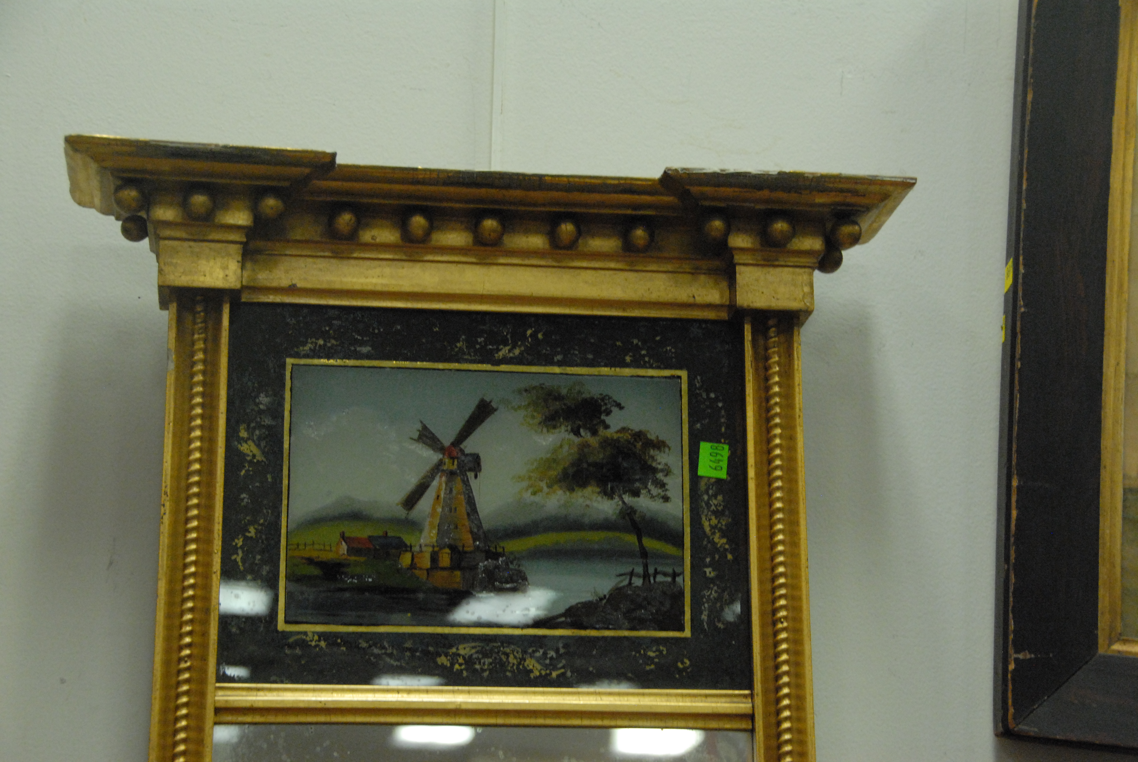 Lot 452: Federal gilt two part mirror having painted windmill in upper section over mirror flanked by spiral columns. ht. 32in. wd. 18in.