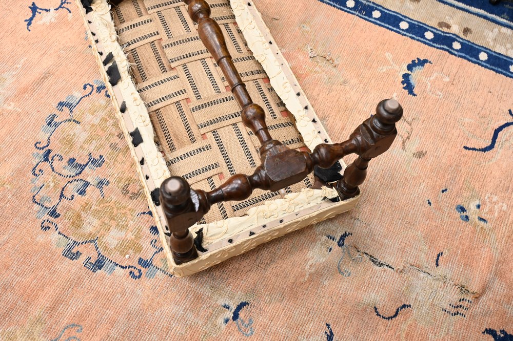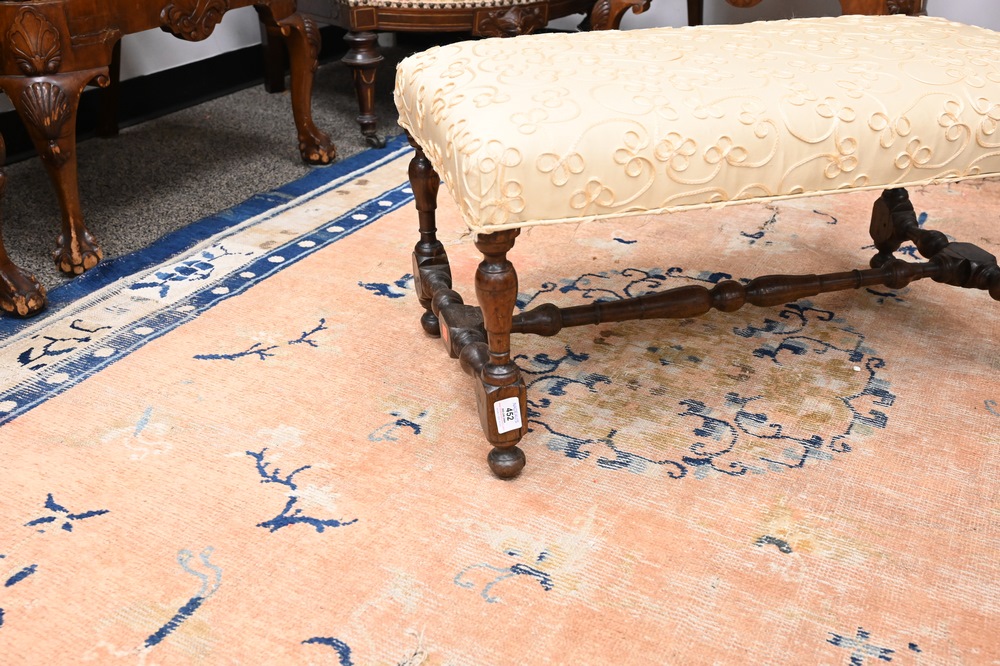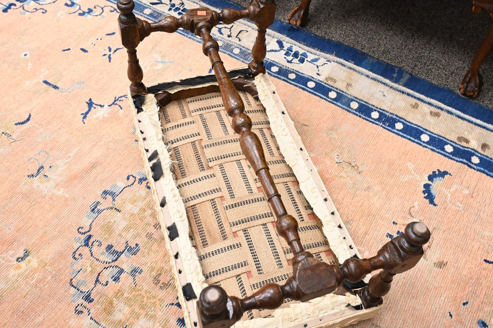 Lot 452: Queen Anne Style Walnut Bench, having custom upholstered top set on block and turned legs, height 15 inches, top 16″ x 30″.