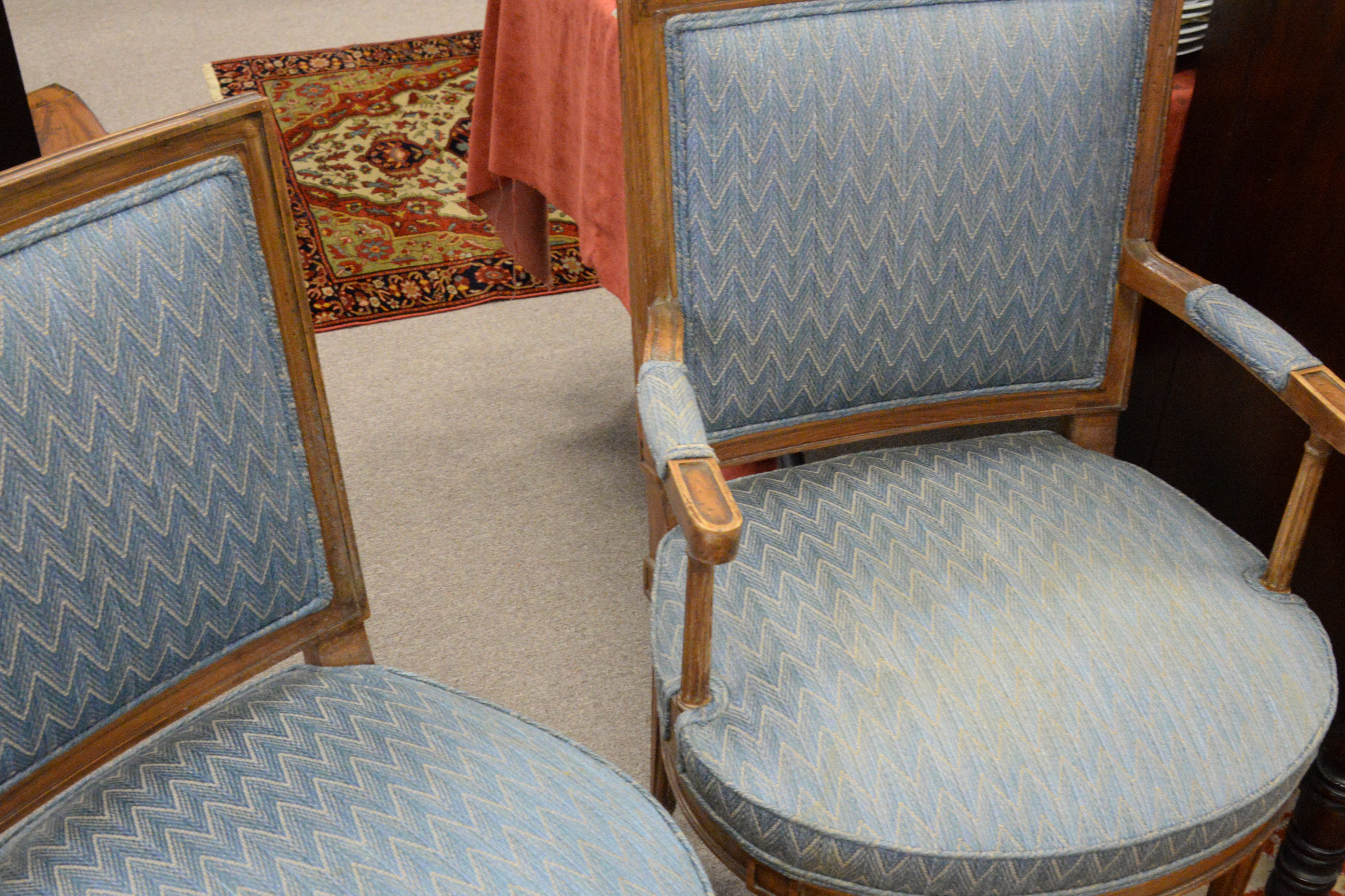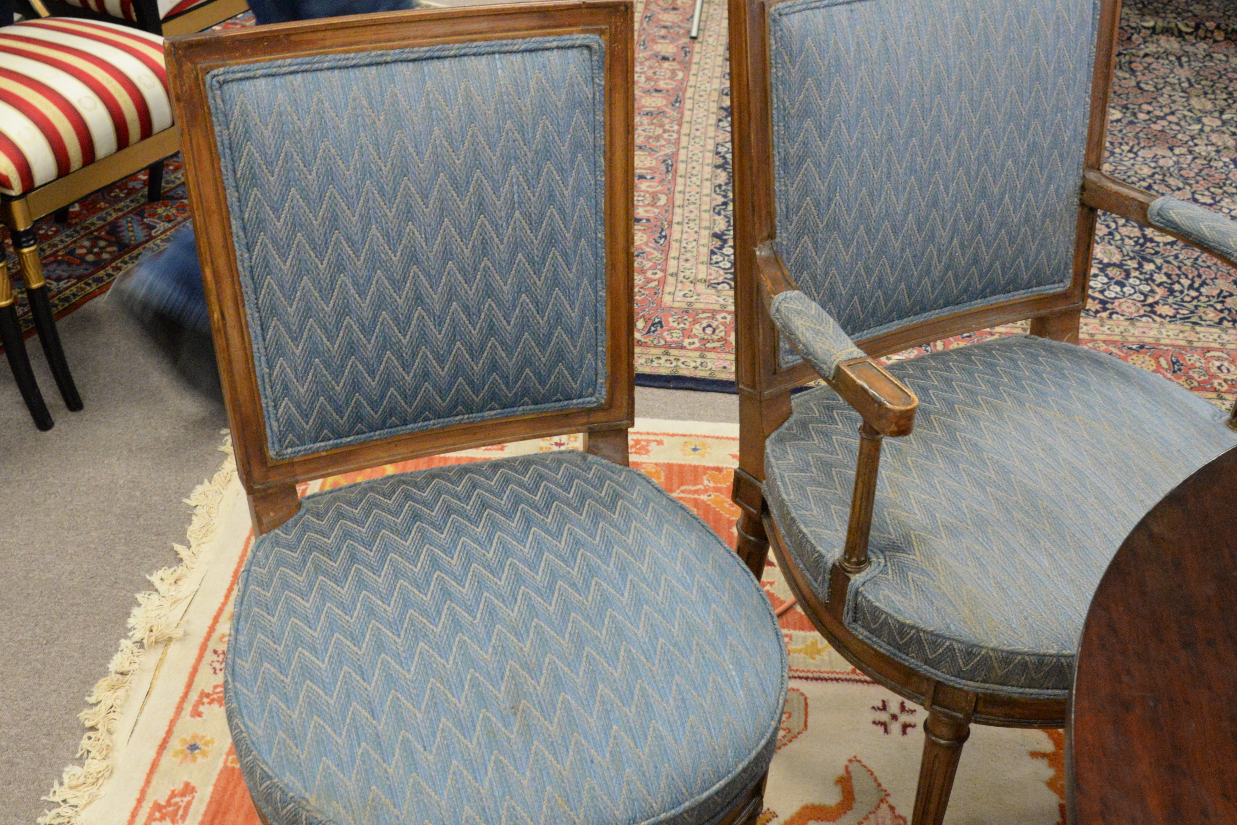 Set Of 12 Louis XVI Style Dining Chairs, with custom upholstery, four arm and eight side, height 36 inches, width 22 inches