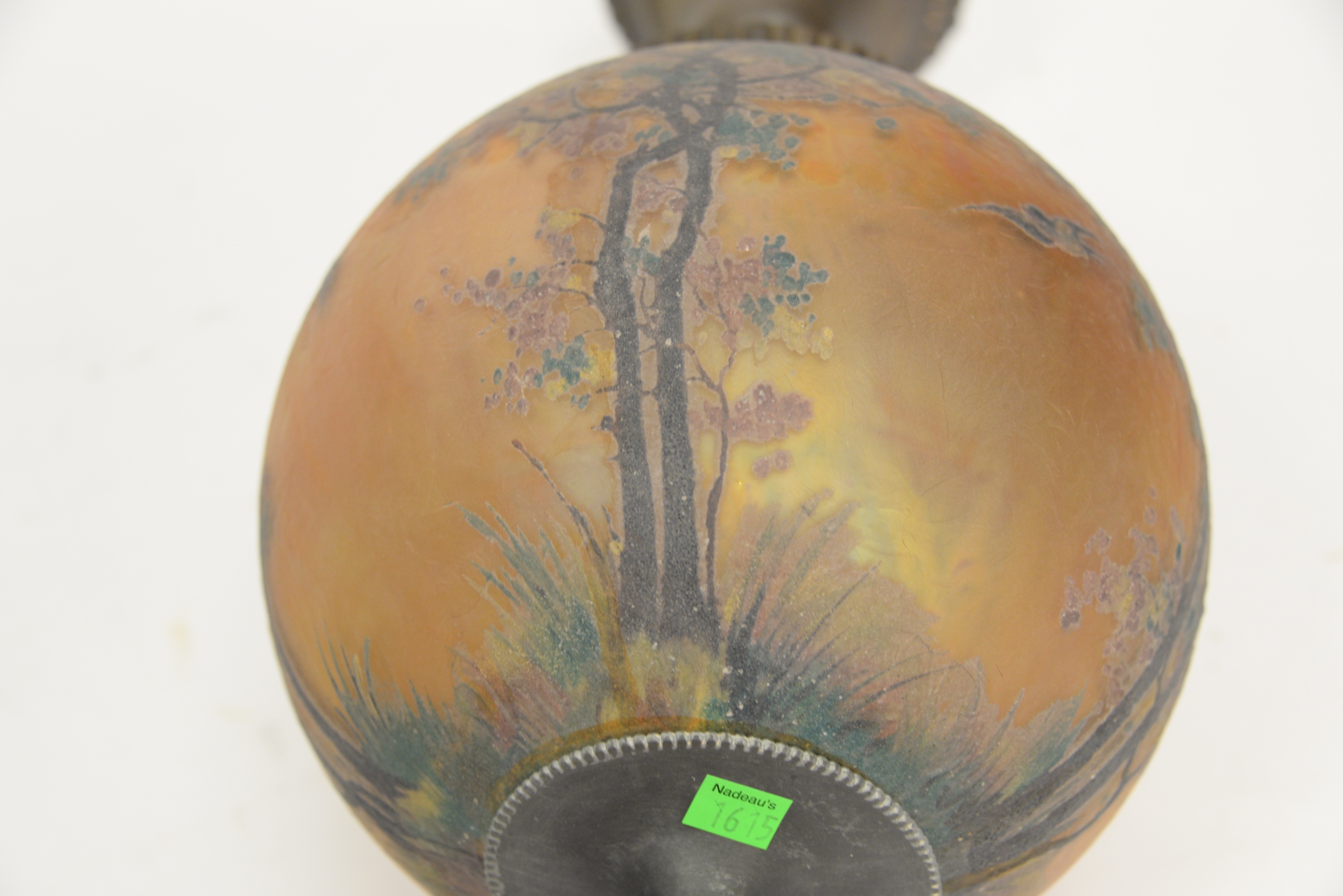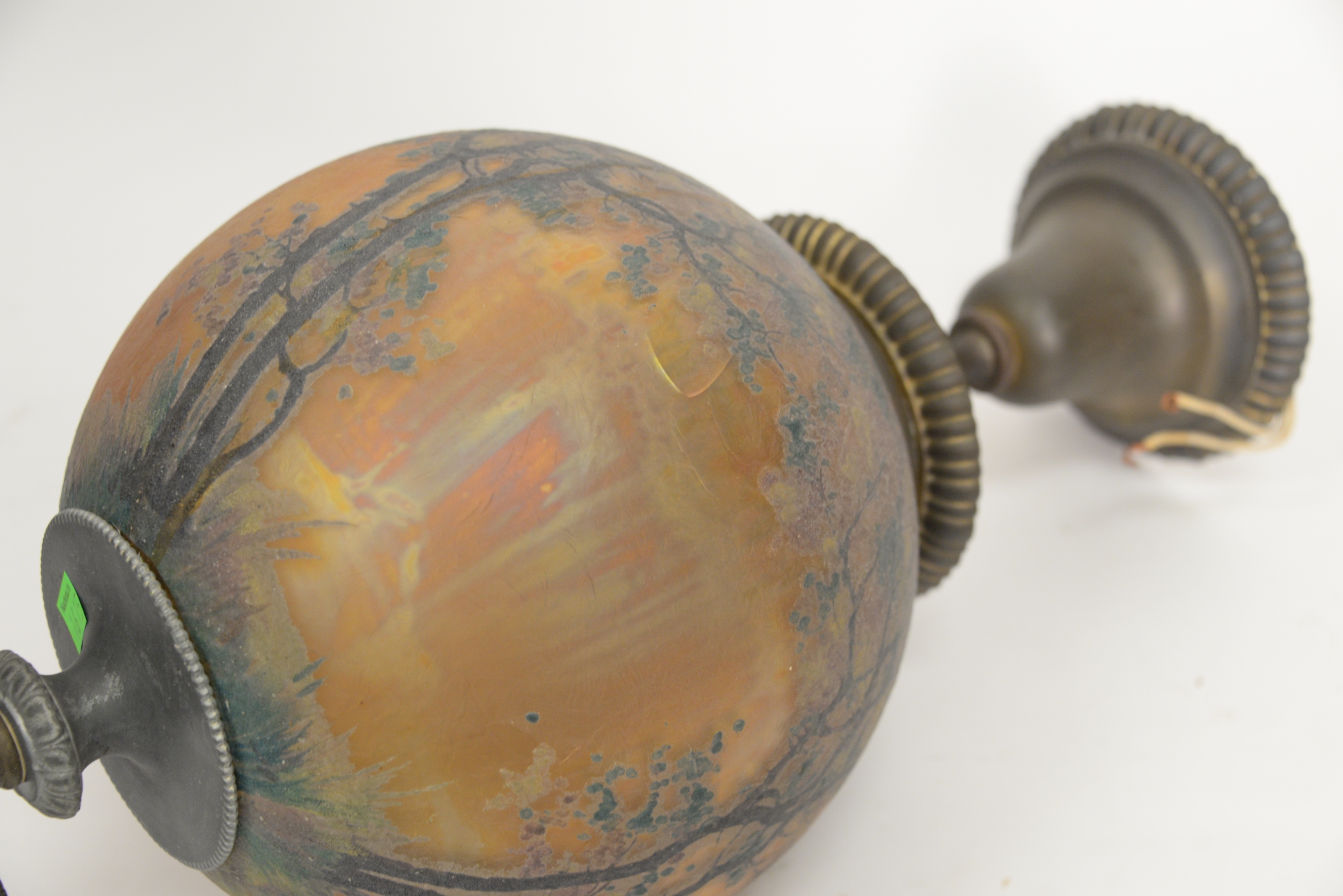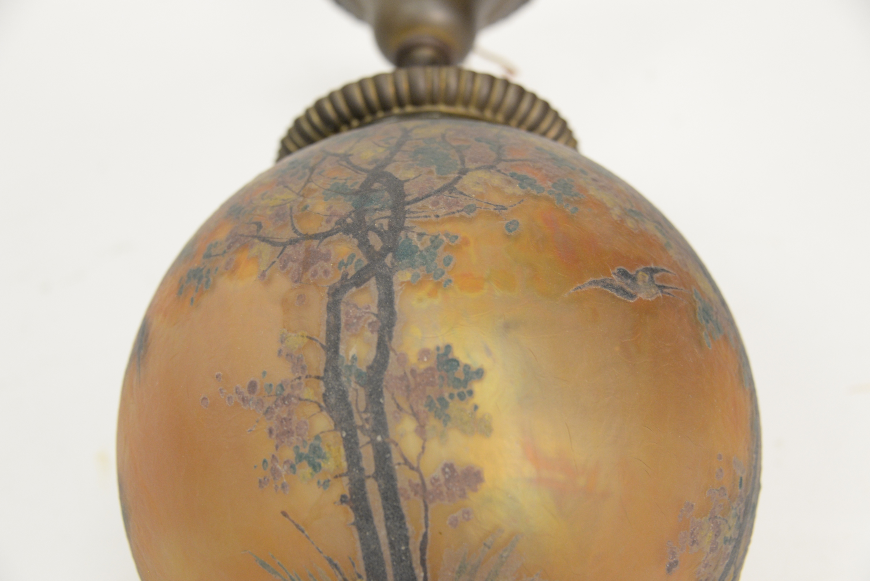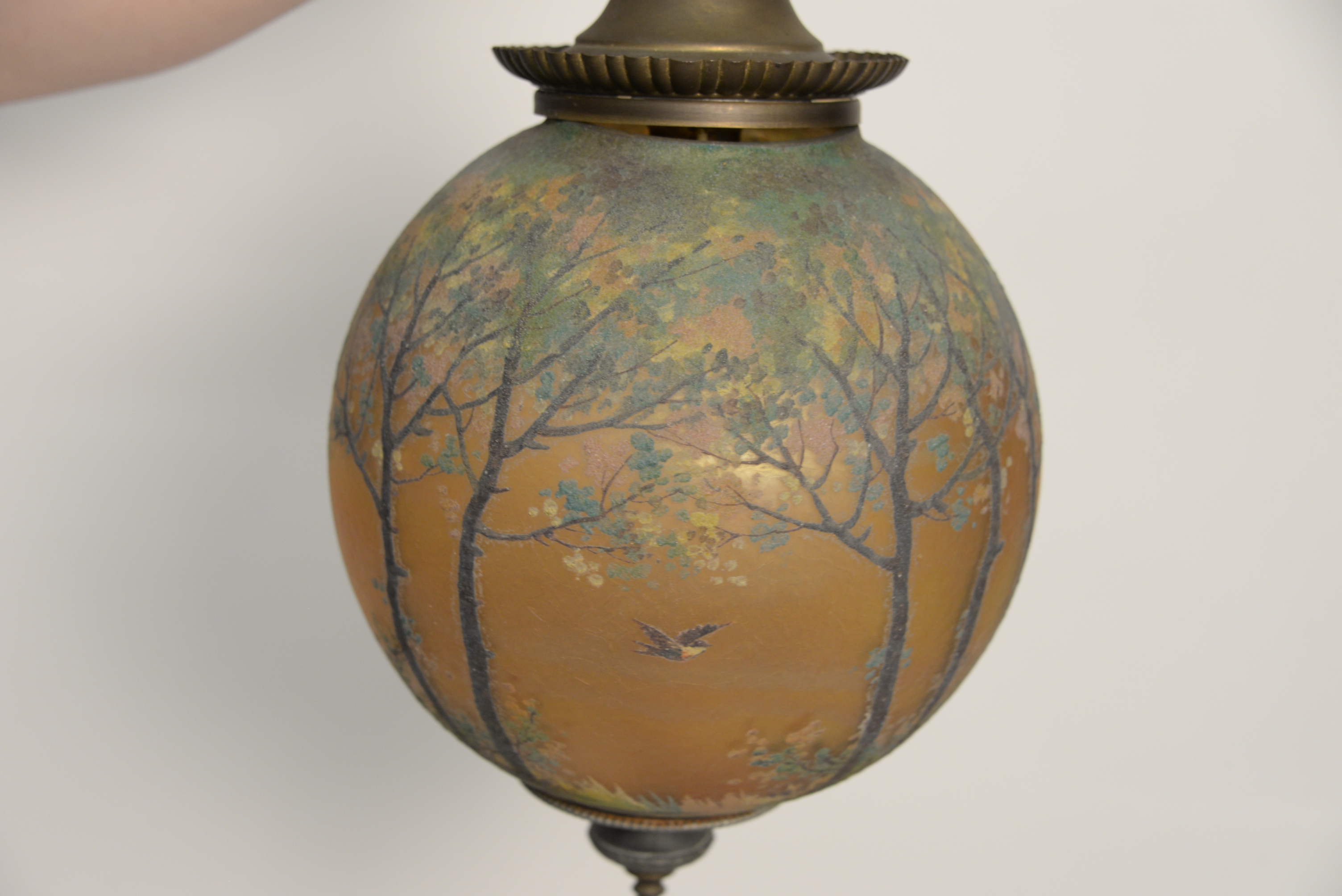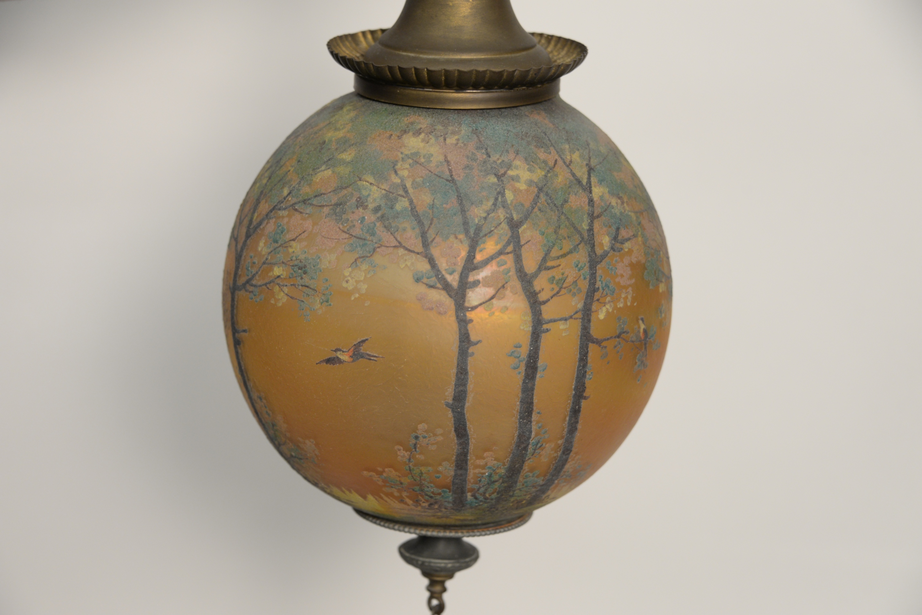 A Pair of Handel Globe Shade Hanging Lamps, having painted birds and trees, along with ceiling mount fixture with tassel base, signed “Handel 6885”, attributed to Gubisch, bottom mount finish worn, one with small heat crack, height with shade 18 1/2 inches.