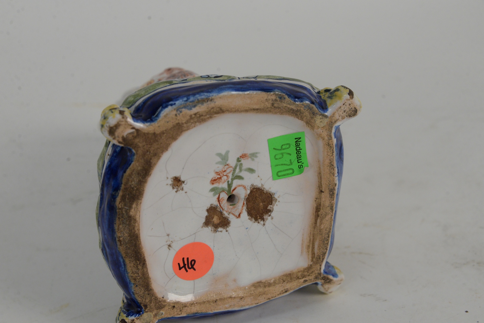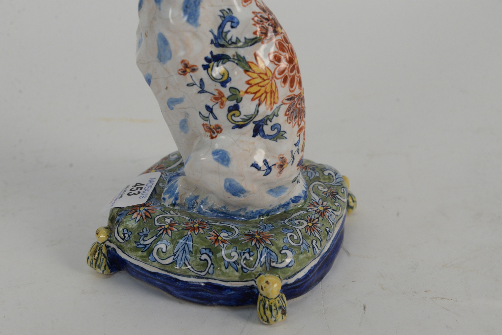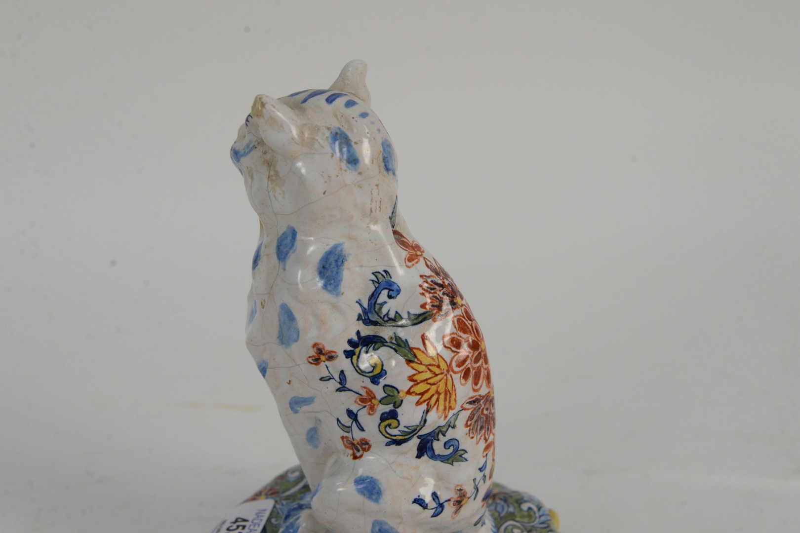 Lot 453: A Polychrome Dutch Delft Cat, seated position on a pillow, height 7 1/2 inches. Provenance: John Walton receipt from 1977. The Estate of Diana Atwood Johnson.