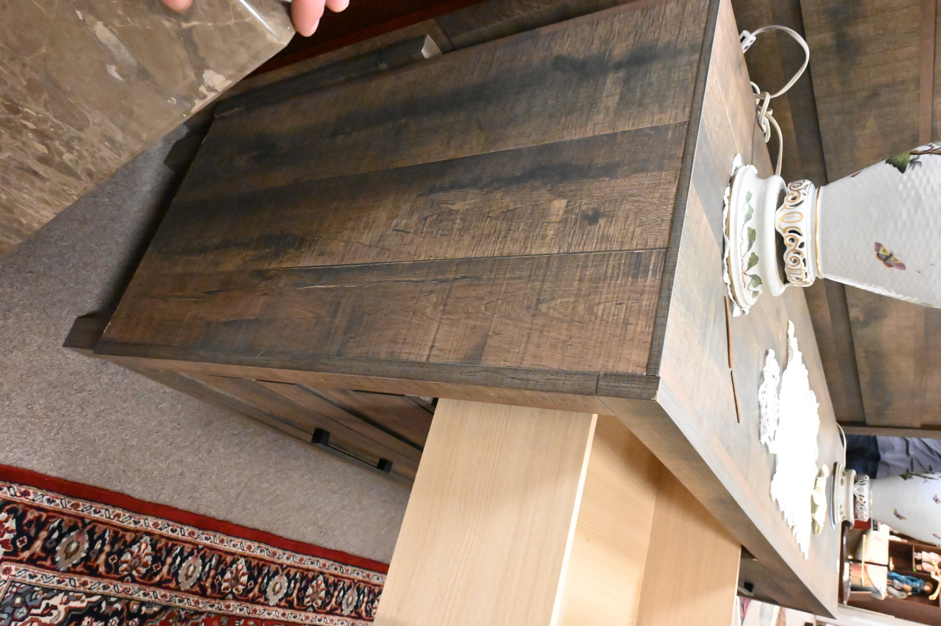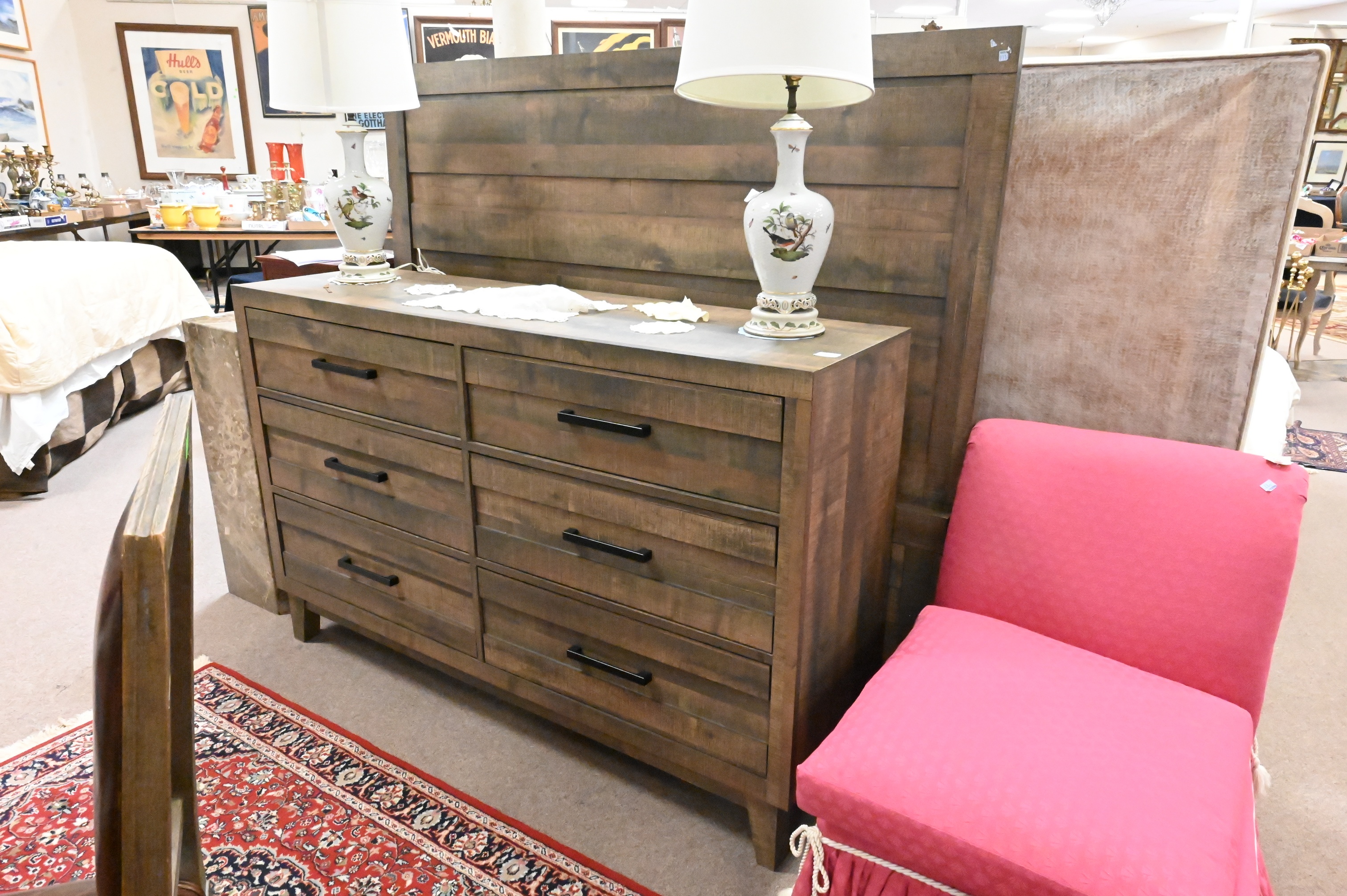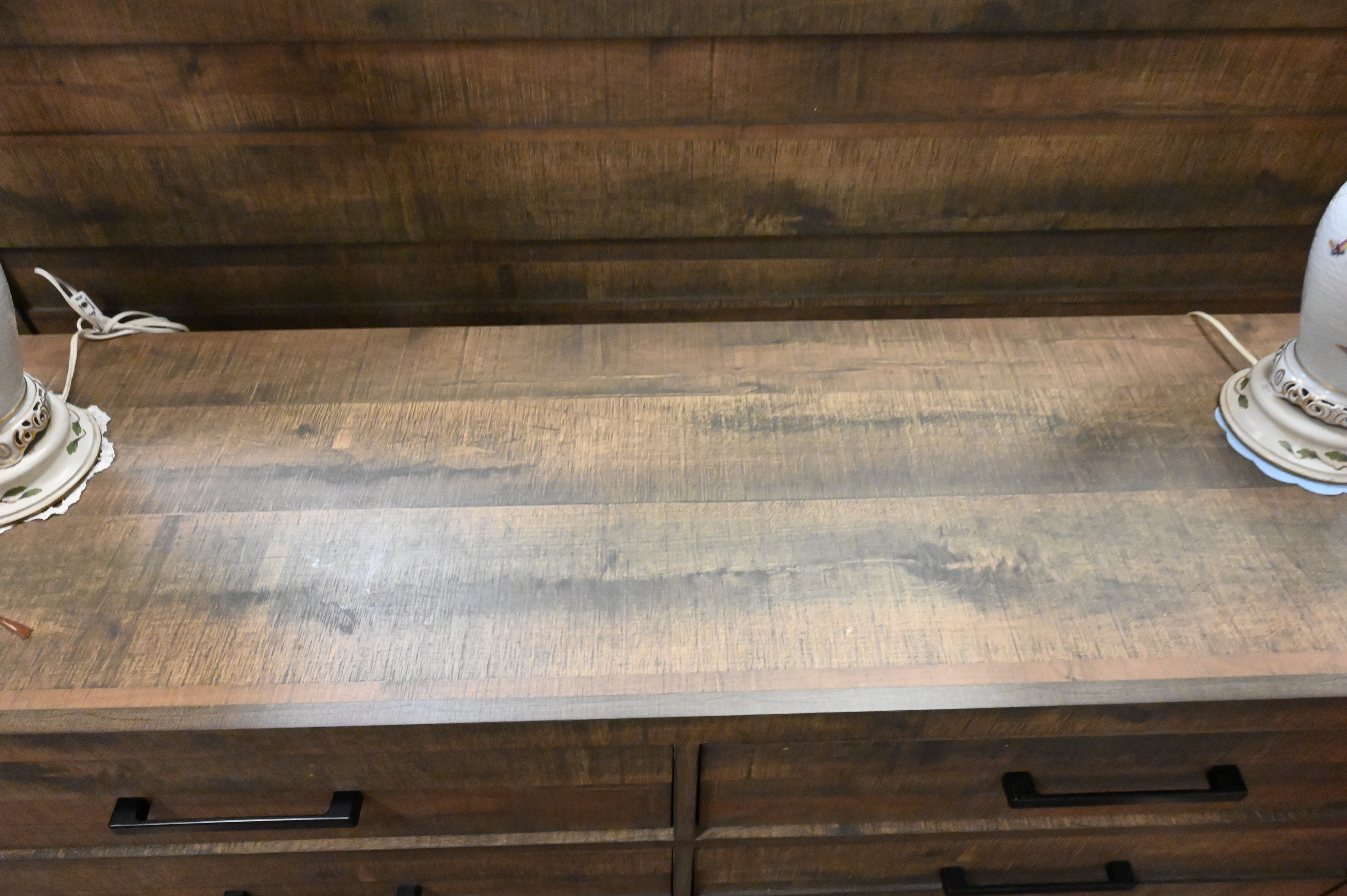 six drawer dresser having black metal hardware