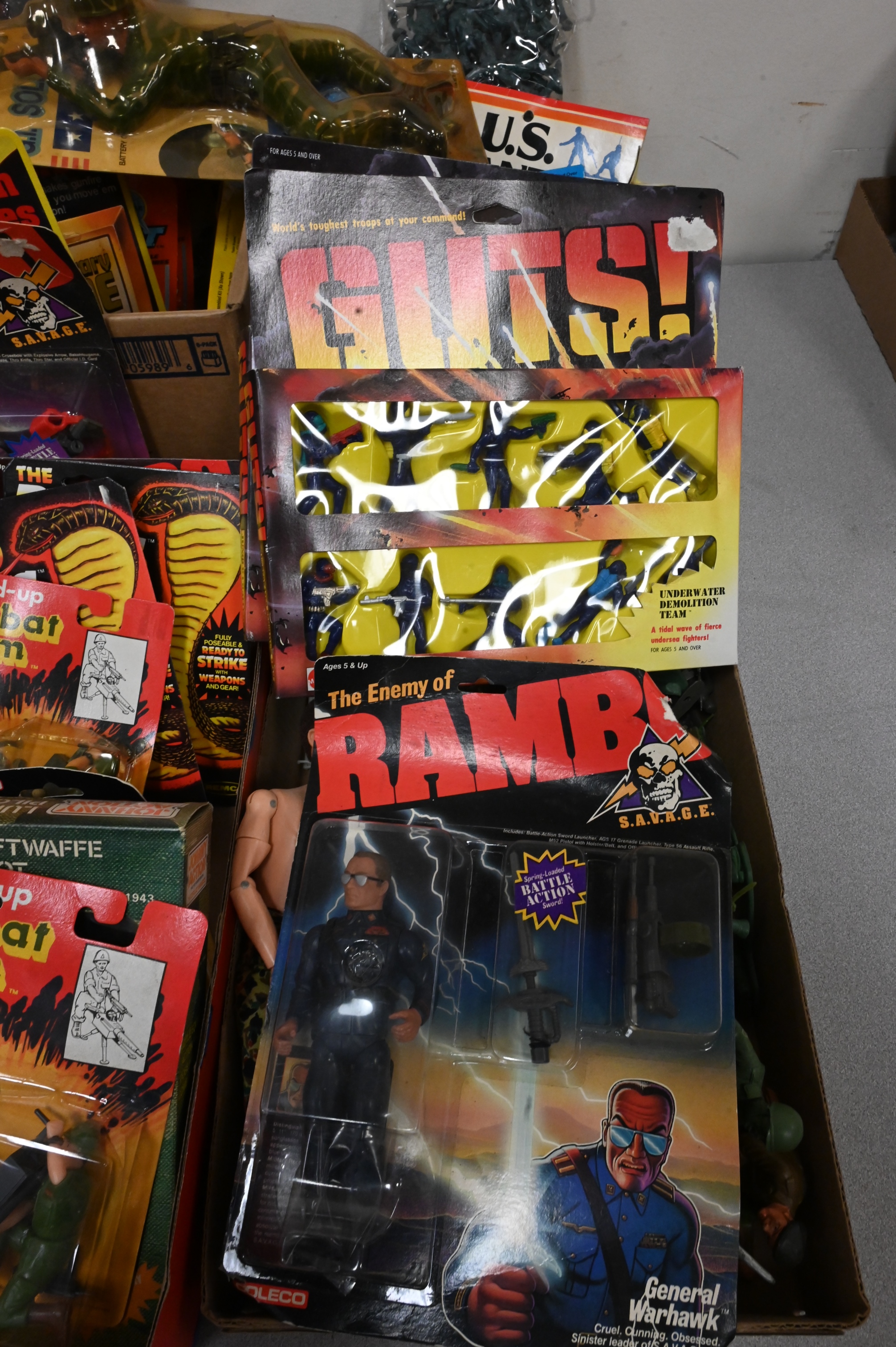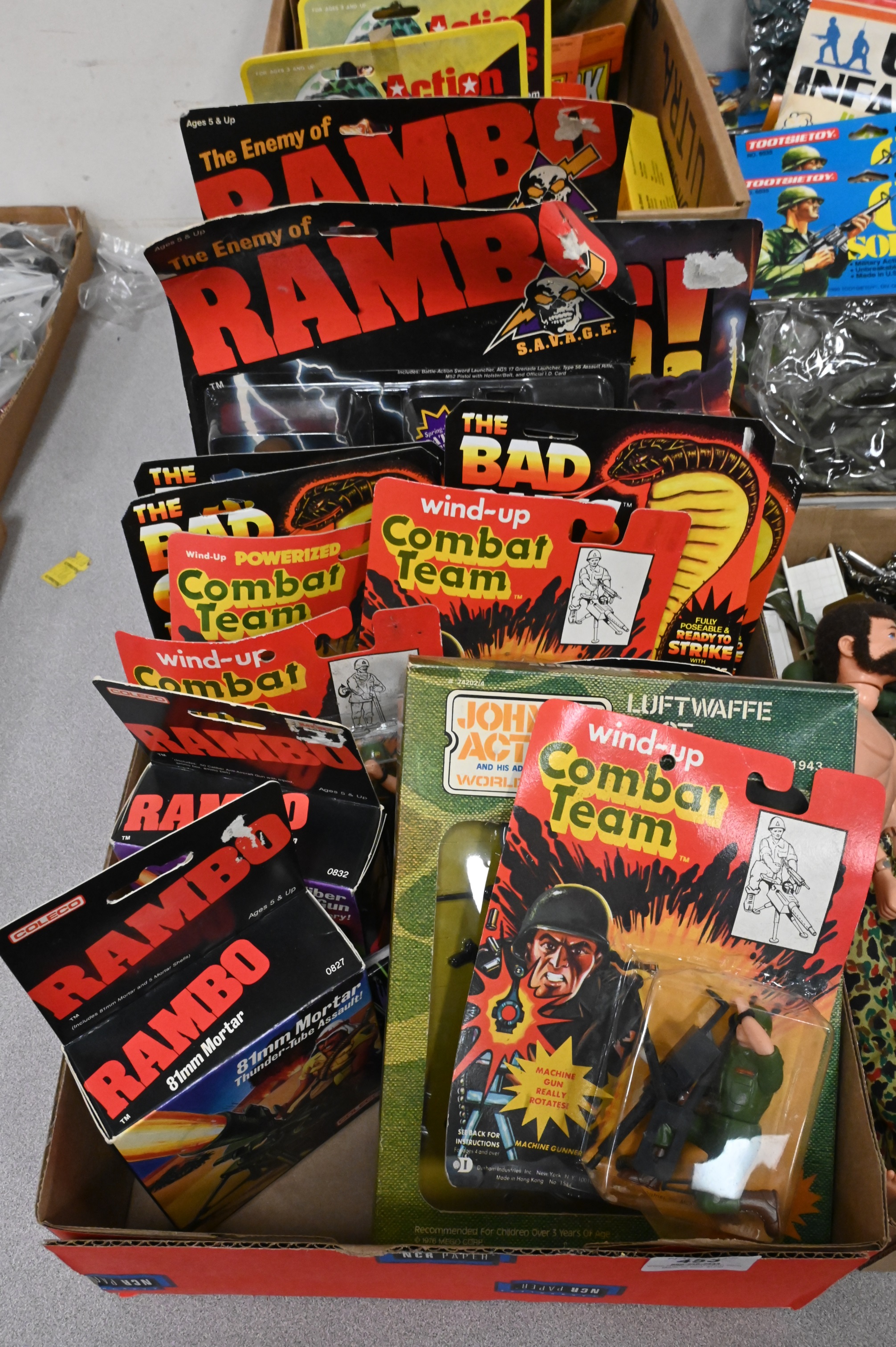 Four Box Lots of Vintage Military Action Figures, to include BIT NYC action heroes, G.I. military action soldiers, Coleco 1985 Rambo action figures “Black Dragon and “General Warhawk”, along with Durham Industries wind-up combat team, in original packaging, including loose figures, (as is).