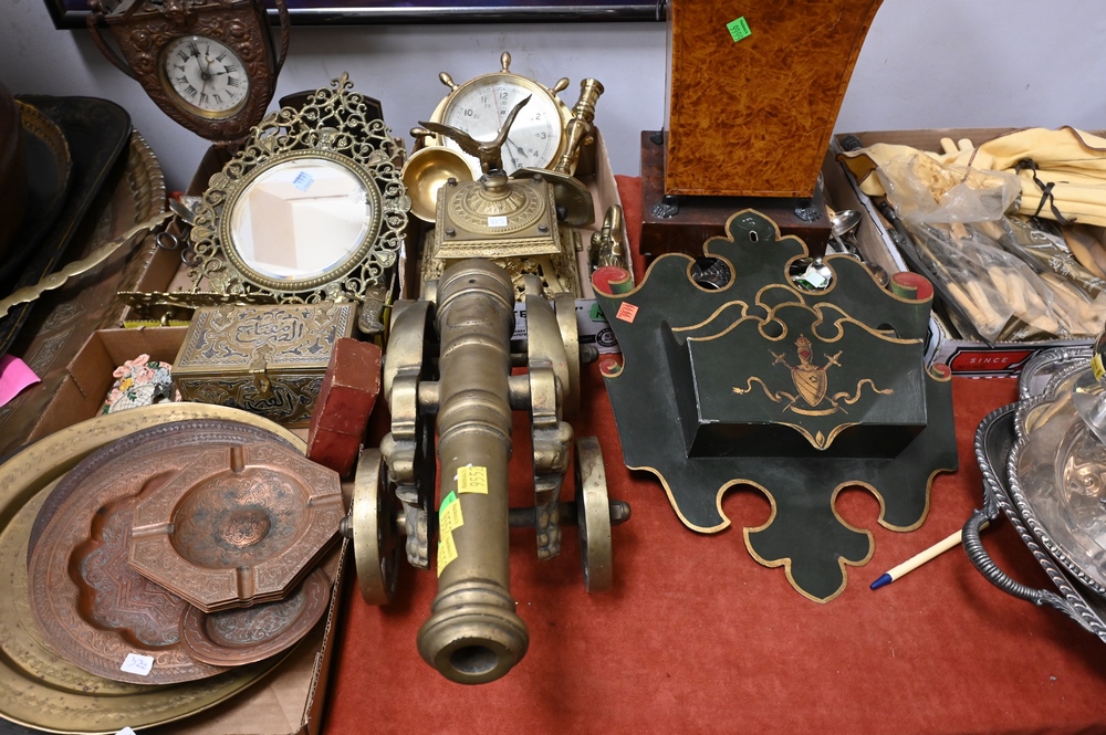 Large Group of Metal Items, to include copper coal hod, brass trivet, brass bucket, iron napoleon figure, middle eastern trays and plates, victorian brass mirror, heavy brass dragon canon, etc.