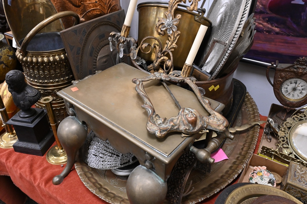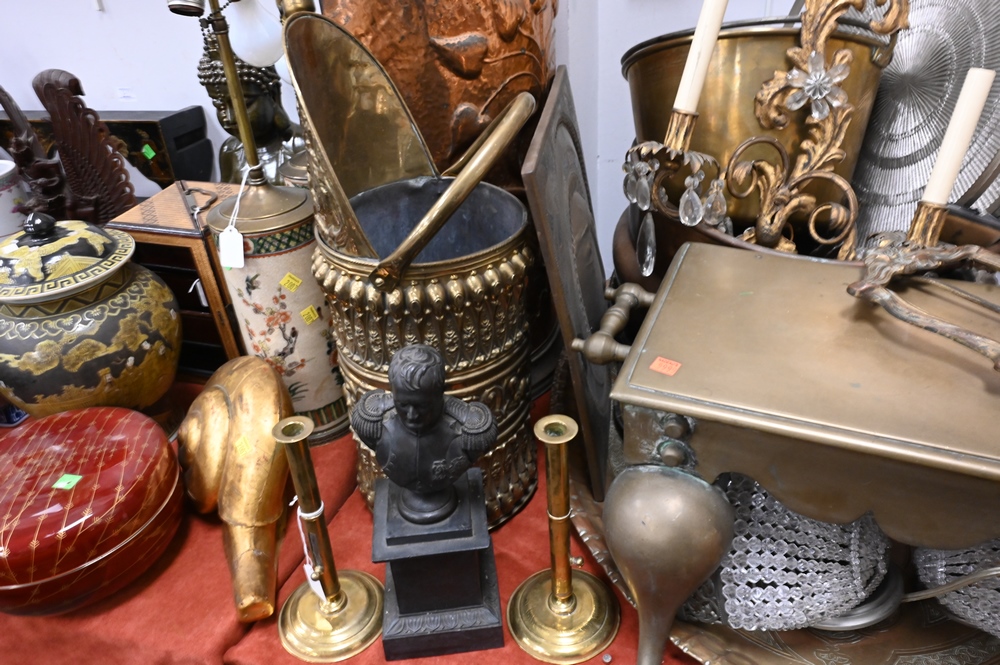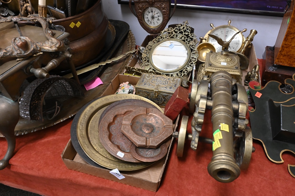 Lot 453: Large Group of Metal Items, to include copper coal hod, brass trivet, brass bucket, iron napoleon figure, middle eastern trays and plates, victorian brass mirror, heavy brass dragon canon, etc.