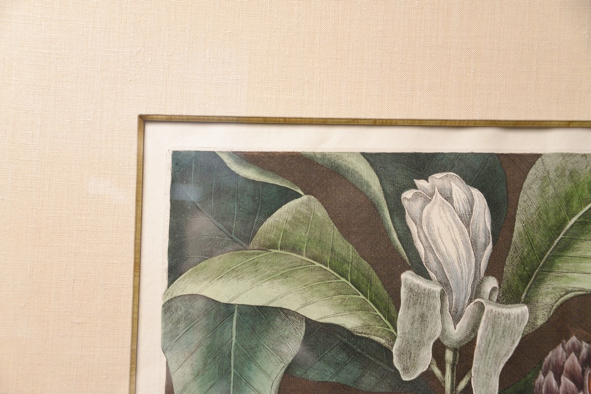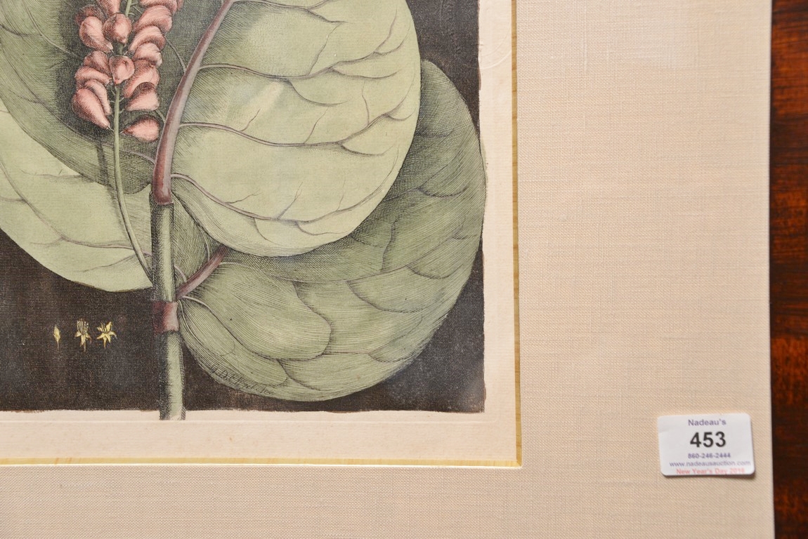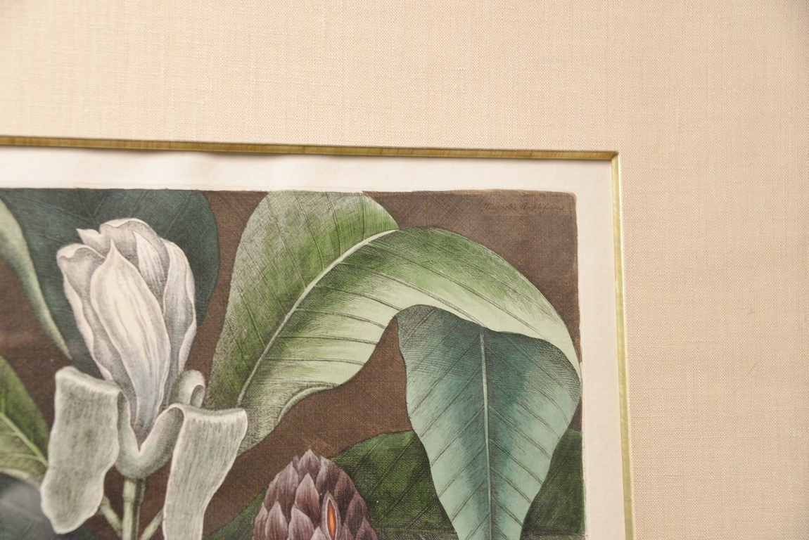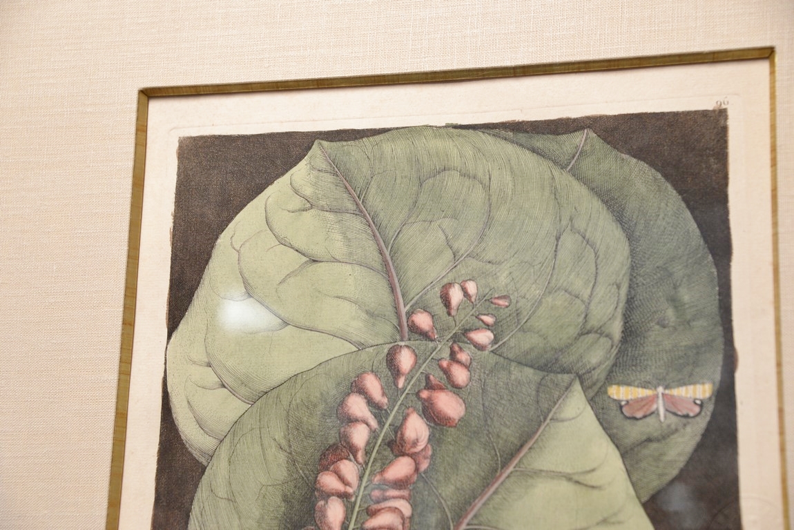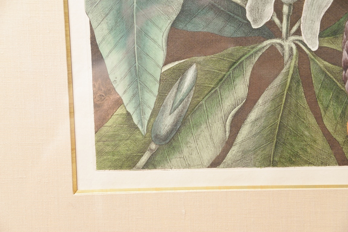 Mark Catesby 1679-1749 pair of hand colored copper plate engravings The Umbrella Tree, Magnolia, Ampliffimo Flore Albo Plate #80 and The Night Butterfly Phalaena Caroliniana The Mangrove Grape Tree Plate #96 From The Natural History of Carolina, Florida and the Bahama Islands framed by W. Graham Arader III sight size: 11 1/2 x 15 and 15 3/4 x 10 3/4 Provenance: Property from Credit Suisse’s Americana Collection