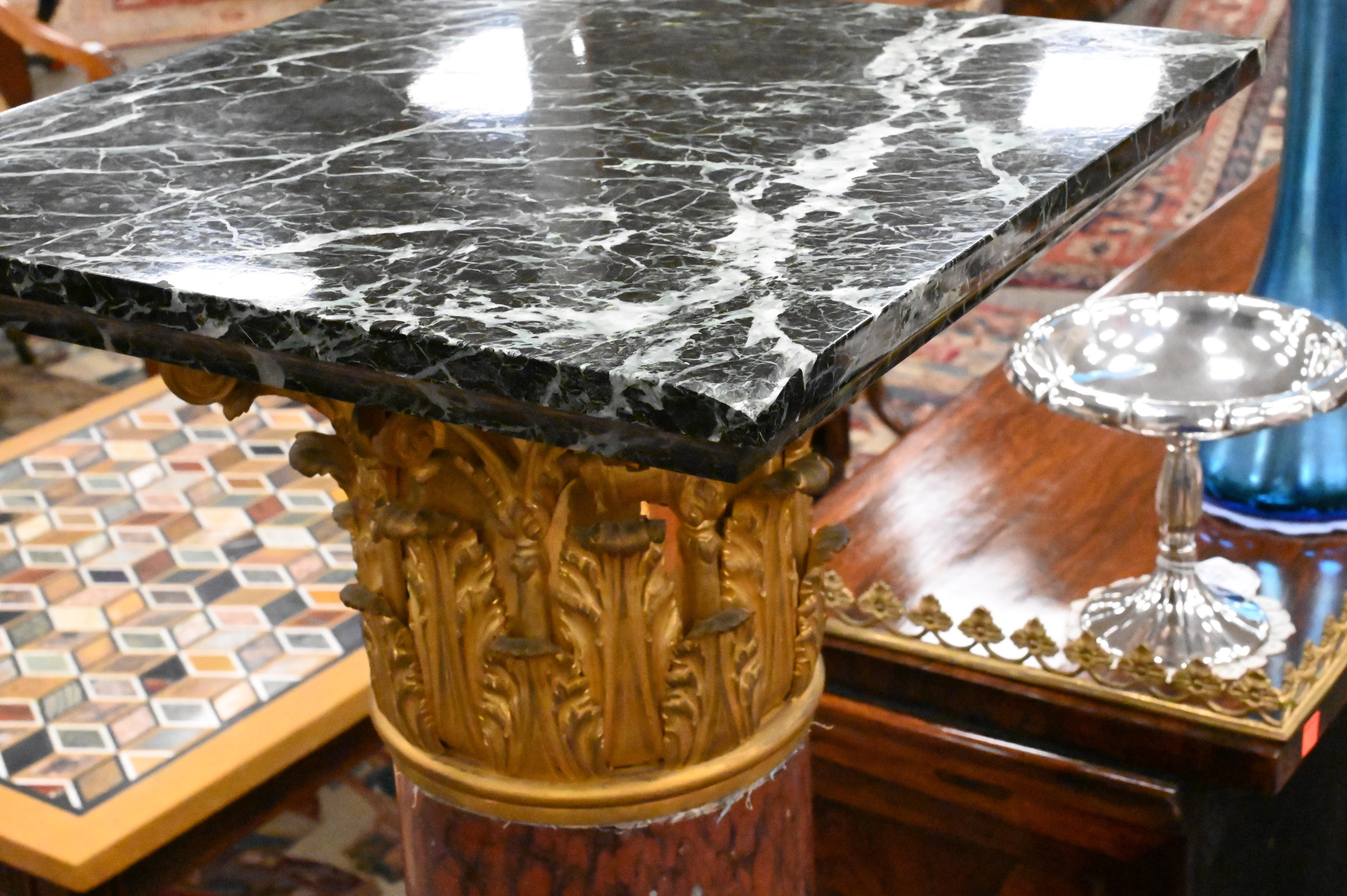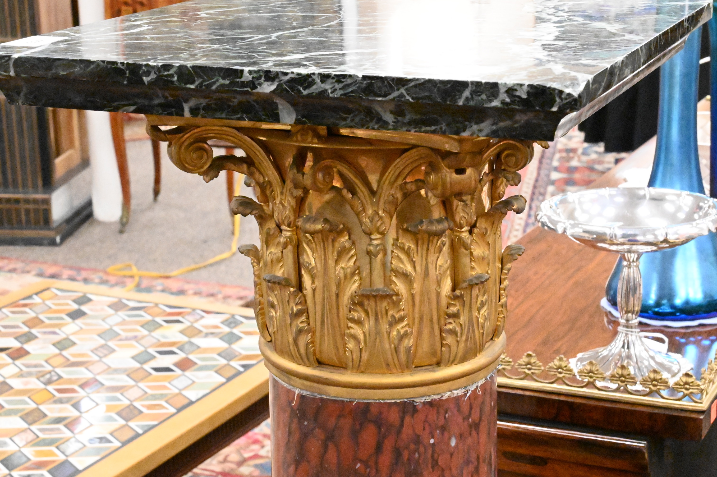 having green/black top over gilt bronze Corinthian, circular rouge marble stem on green and black square granite base