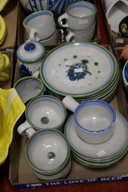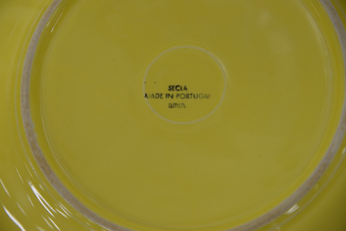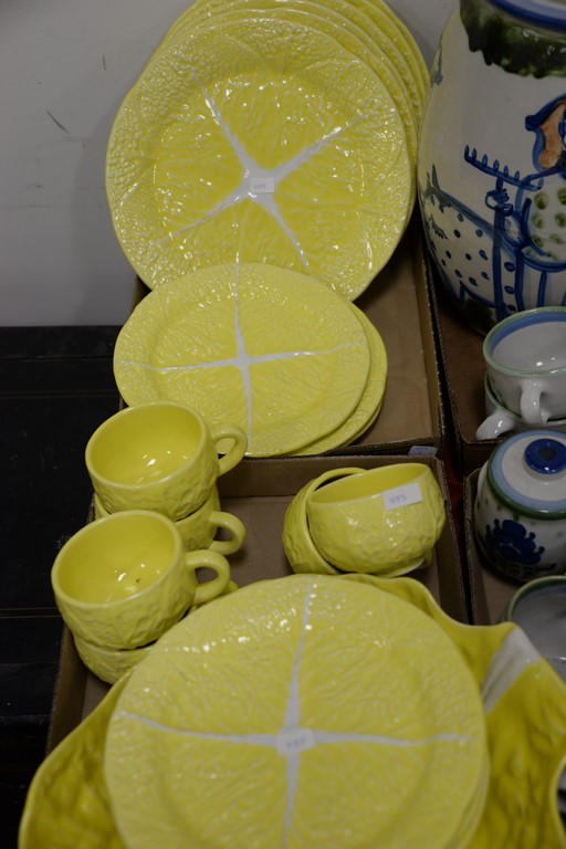 Lot 453: Partial set of Secla Portugal yellow cabbage leaf dinner service and M.A. Hadley hand painted pottery cups, plates, saucers, and jug…