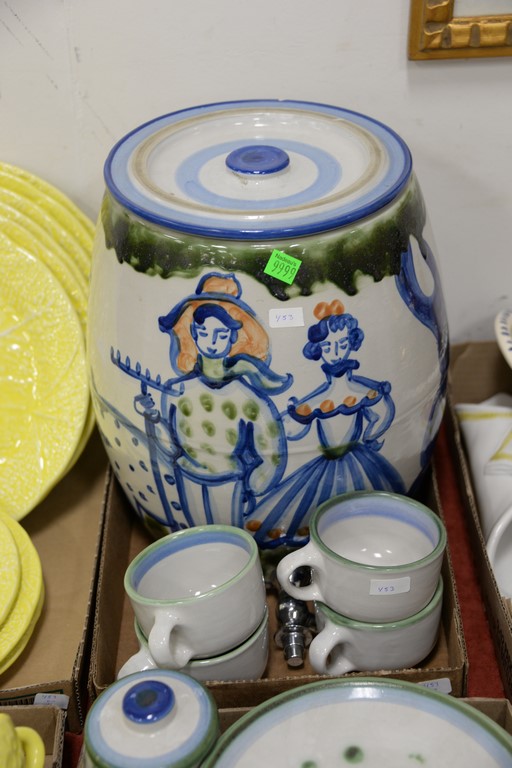 Partial set of Secla Portugal yellow cabbage leaf dinner service and M.A. Hadley hand painted pottery cups, plates, saucers, and jug with spigot.