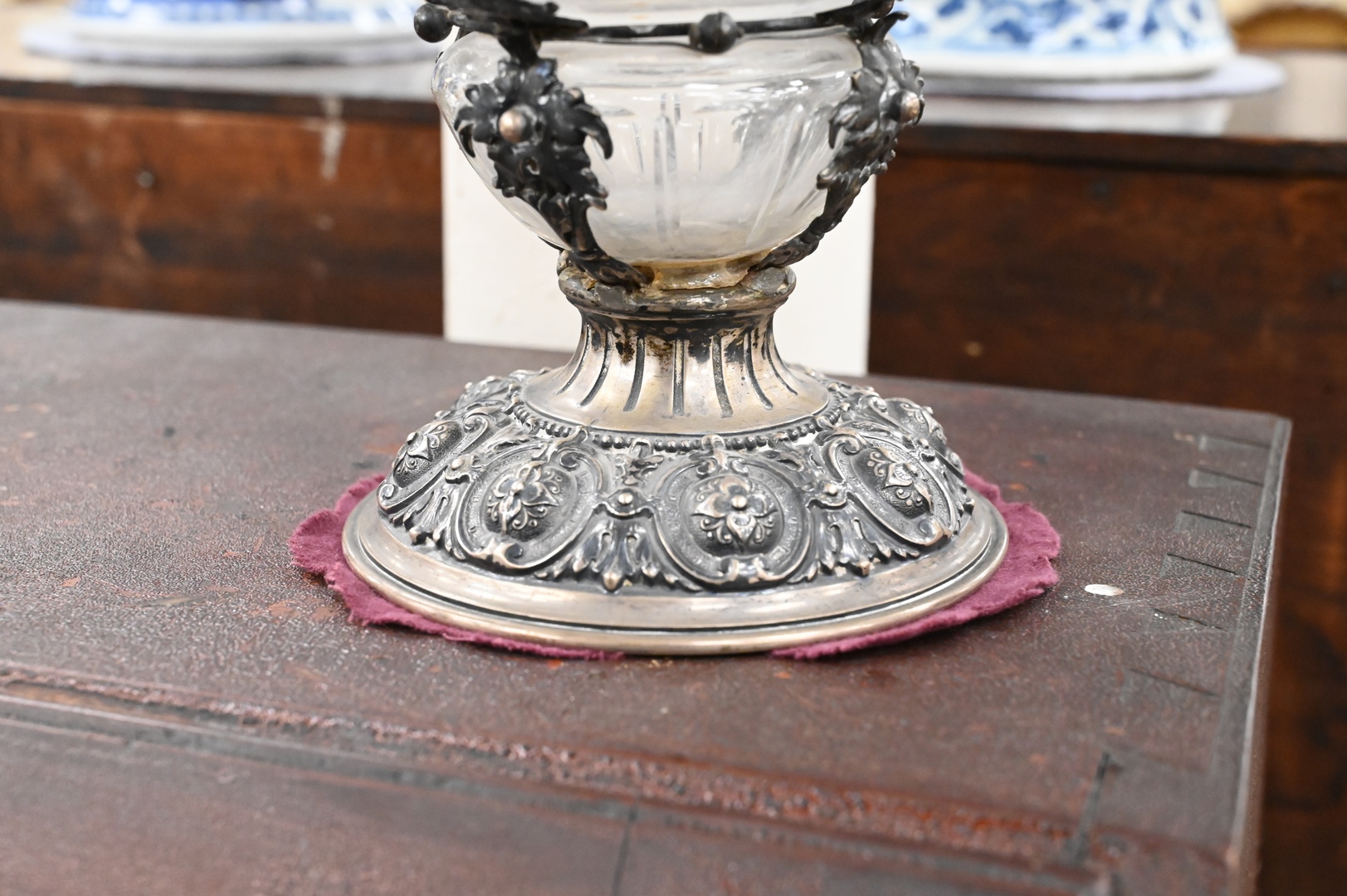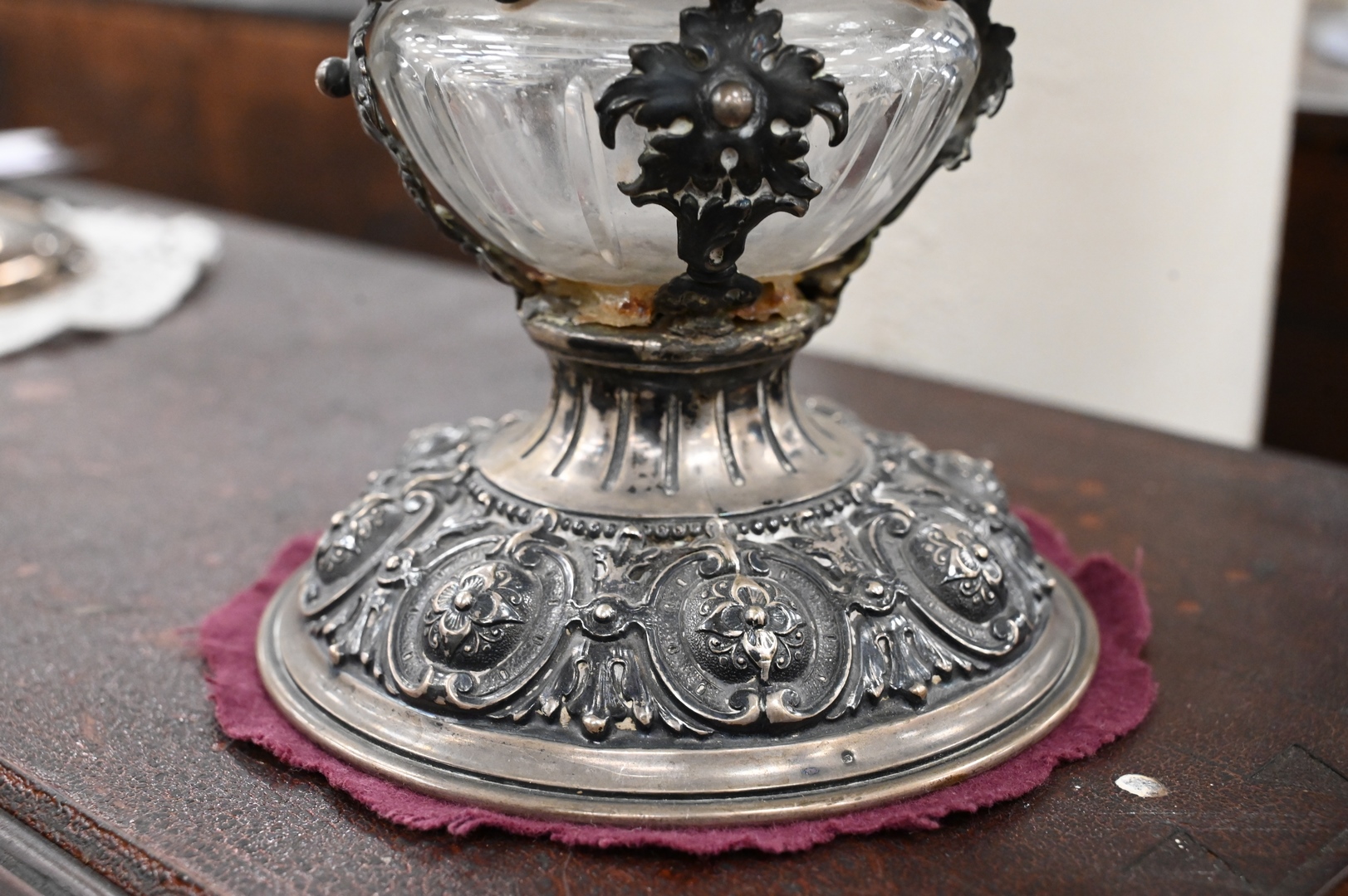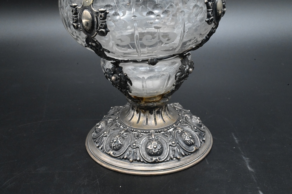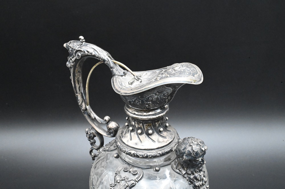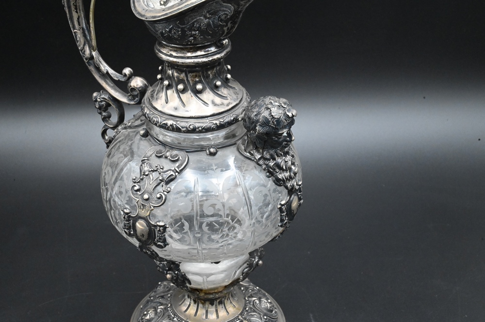 Lot 454: Continental Silver and Frosted Crystal Claret Jug, having bird head handle and north wind face on front, (as is) on base reglued and resoldered, height 12 3/4 inches.