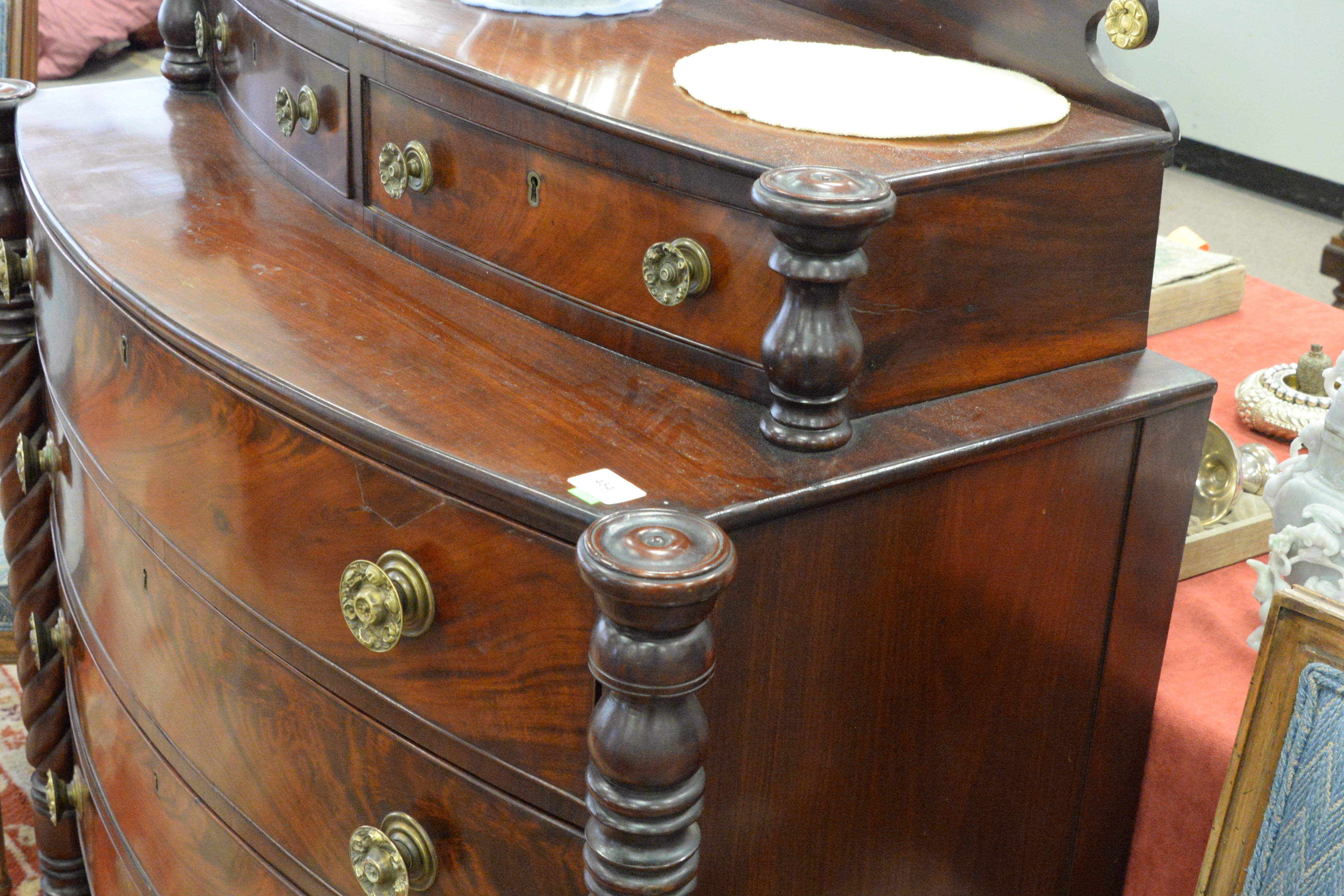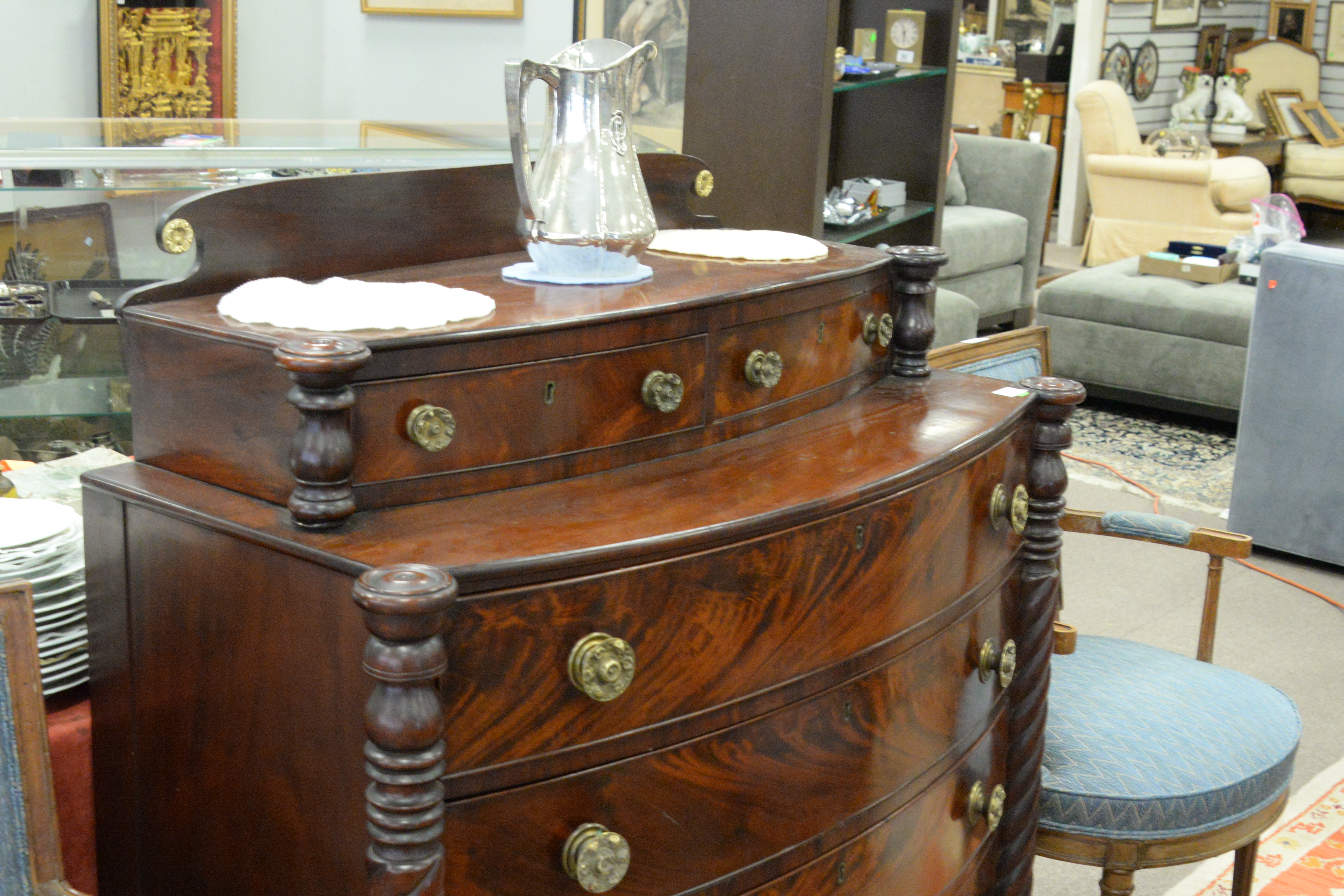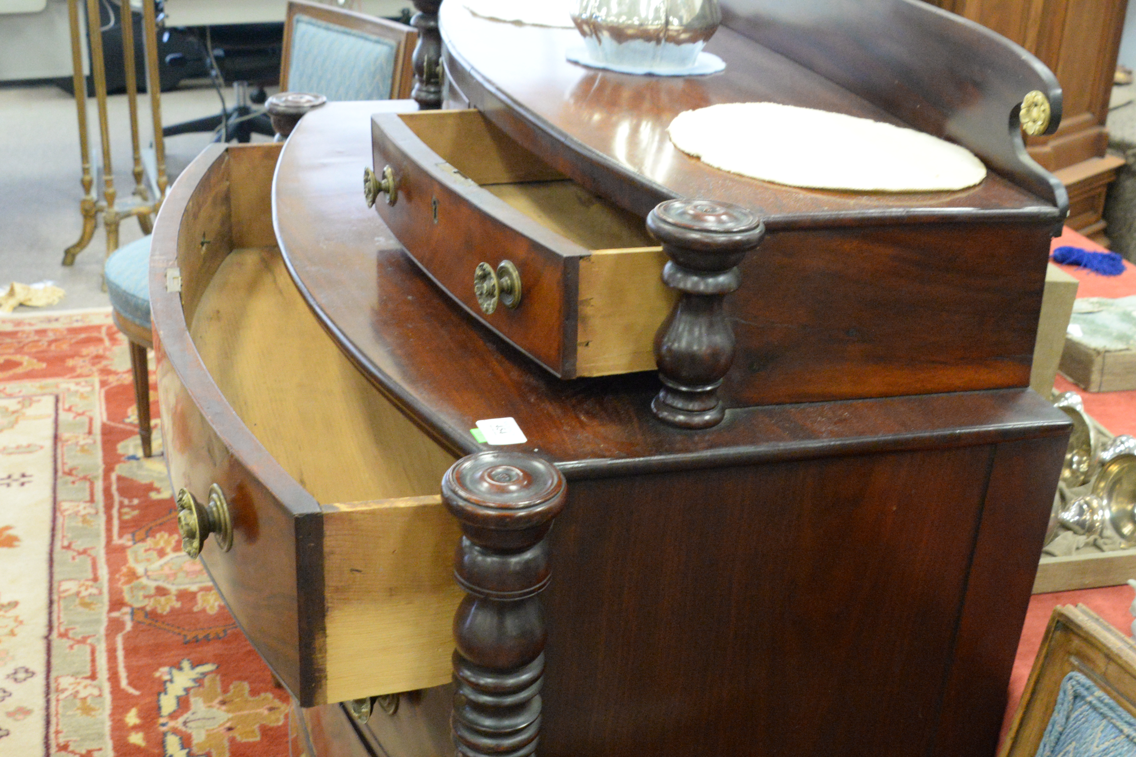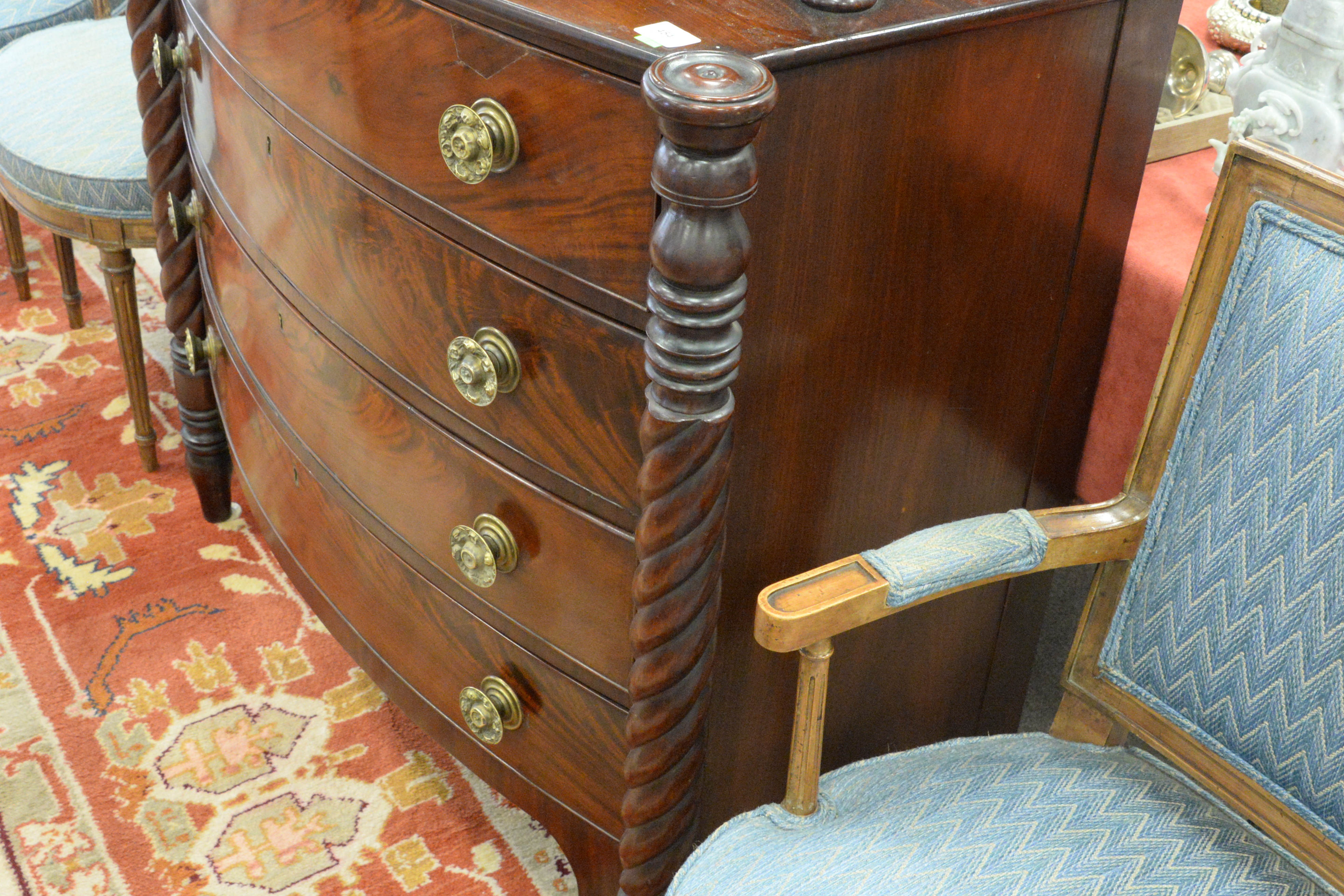 Federal Mahogany Bowed Front Chest, with turret corners and turned legs, circa 1830, length 48 inches, width 43 inches
