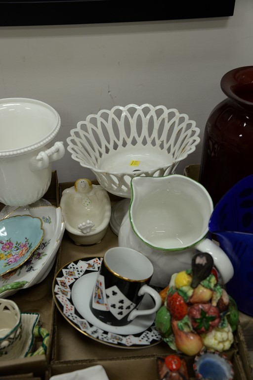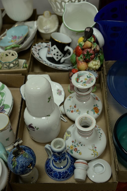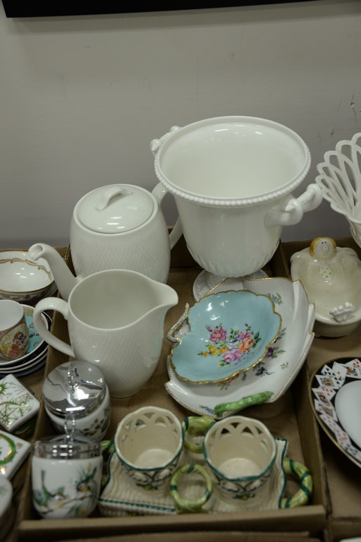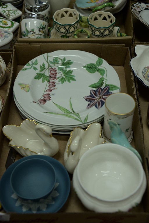 Four box lots to include Tiffany & Co. pitcher, porcelain compote, Wedgwood plate, French cologne bottle, Minton sugar, Royal Worcester urn, jam jars, Royal Copenhagen teapot and pitcher.