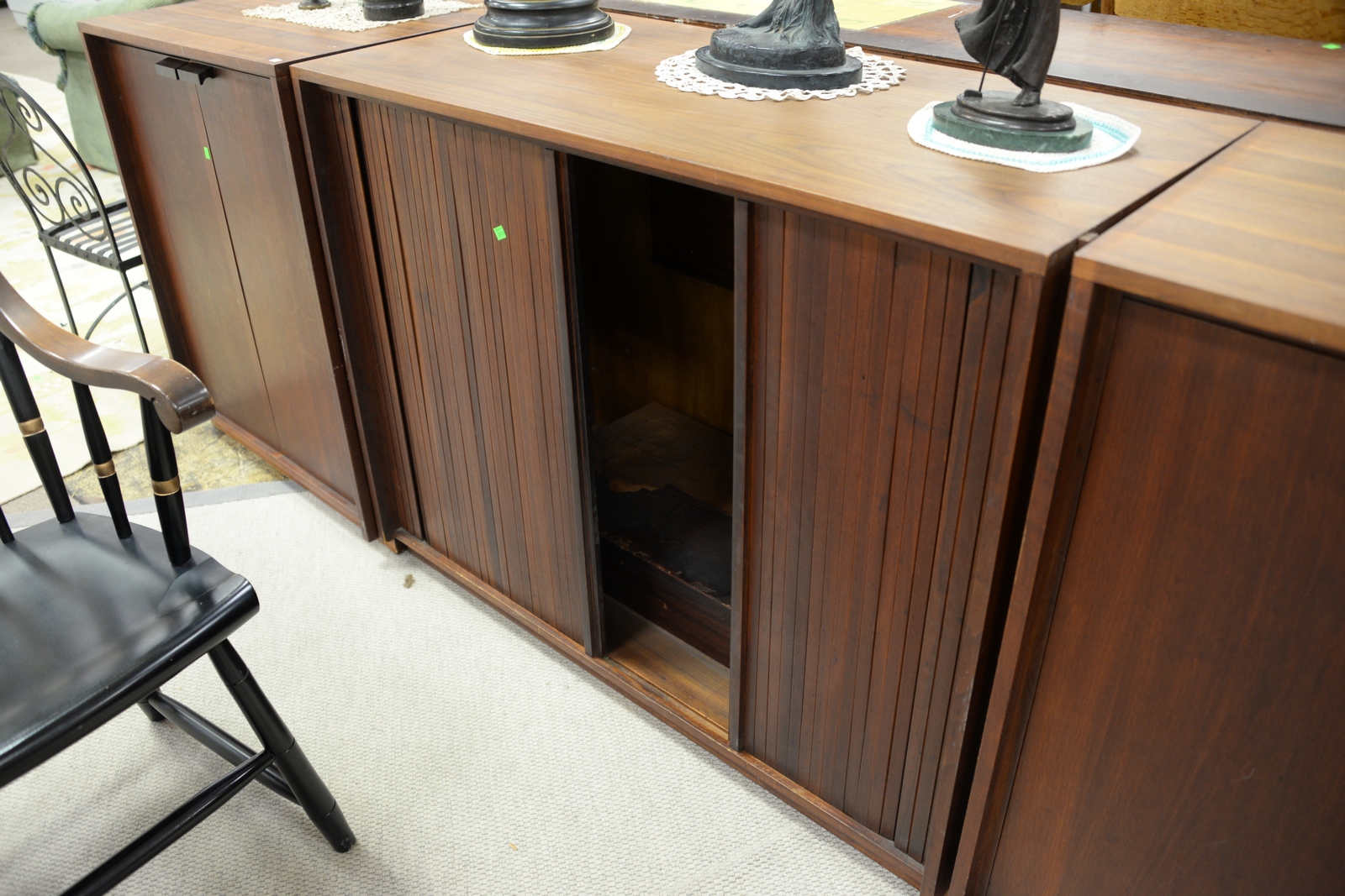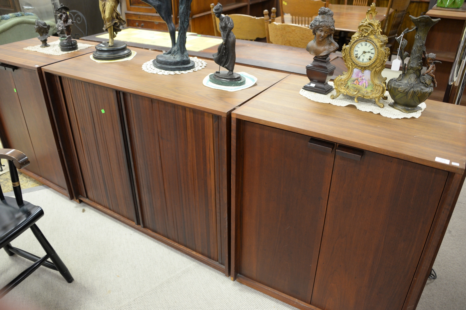 Lot 454: Four piece lot to include three Danish modern cabinets, one with tambour doors ht. 36in., wd. 46in. and a credenza as is>