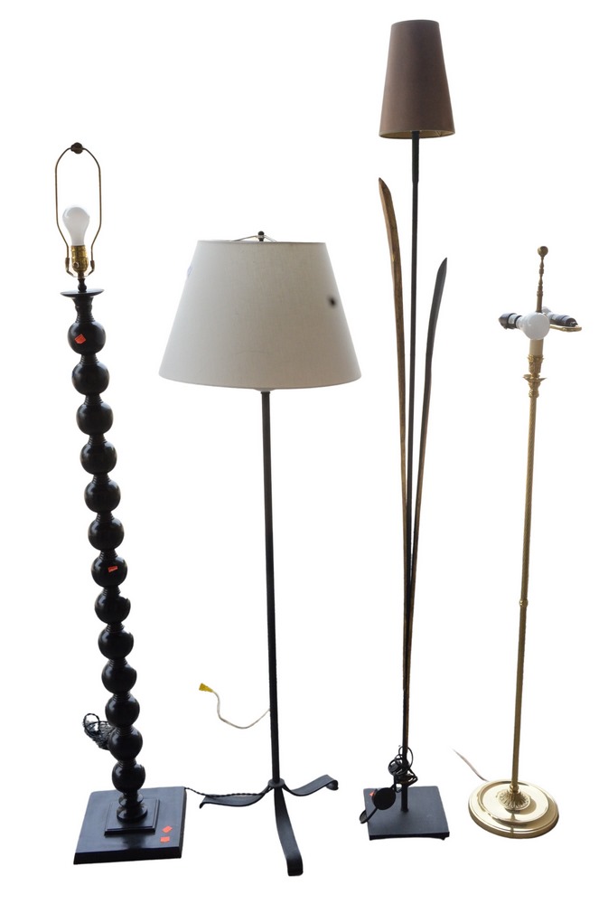 Lot 454: Group of Four Floor Lamps, to include one contemporary reed form, one brass, one having a tri pedestal base, along with one contempo…