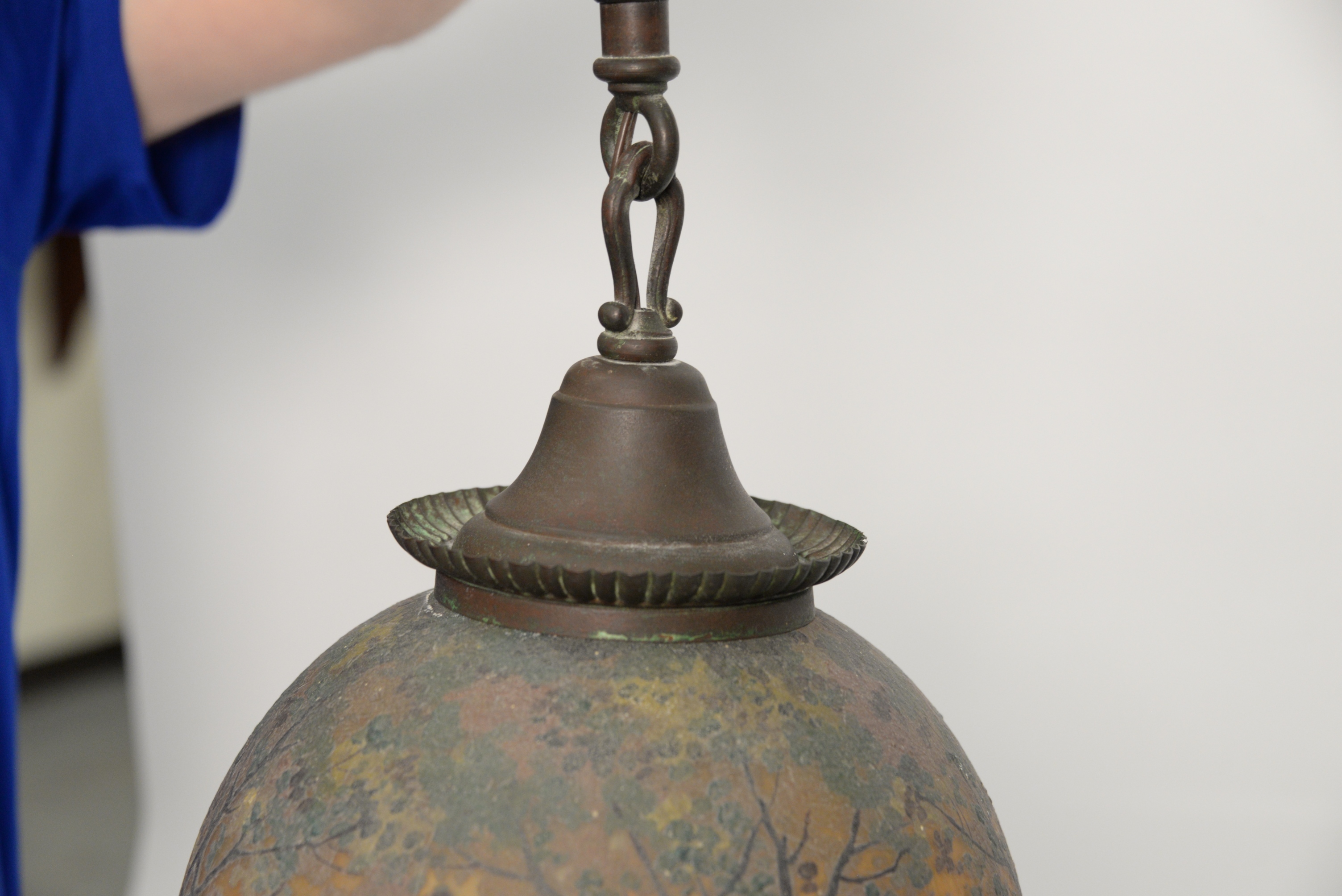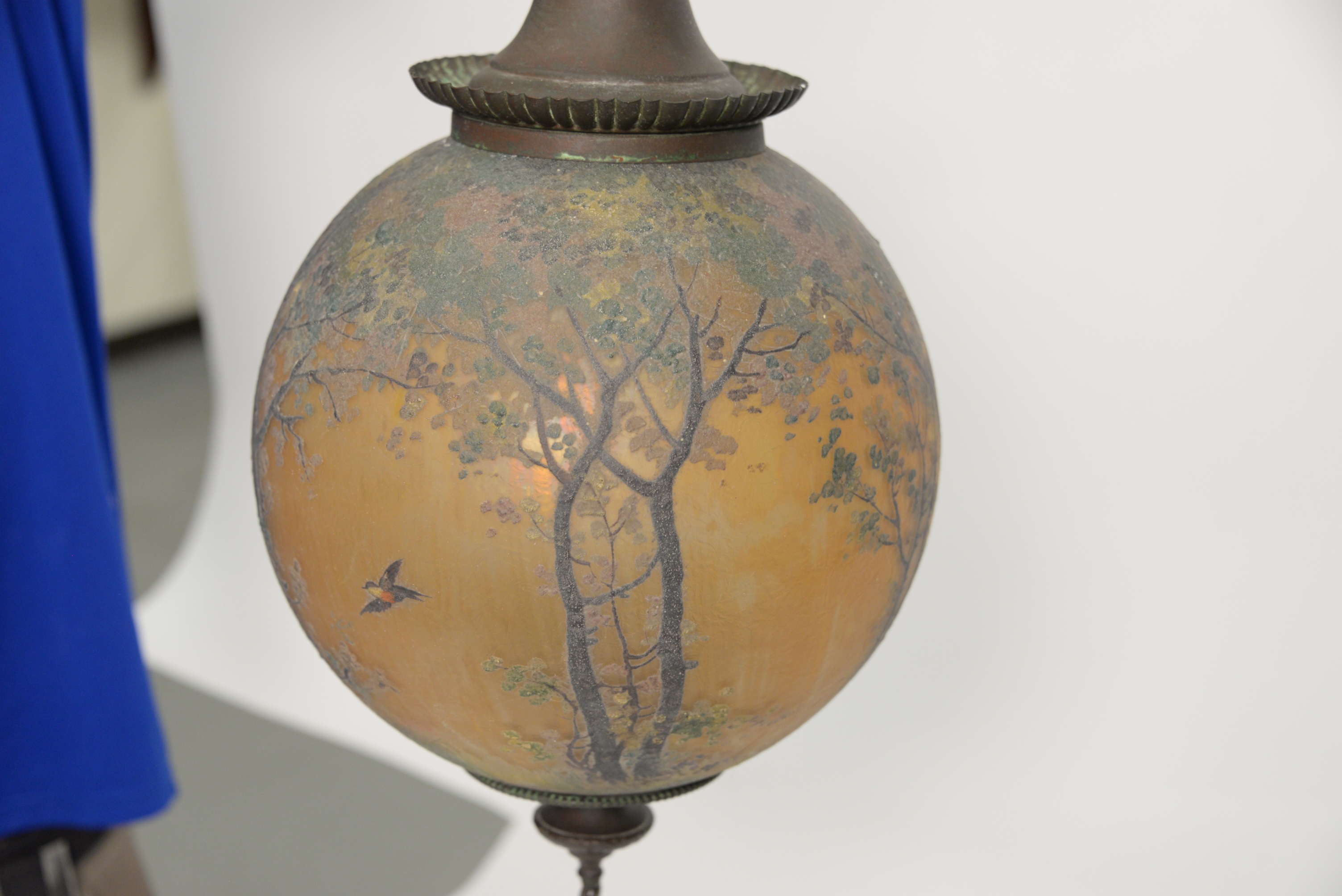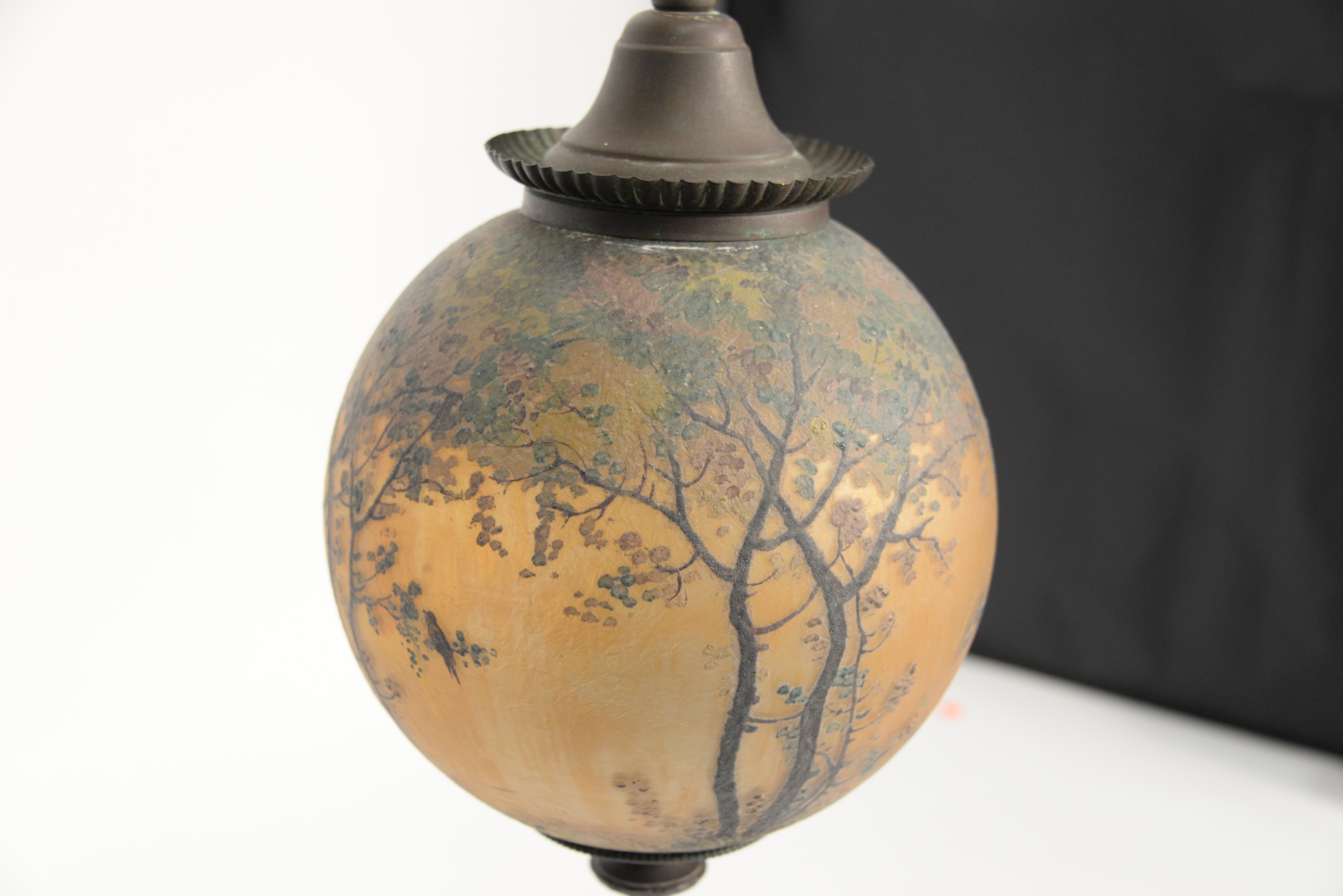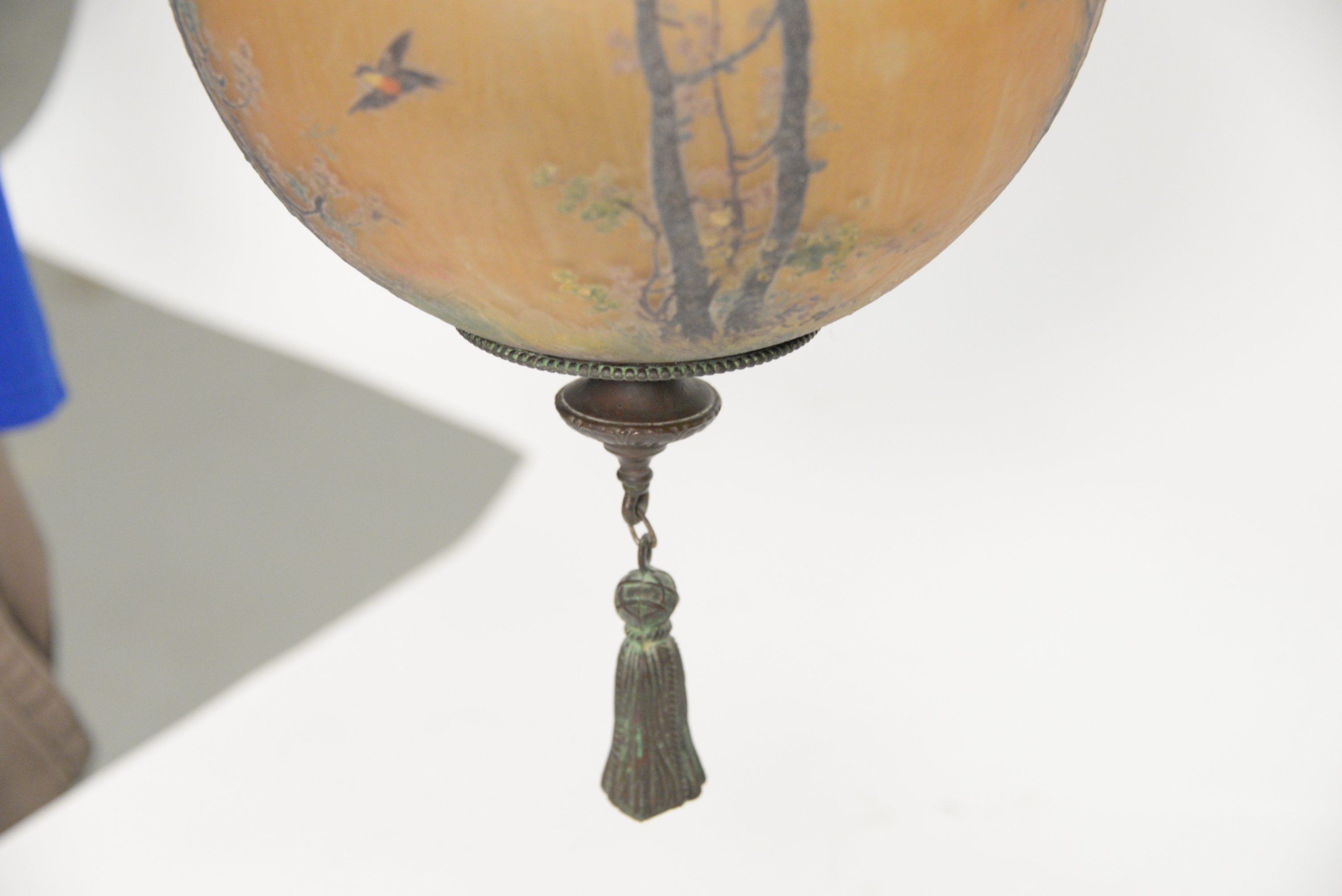 Handel Globe Shade Hanging Lamp, having painted birds and trees, with ceiling mount fixture ontassel base, signed Handel 6885, artist signed Gubisch, height with shade 21 inches.