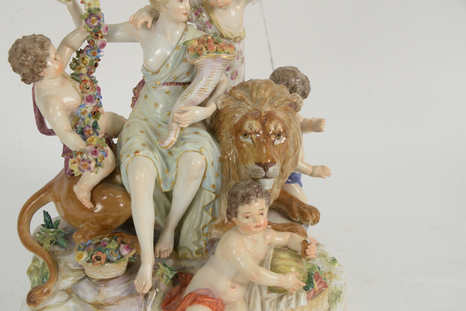 Meissen Figural Group, Cybelle crowned goddess seated on a lion holding cornucopia in one hand and a key in the other, 4 cherubs, losses and missing pieces, height 9 inches, width 8 1/2 inches.