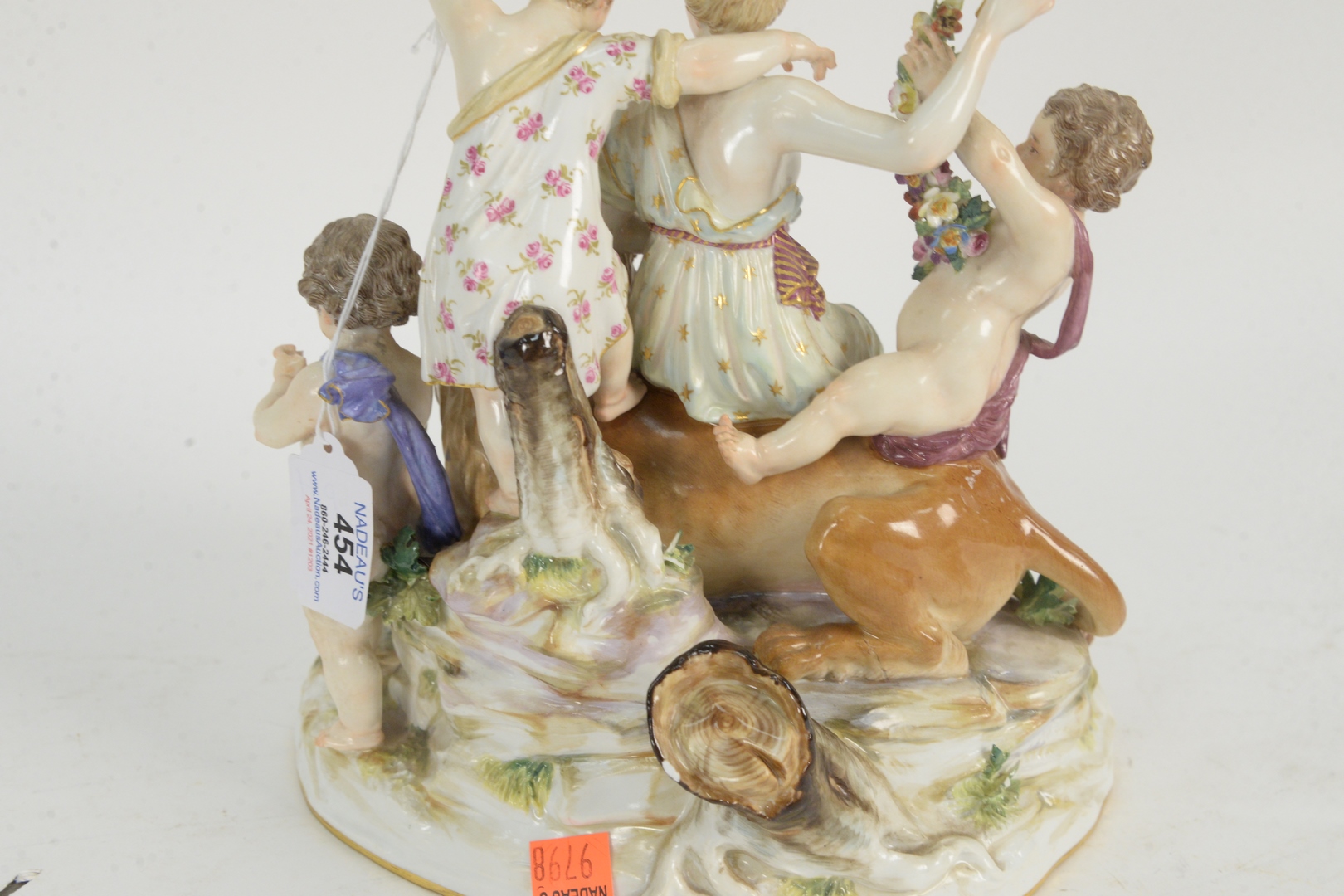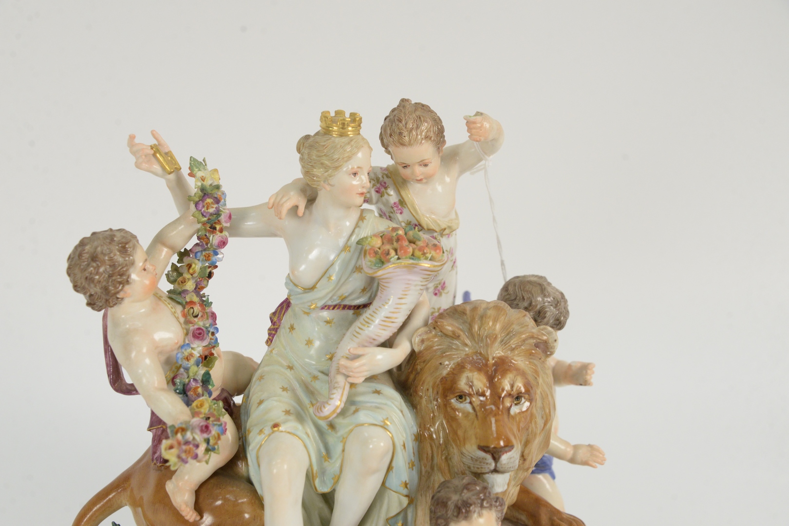 Lot 454: Meissen Figural Group, Cybelle crowned goddess seated on a lion holding cornucopia in one hand and a key in the other, 4 cherubs, losses and missing pieces, height 9 inches, width 8 1/2 inches.
