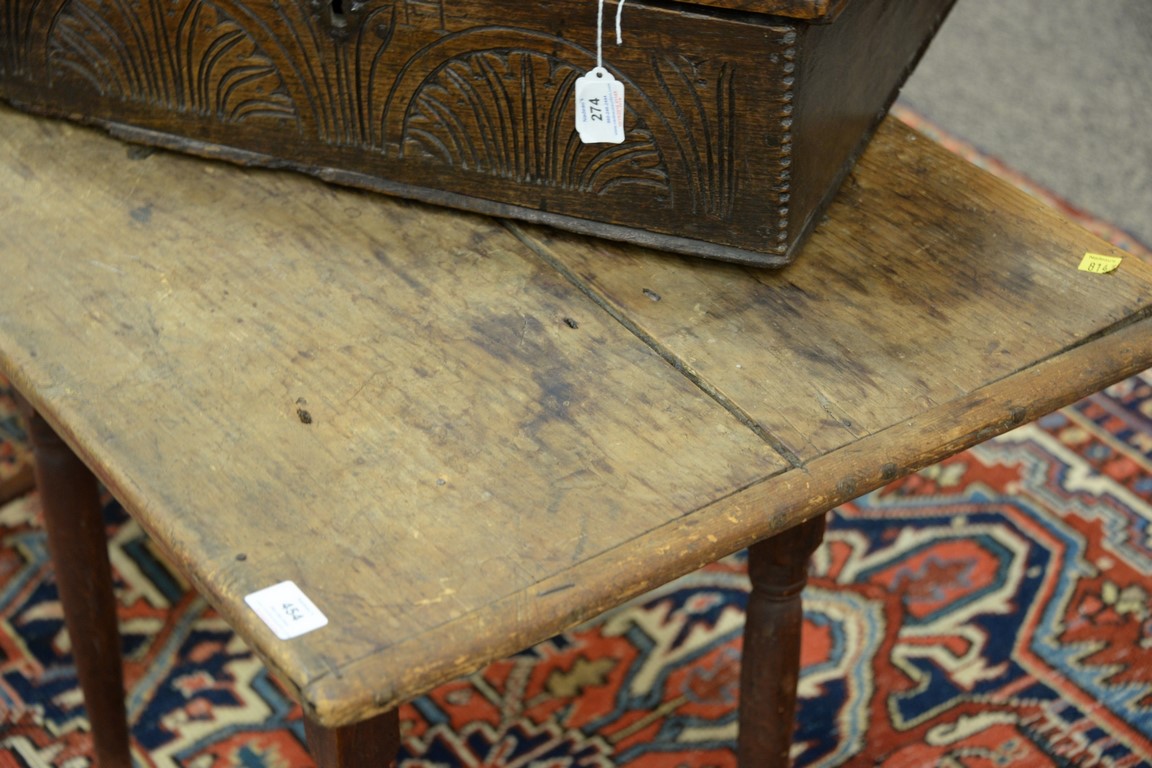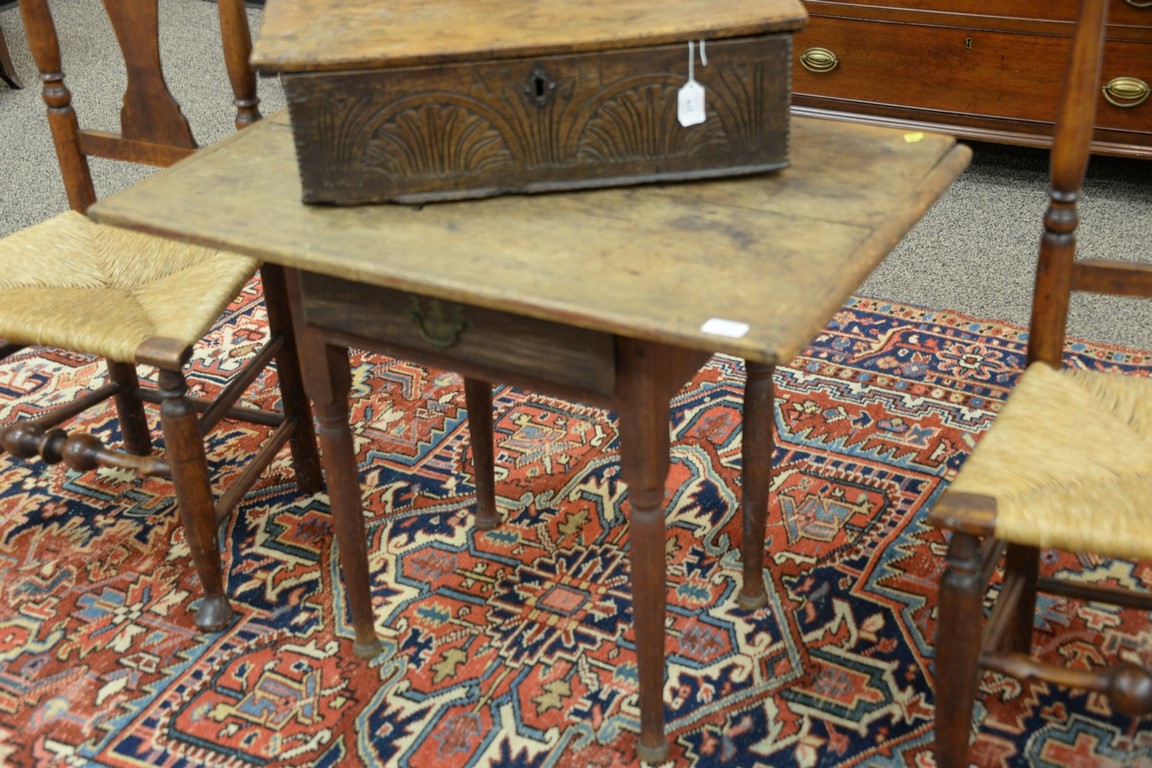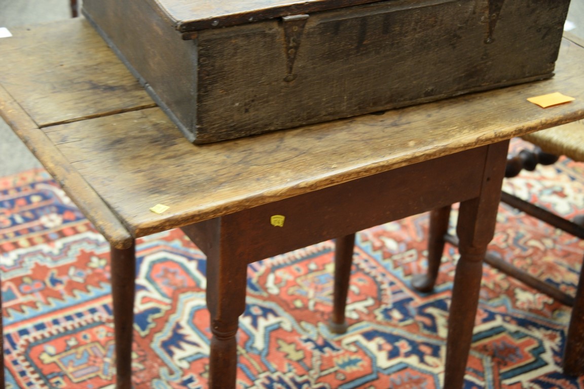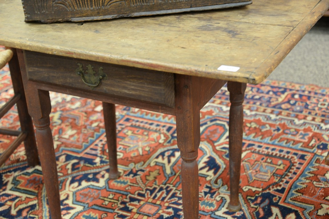 Lot 454: Queen Anne tavern table with breadboard top over drawer on turned legs ending in button feet. ht. 26 1/2in., top 23 x 34 1/2