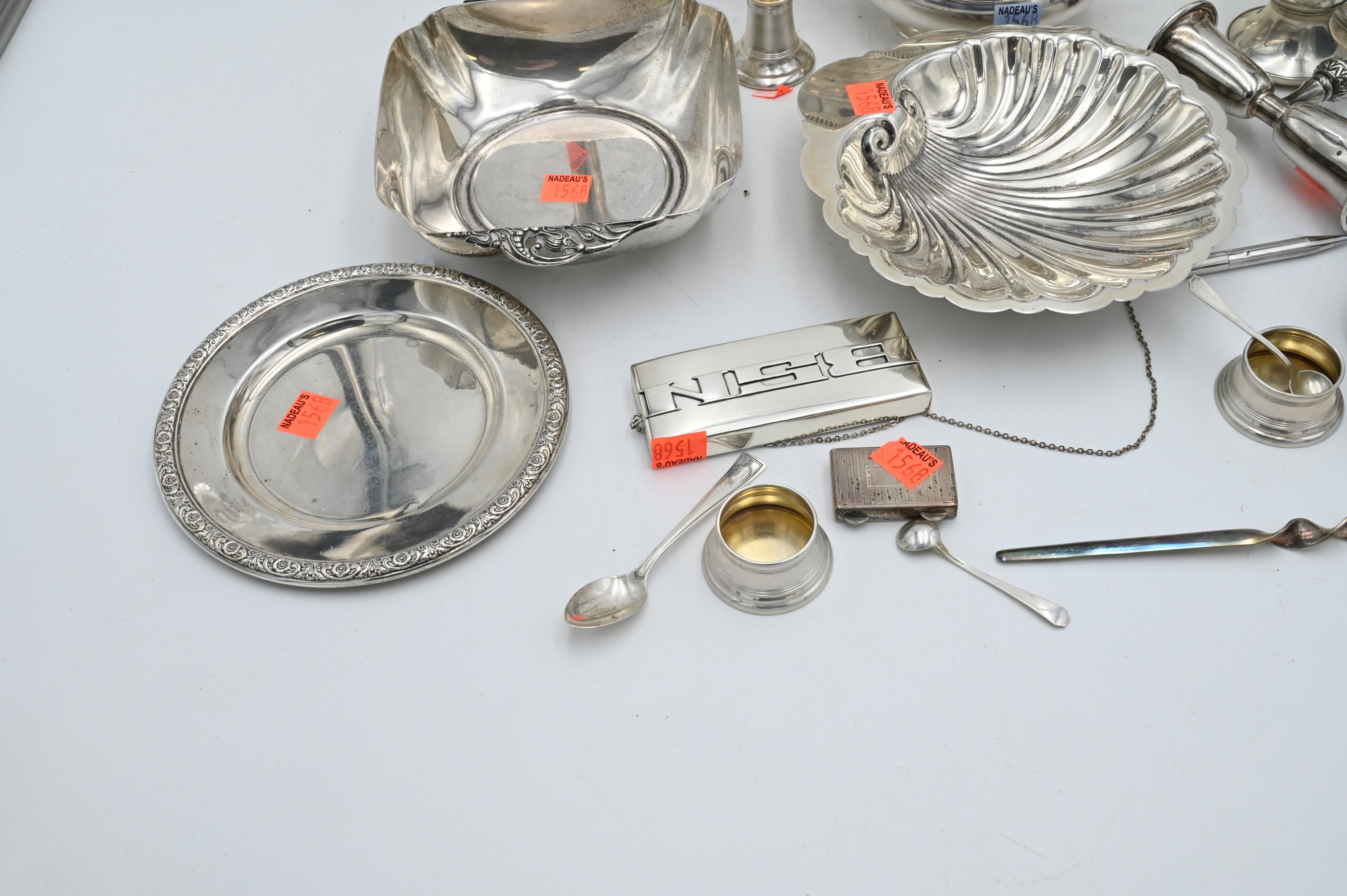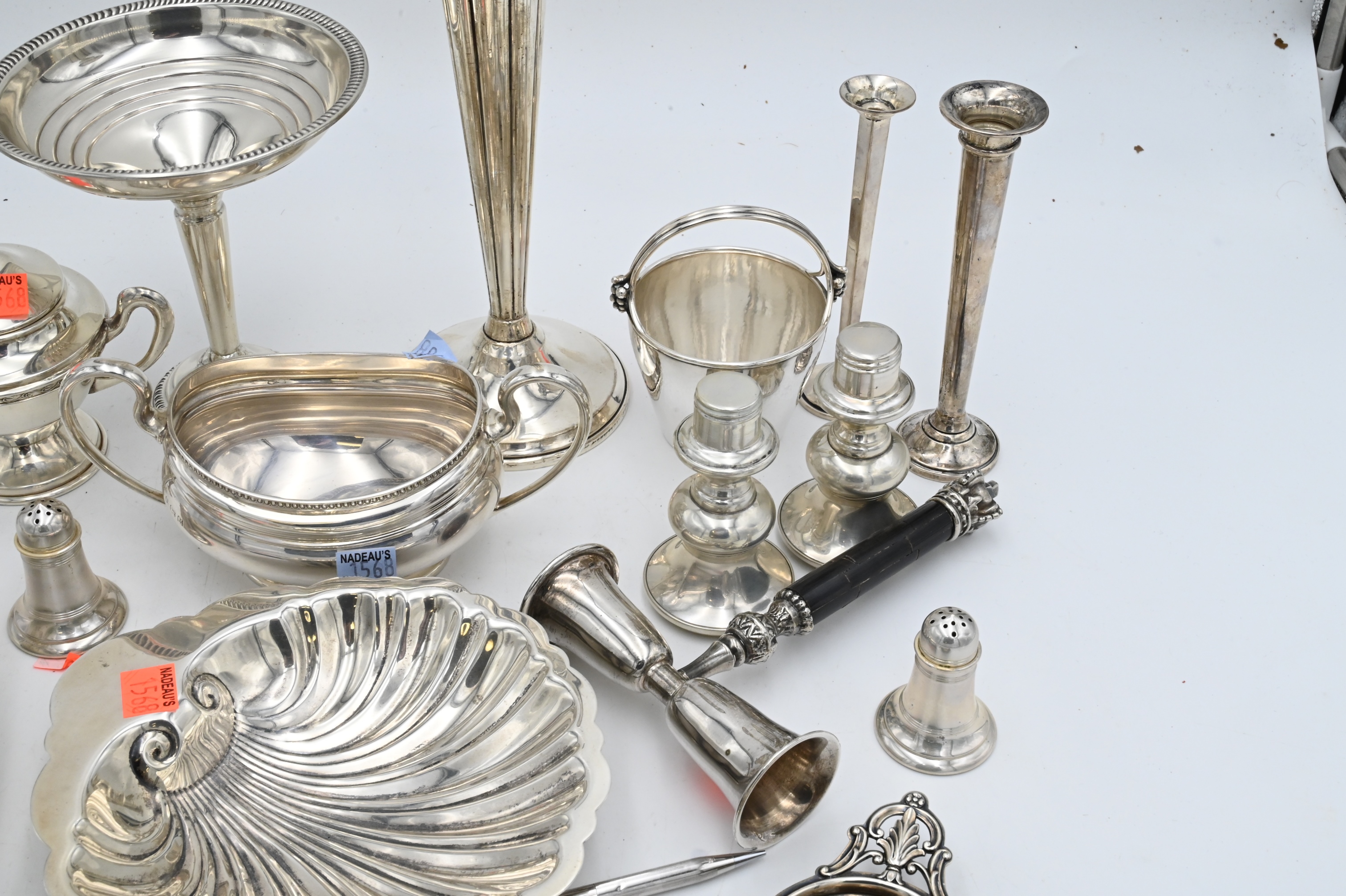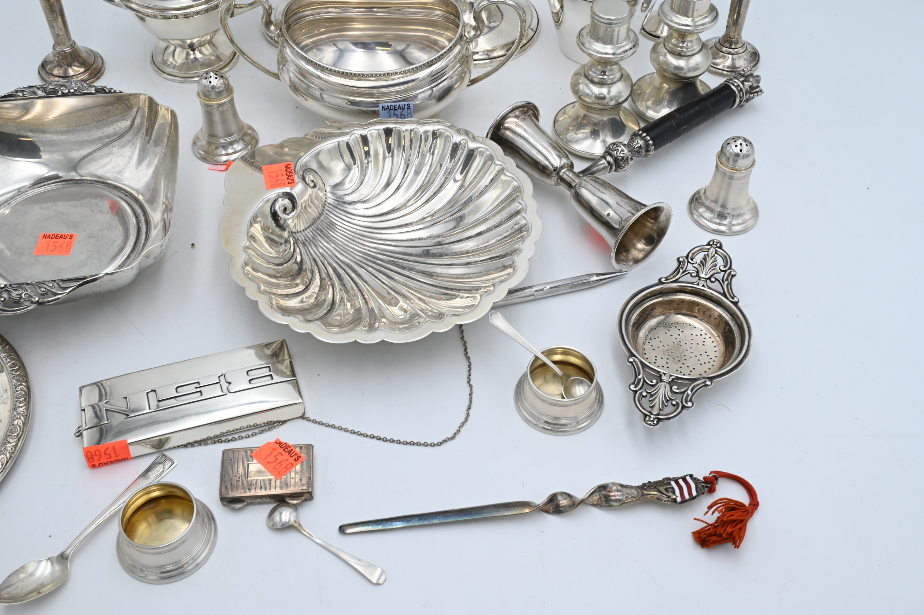 Tray Lot of Sterling Silver, with Danish small buckert, salts, shell dish, strainer covered superbowl, square dish and open sugar, plus weighted silver. tallest height 10 inches, 45.5 t.oz., plus weighted.