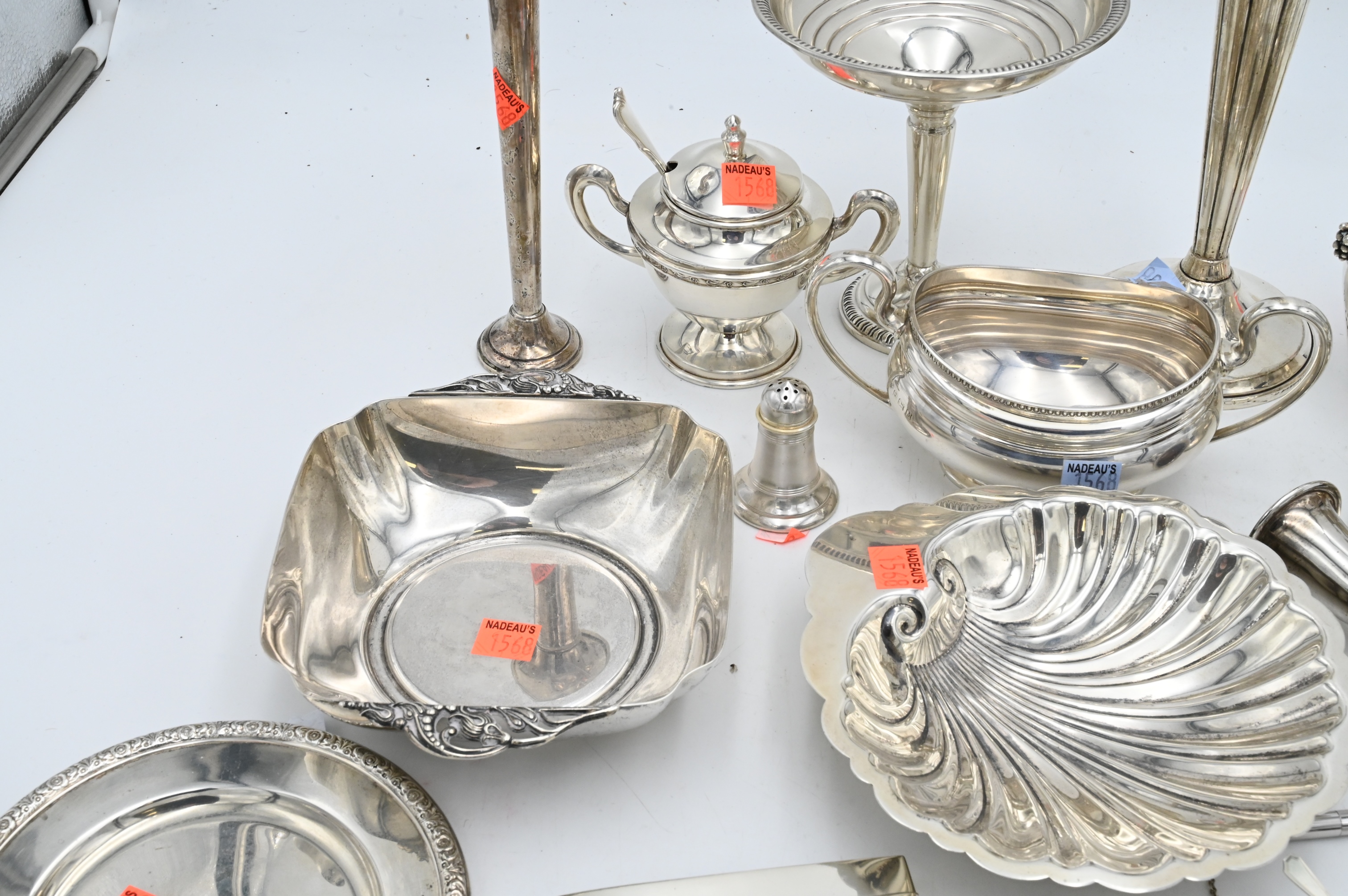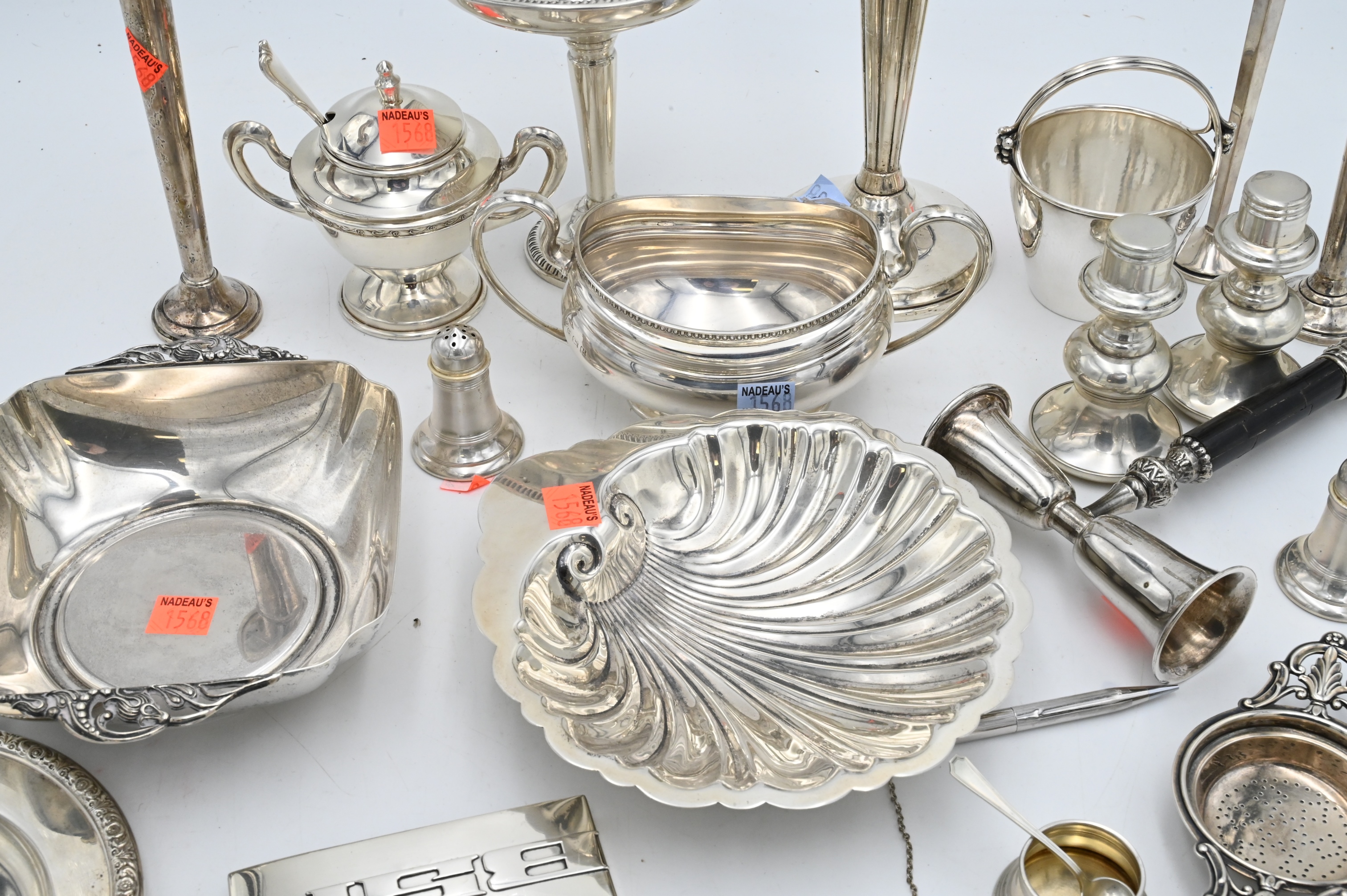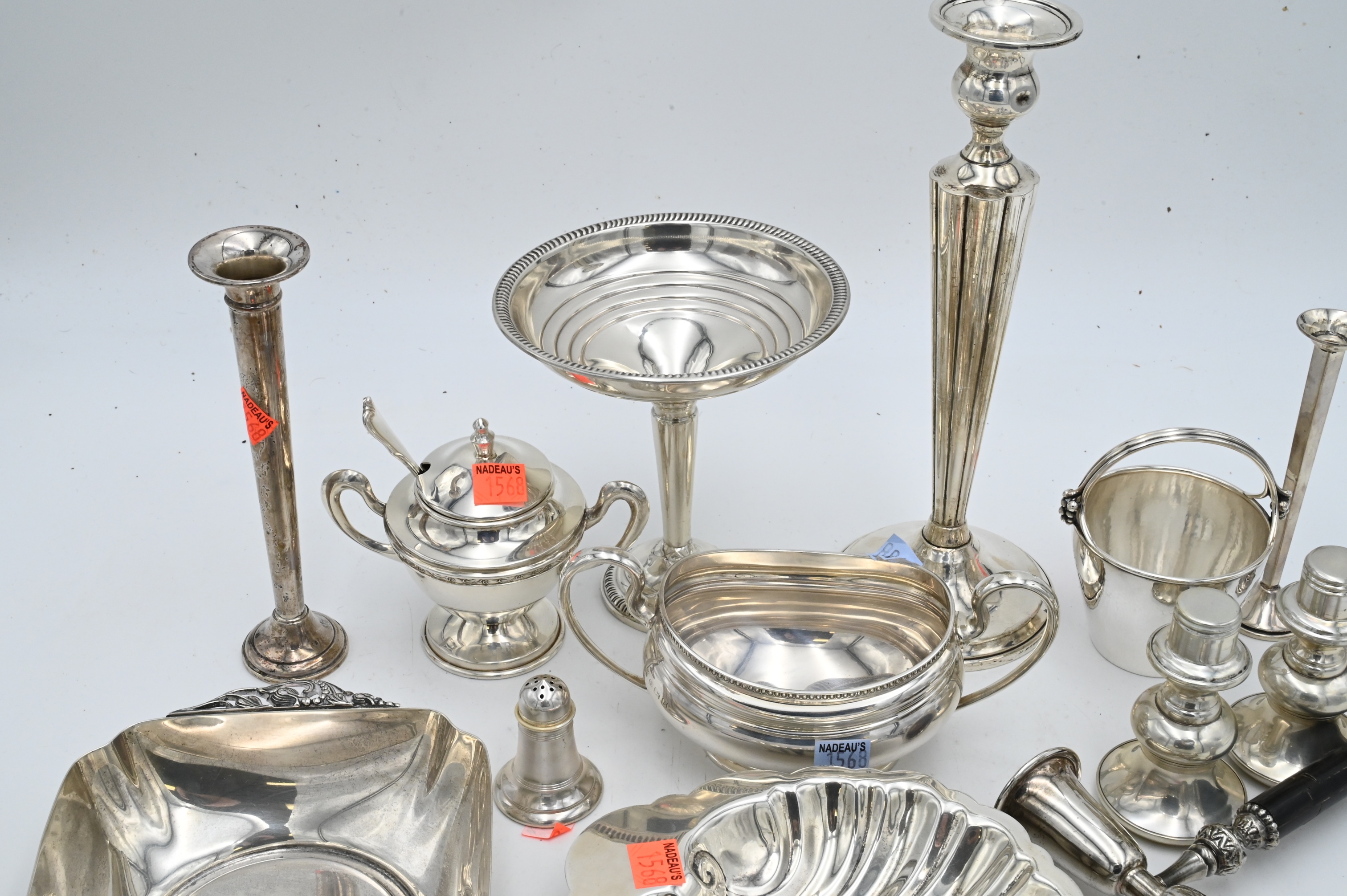 Tray Lot of Sterling Silver, with Danish small buckert, salts, shell dish, strainer covered superbowl, square dish and open sugar, plus weighted silver. tallest height 10 inches, 45.5 t.oz., plus weighted.