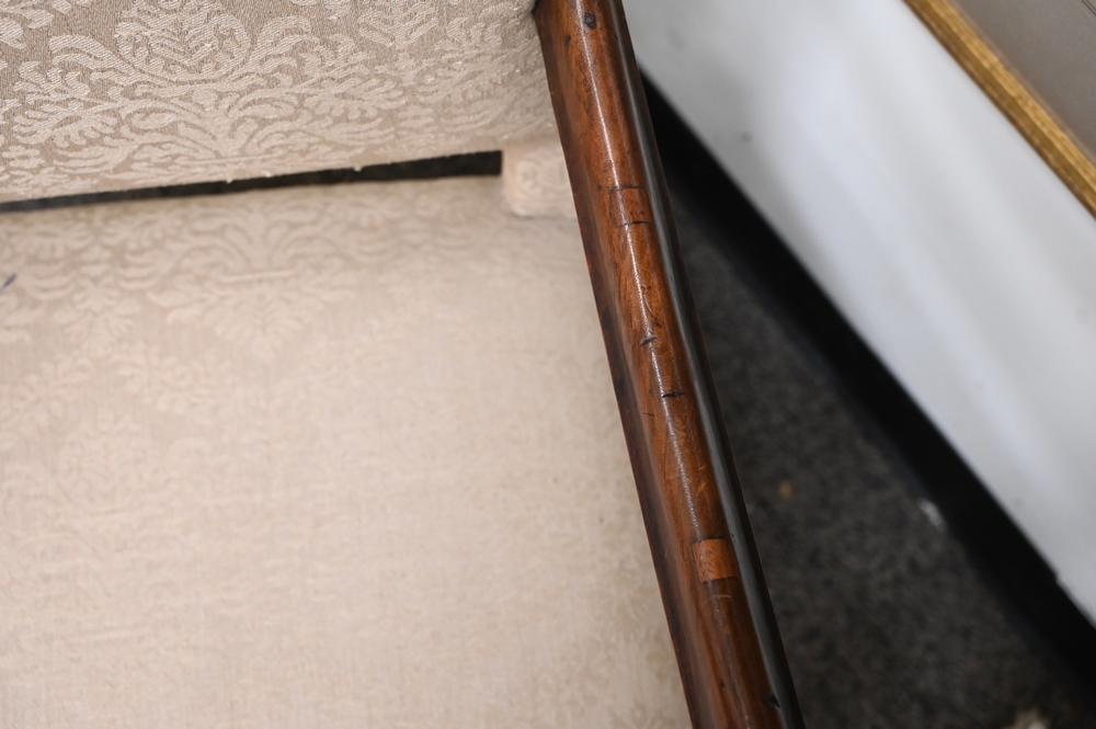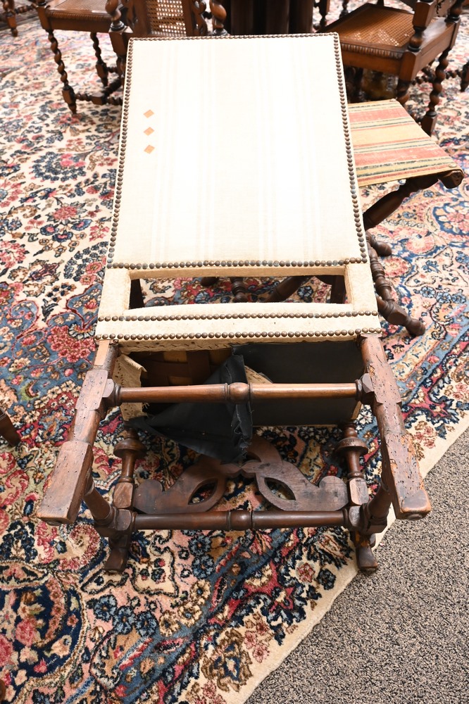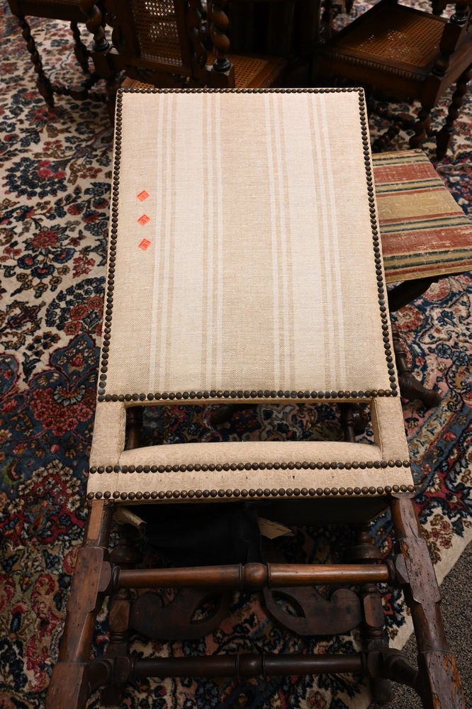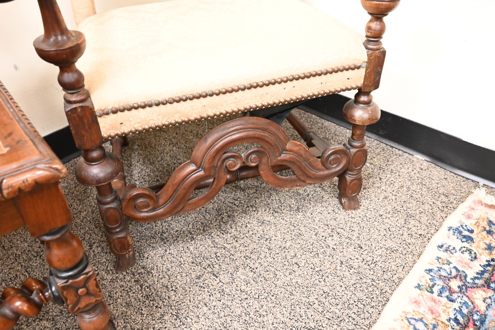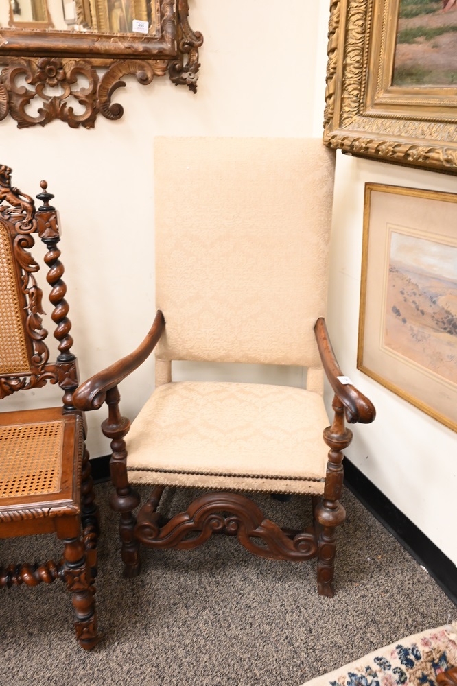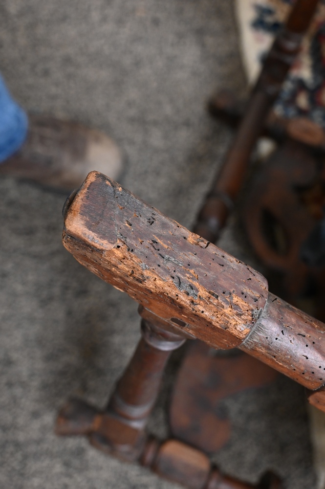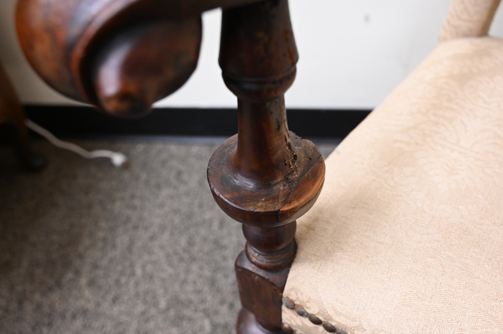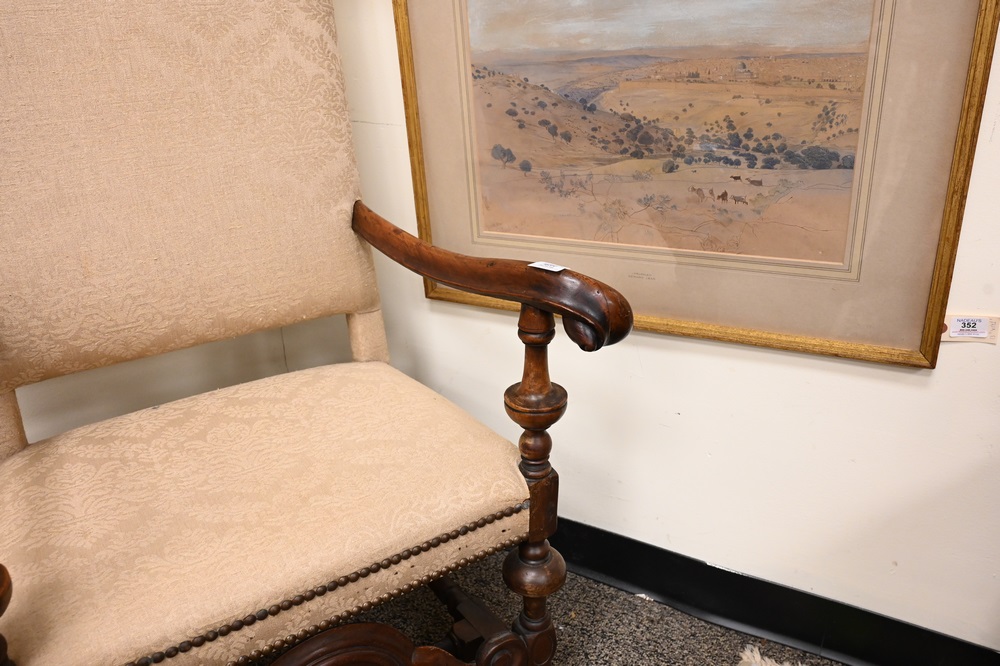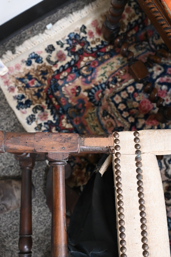 Lot 454: William and Mary Armchair, having upholstered back and seat on urn carved and turned legs ending in Spanish feet, with turned stretc…