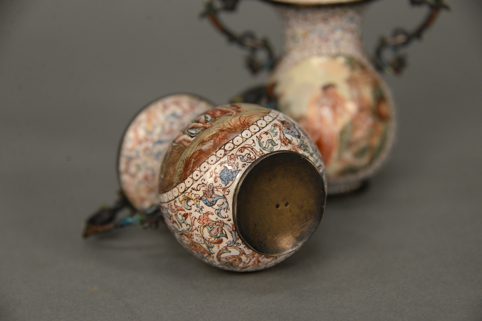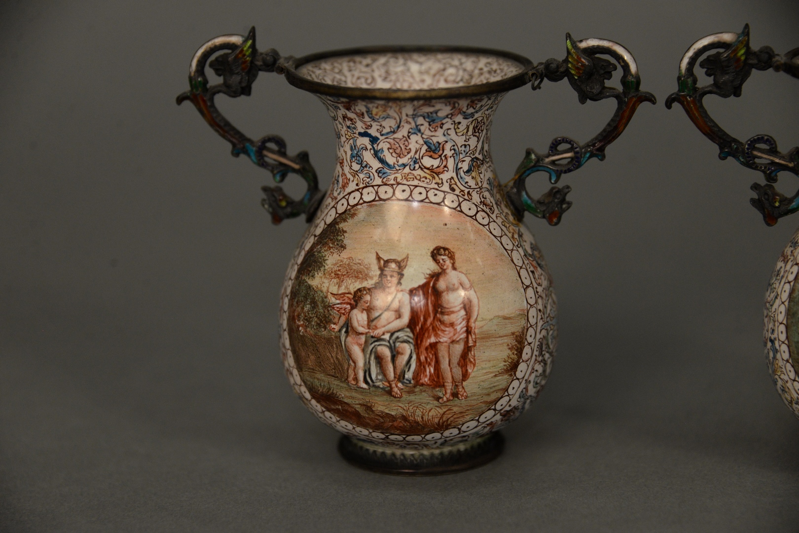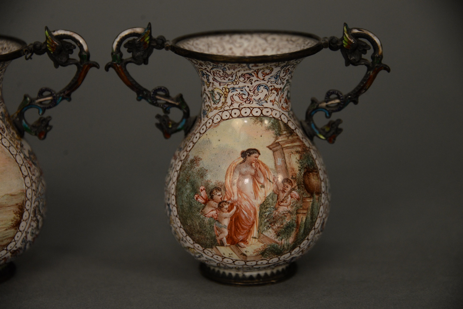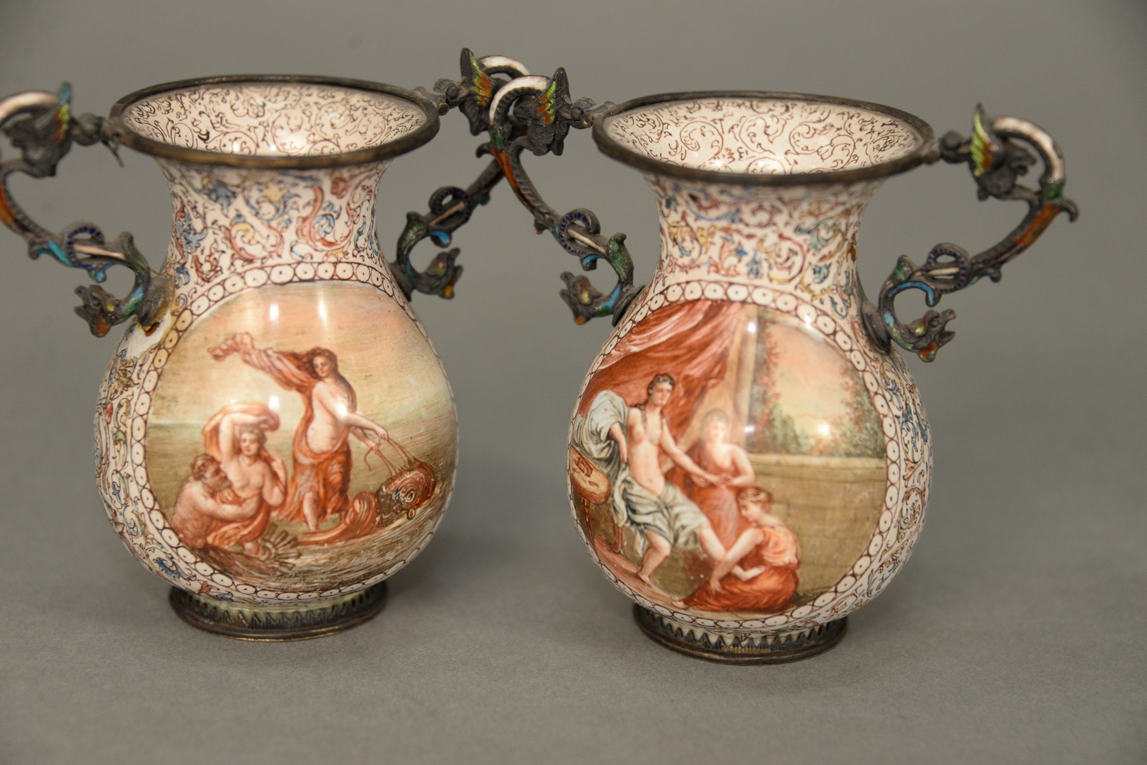 Lot 454A: Pair of Viennese Enameled Silver Urns having partially clad figures and Putties, enameled, winged griffin handles, one chip at han…