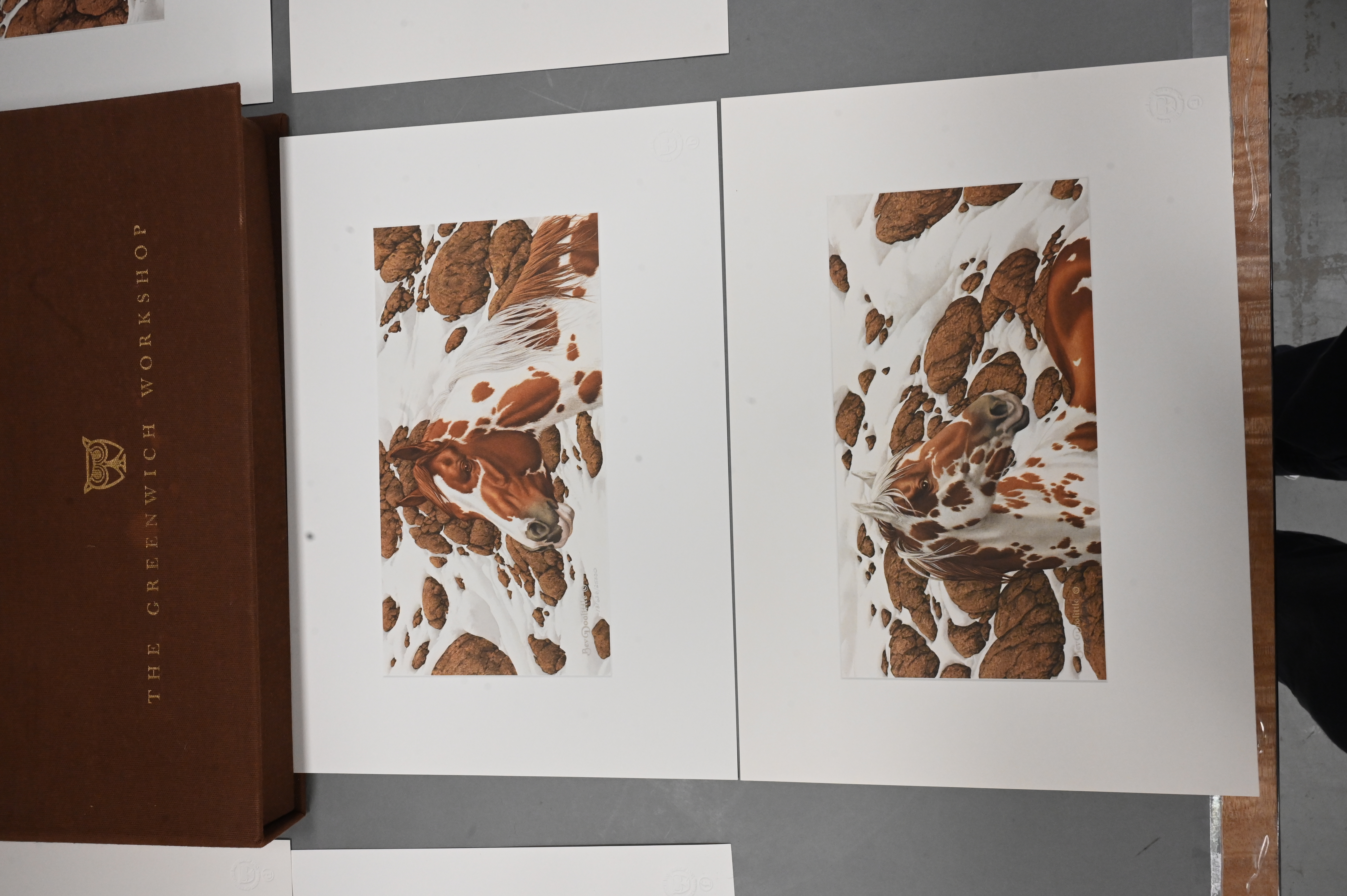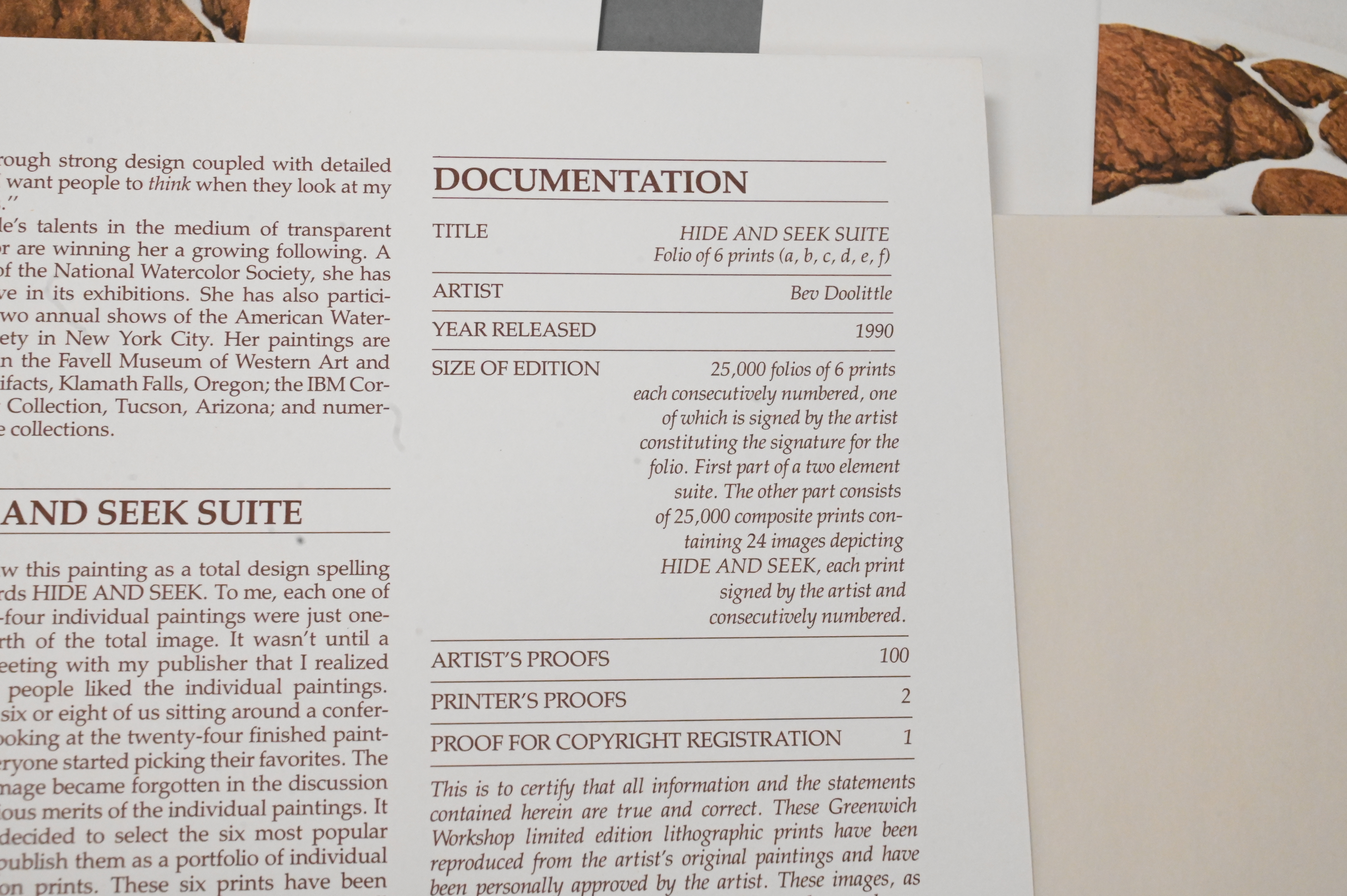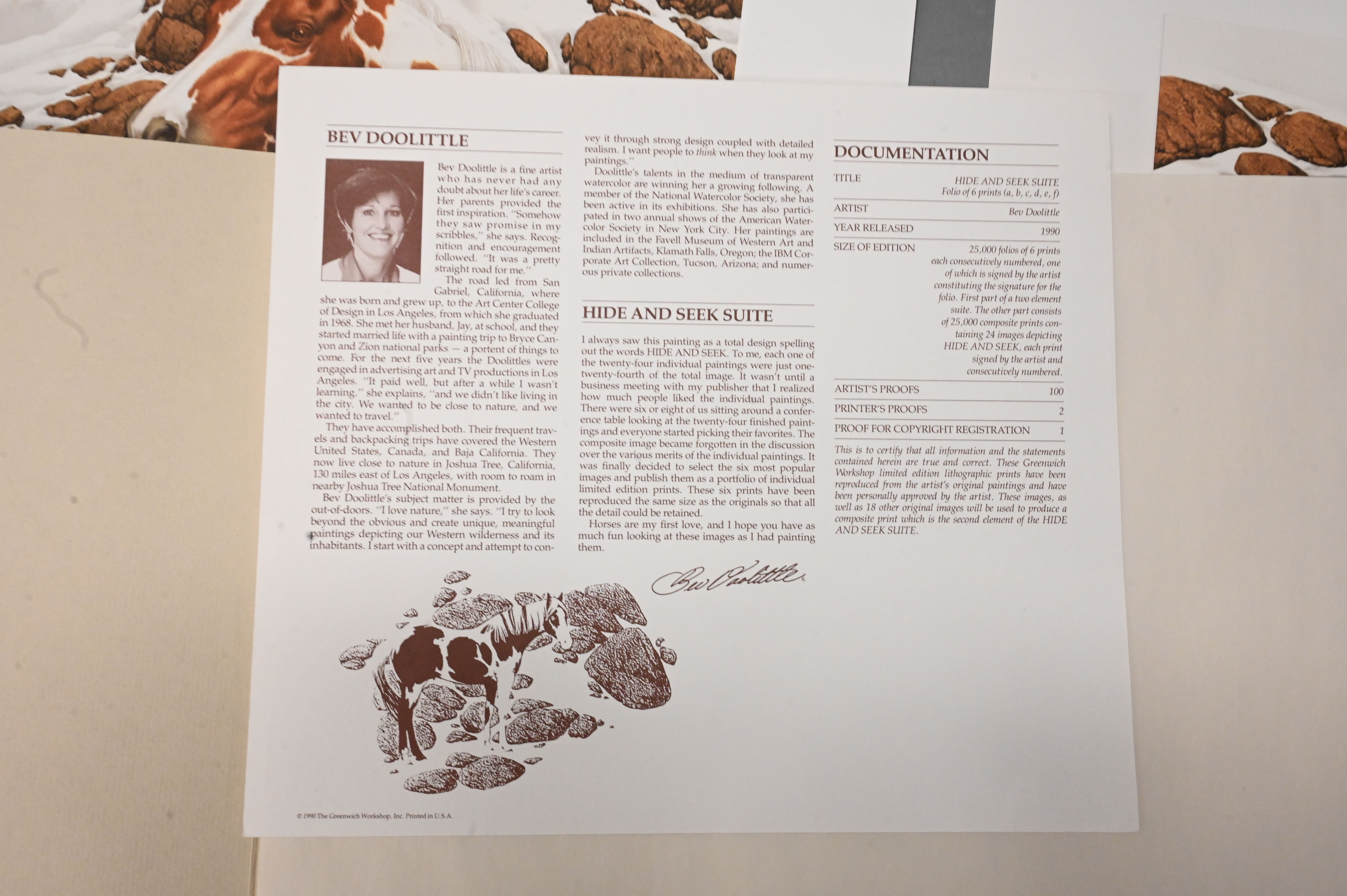 Bev Doolittle Hide and Seek Suite Folio, containing six prints, editioned 13,163/25,000, in hardcover sleeve, 12″ x 16 1/2″.