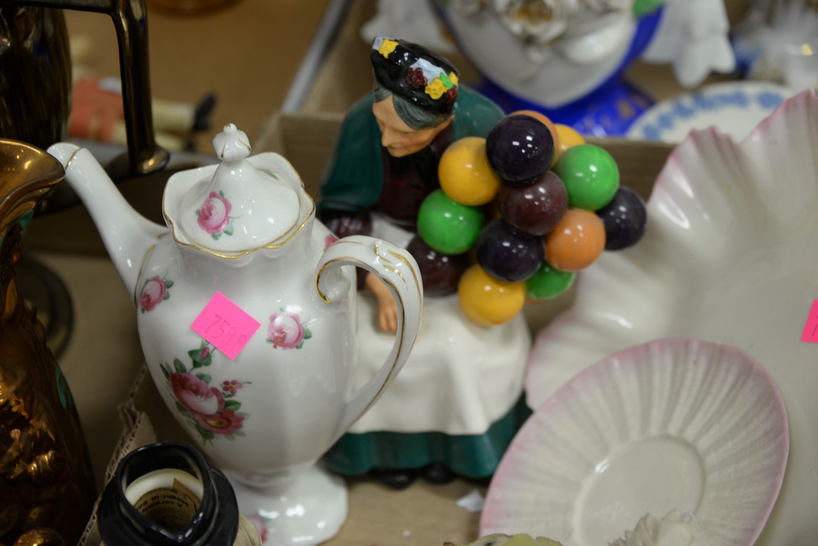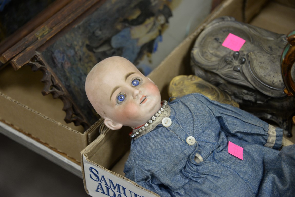 Lot 455: Eight box lots to include Royal Doulton balloon lady, Belleek, five oil lamps, Simon Halbig Bisque head doll, copper luster, gilt ti…
