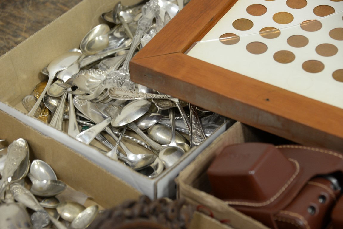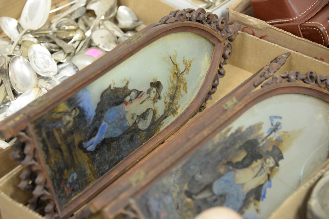 Eight box lots to include Royal Doulton balloon lady, Belleek, five oil lamps, Simon Halbig Bisque head doll, copper luster, gilt tin, two cameras, four fold Victorian reverse painted screen, silverplate, miscellaneous flateware, etc.