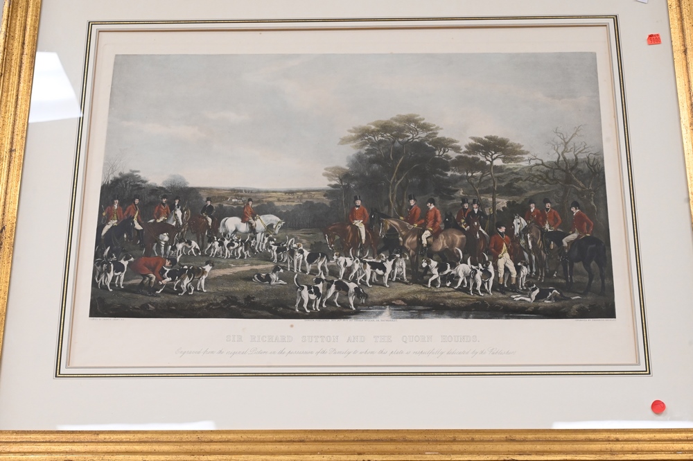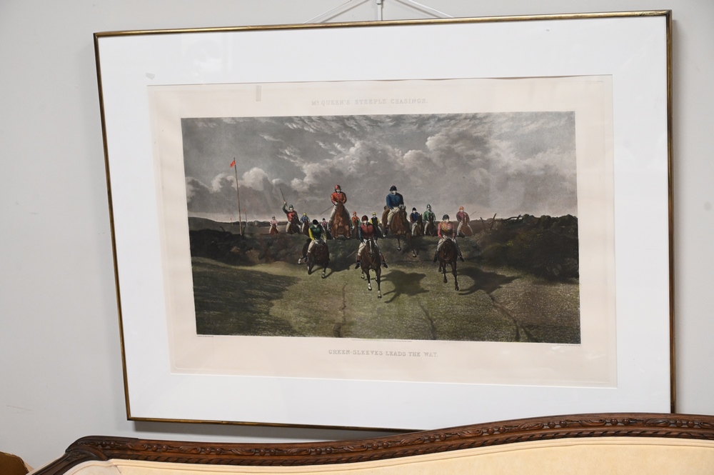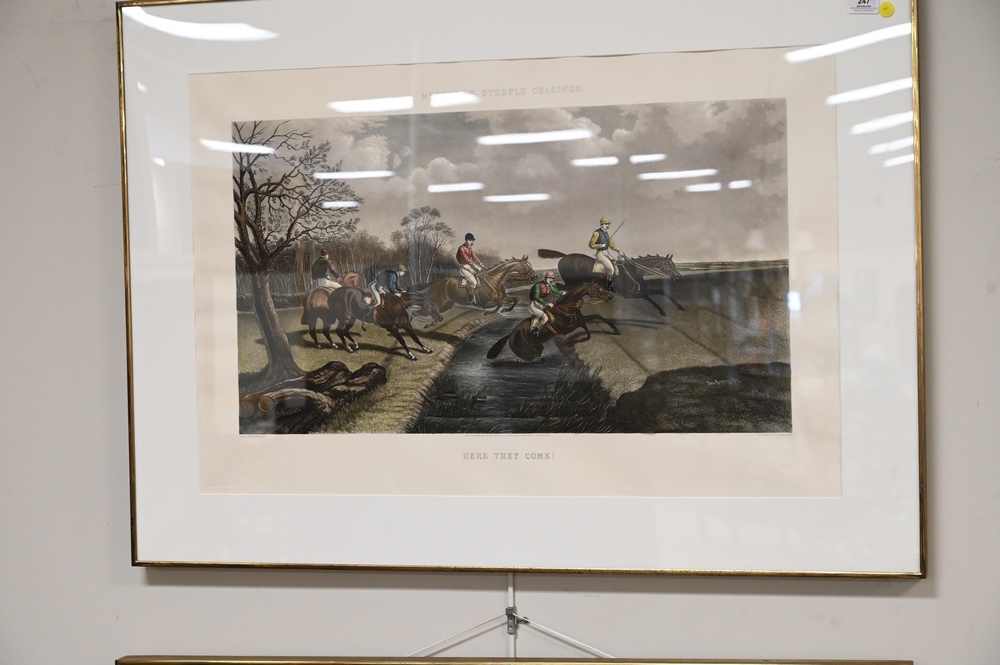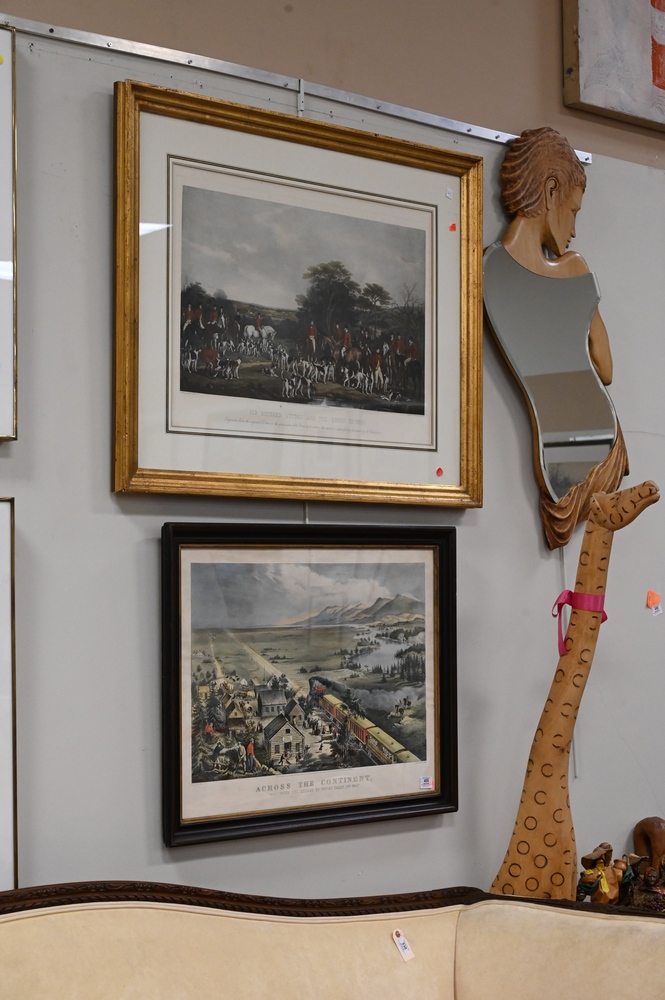 Four Piece Lot, to include after Currier and Ives, “Across the Continent”, restrike lithograph on paper with hand coloring printed title and credit line through the lower margin, image size 17 1/2 x 27 1/4 inches; along with a Charles Hunt & Sons Hunt Scenes “Greensleeves Leads the Way (McQueen’s Steeple Chasings), 1873”; “Here They Come (McQueen’s Steeple Chasings), 1873″; (both engravings having hand coloring on paper, both inscribed in plate along the lower margin), image size 17″ x 30”; along with after Francis Grant, Scottish, 1803 – 1898, “Sir Richard Sutton and Quorn Hounds”, engraving with hand coloring on paper, inscribed in plate throughout the lower margin, image size 16 3/4 x 28 1/4 inches.