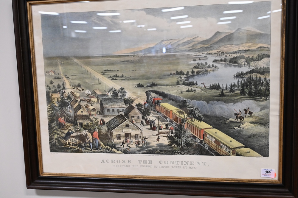 Lot 455: Four Piece Lot, to include after Currier and Ives, “Across the Continent”, restrike lithograph on paper with hand coloring printed t…