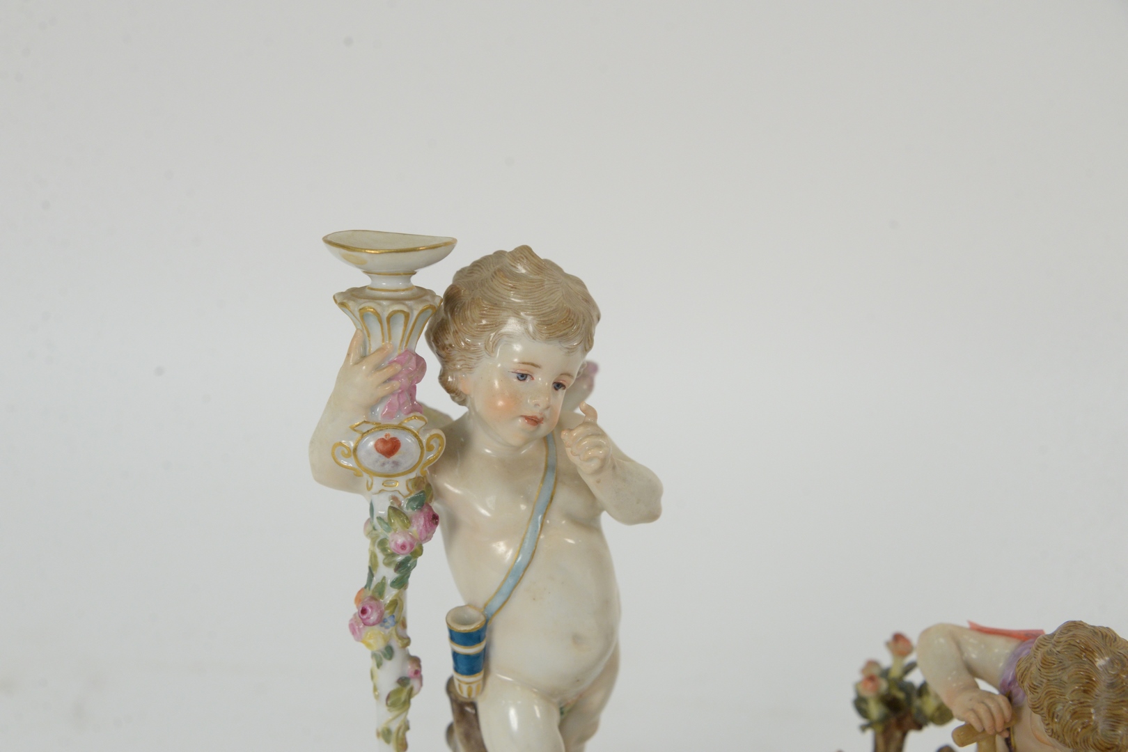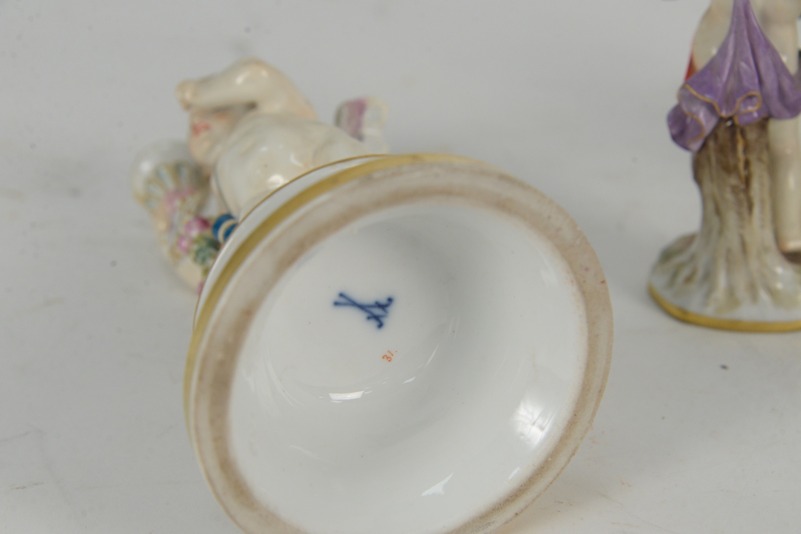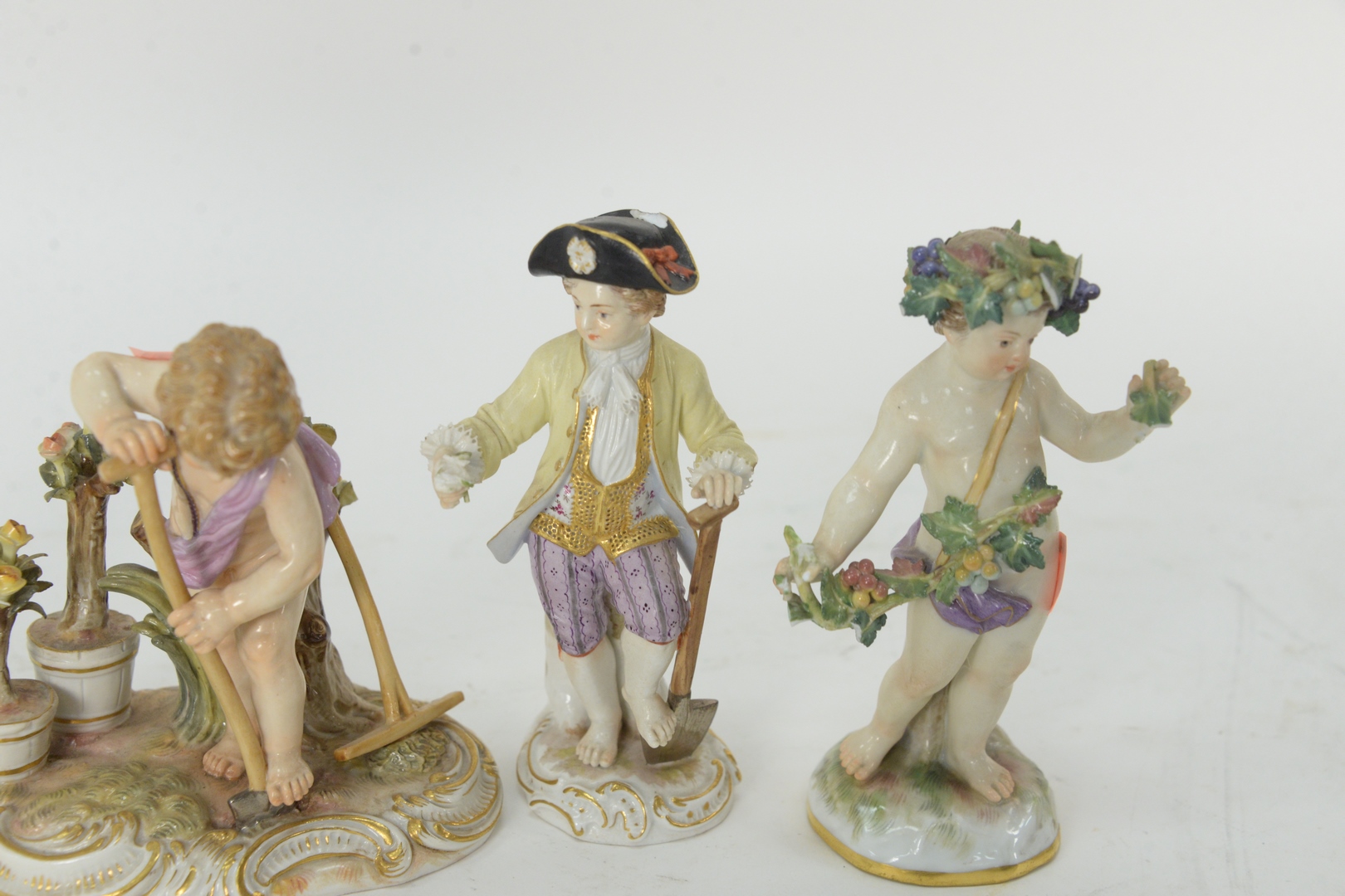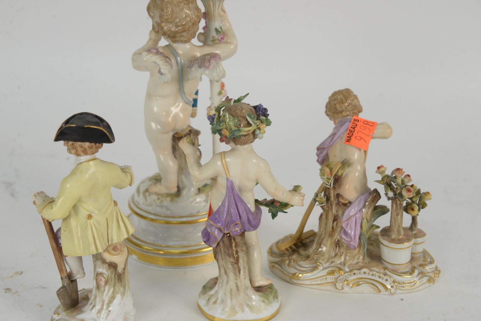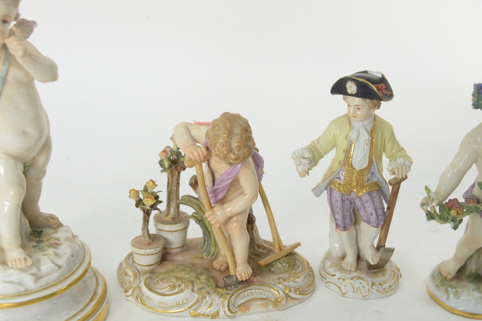 Four Porcelain Figures marked Meissen having the crossed swords on round base with small chips at base, minor losses one with Davis Collamore, New York label on bottom, heights 4 – 7 1/2 inches.