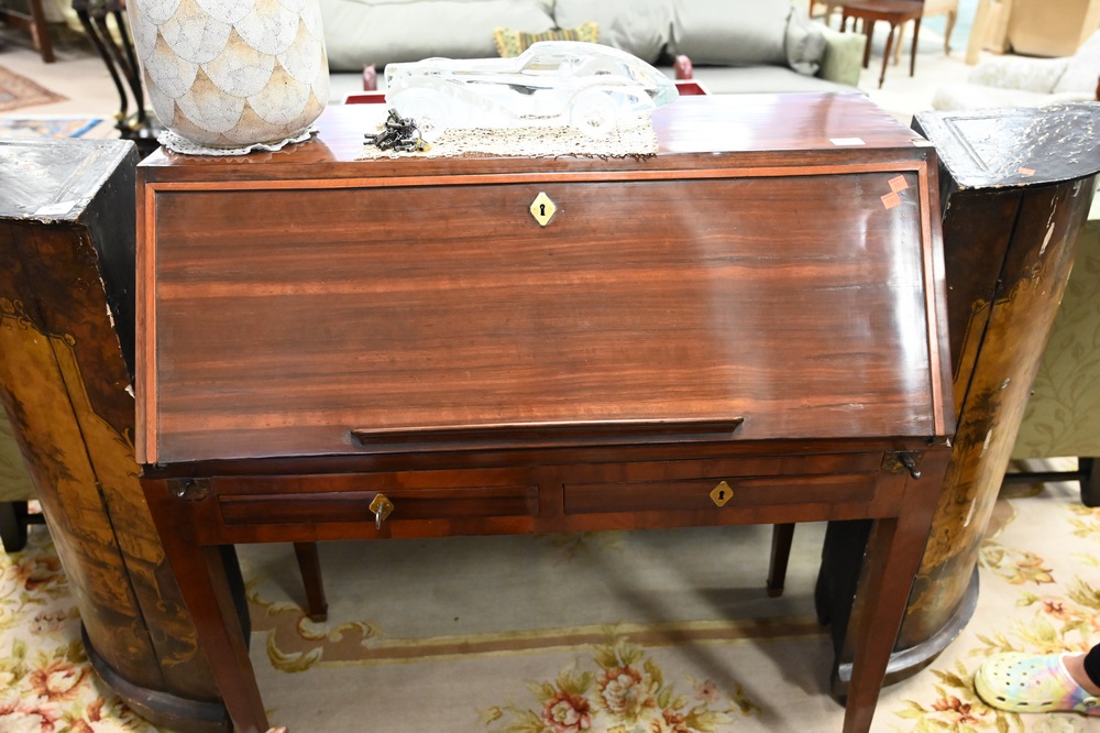 French Mahogany Slant Lid Desk, having drop front opening to fitted interior over two drawers, height 41 inches, width 38 1/2 inches…