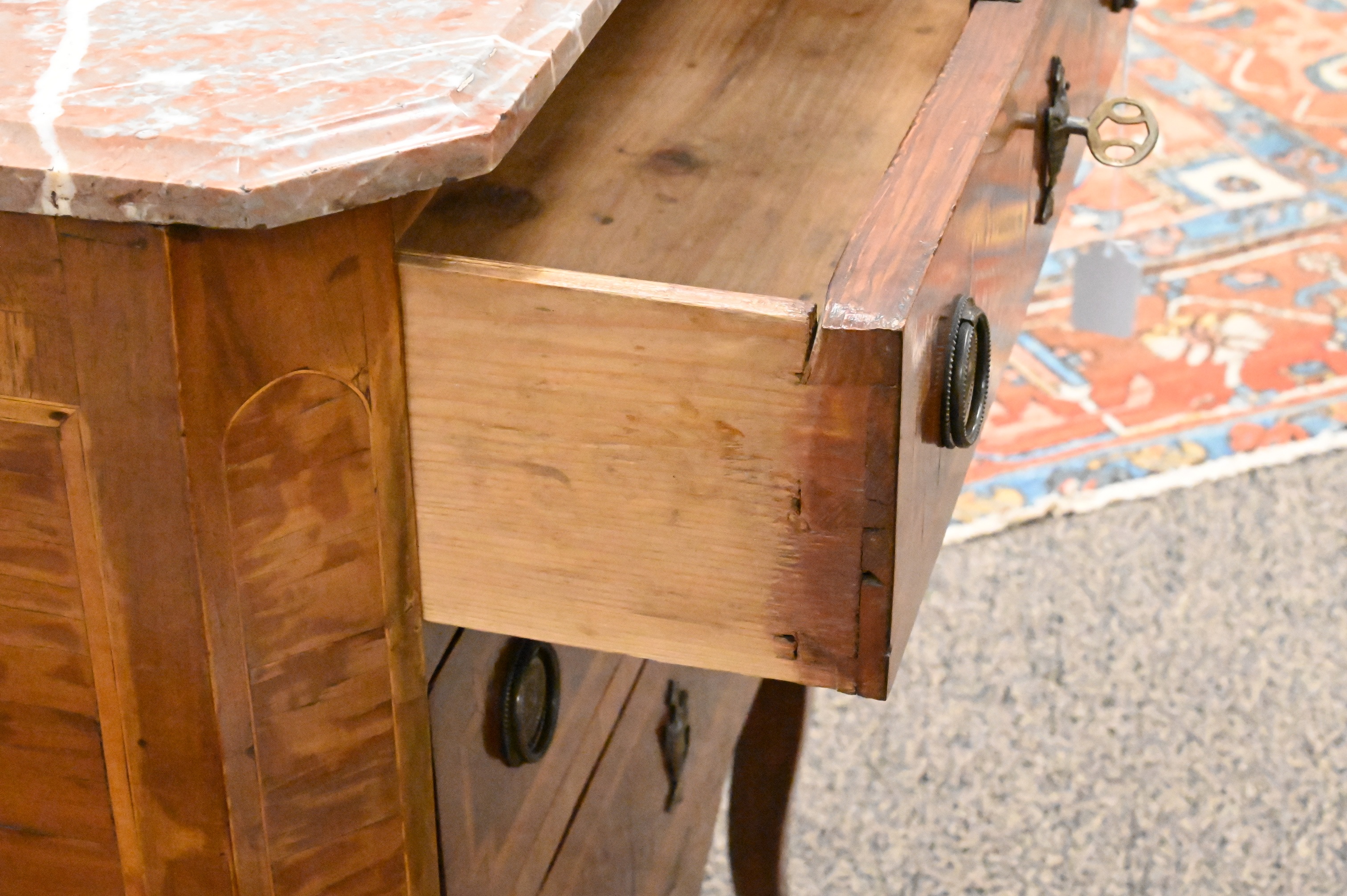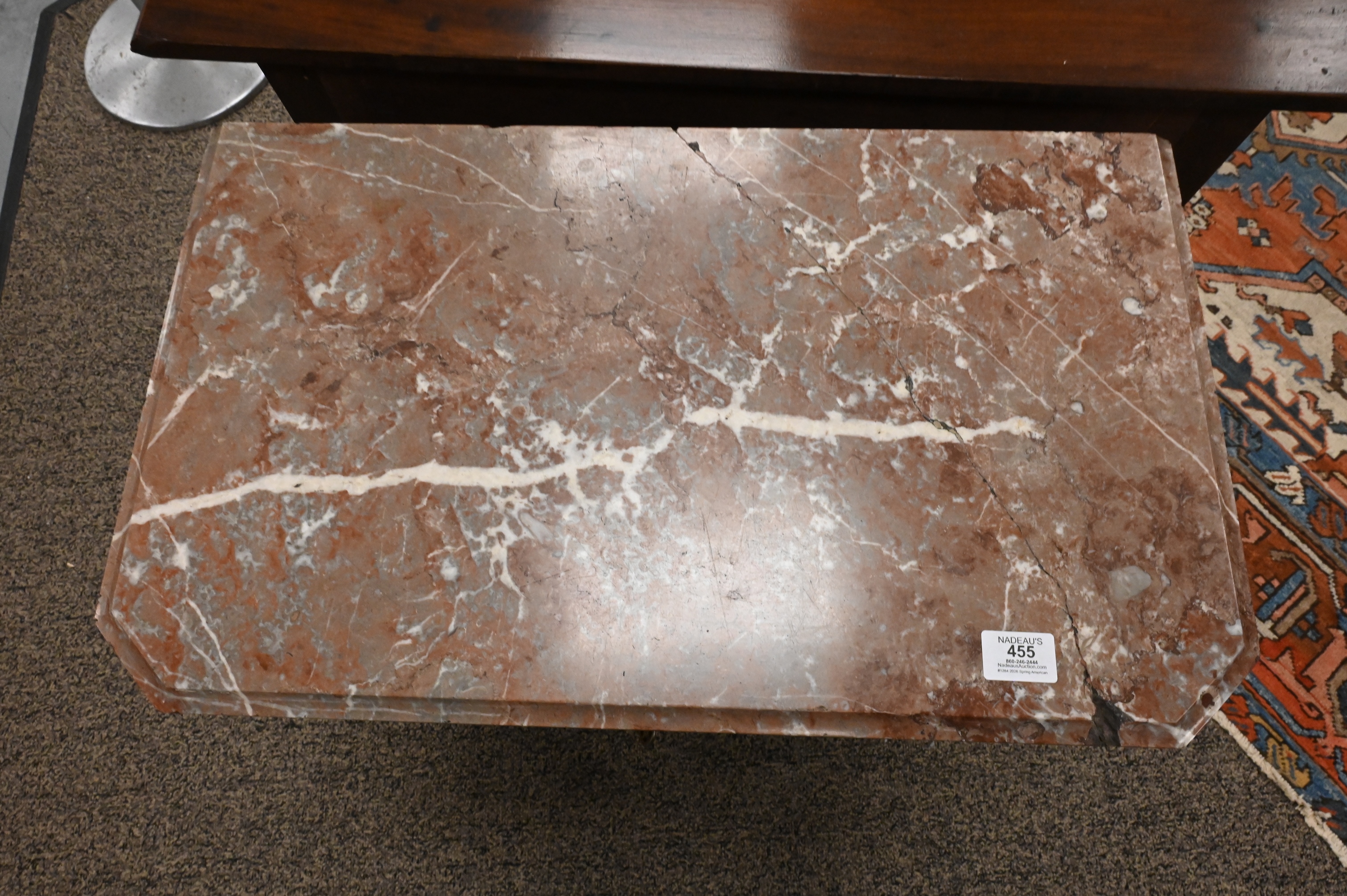 variegated pink rectangular marble top with canted corners above a conforming case with three short drawers and squared cabriole legs, early 18th to 19th Century