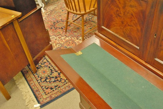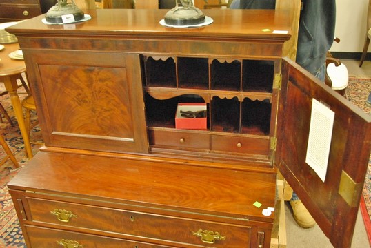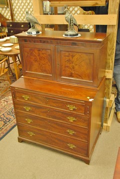 Lot 455: Mahogany secretary desk having two door top with flip writing top, ht. 48 in. wd. 34 in. dp. 21 in.
