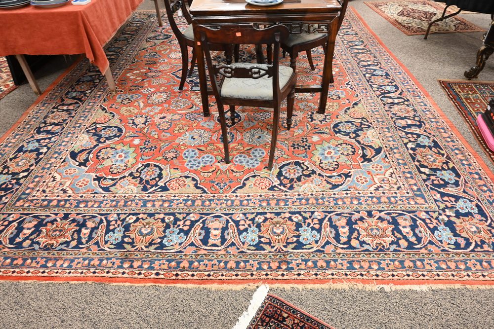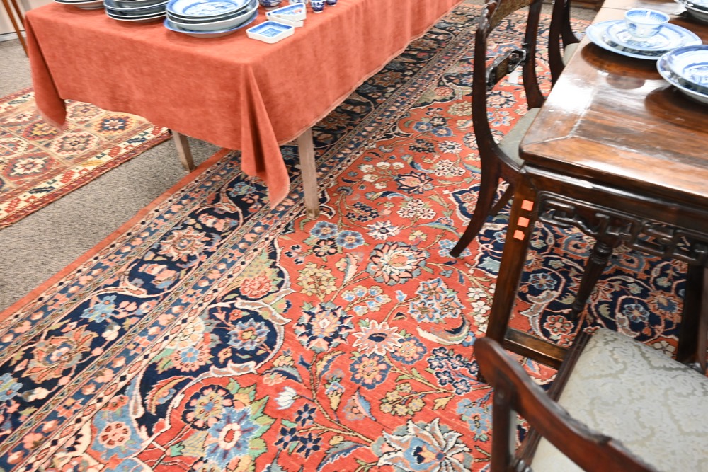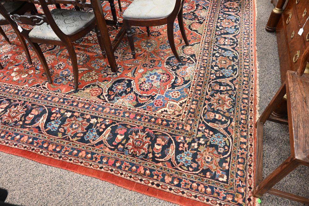Lot 455: Sarouk Oriental Carpet 10′ 9″ x 14′ Provenance: Fifty Year Personal Collection of Clocks and American Antiques from Thomas Bailey, Manchester, Connecticut.