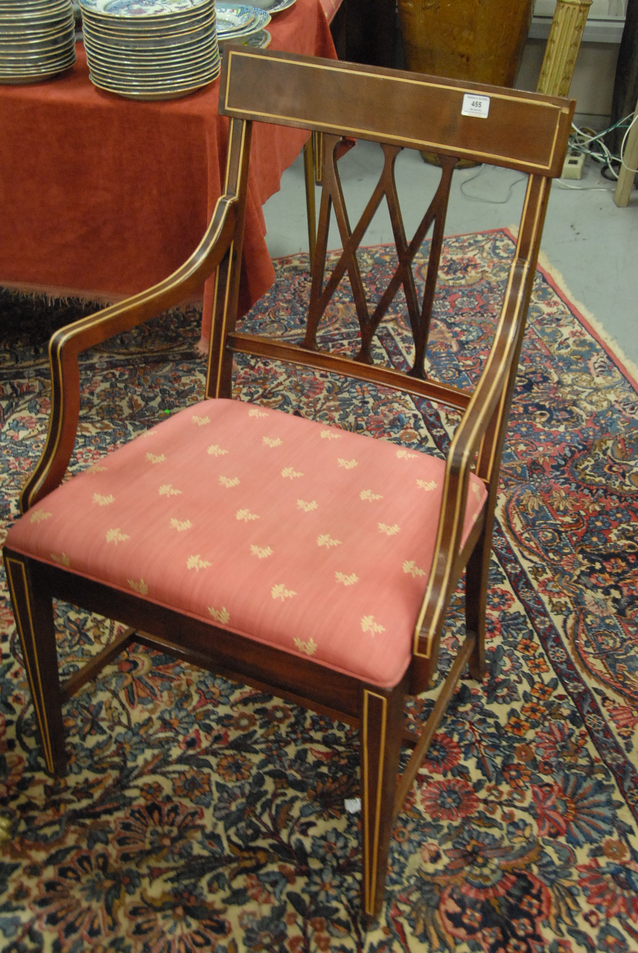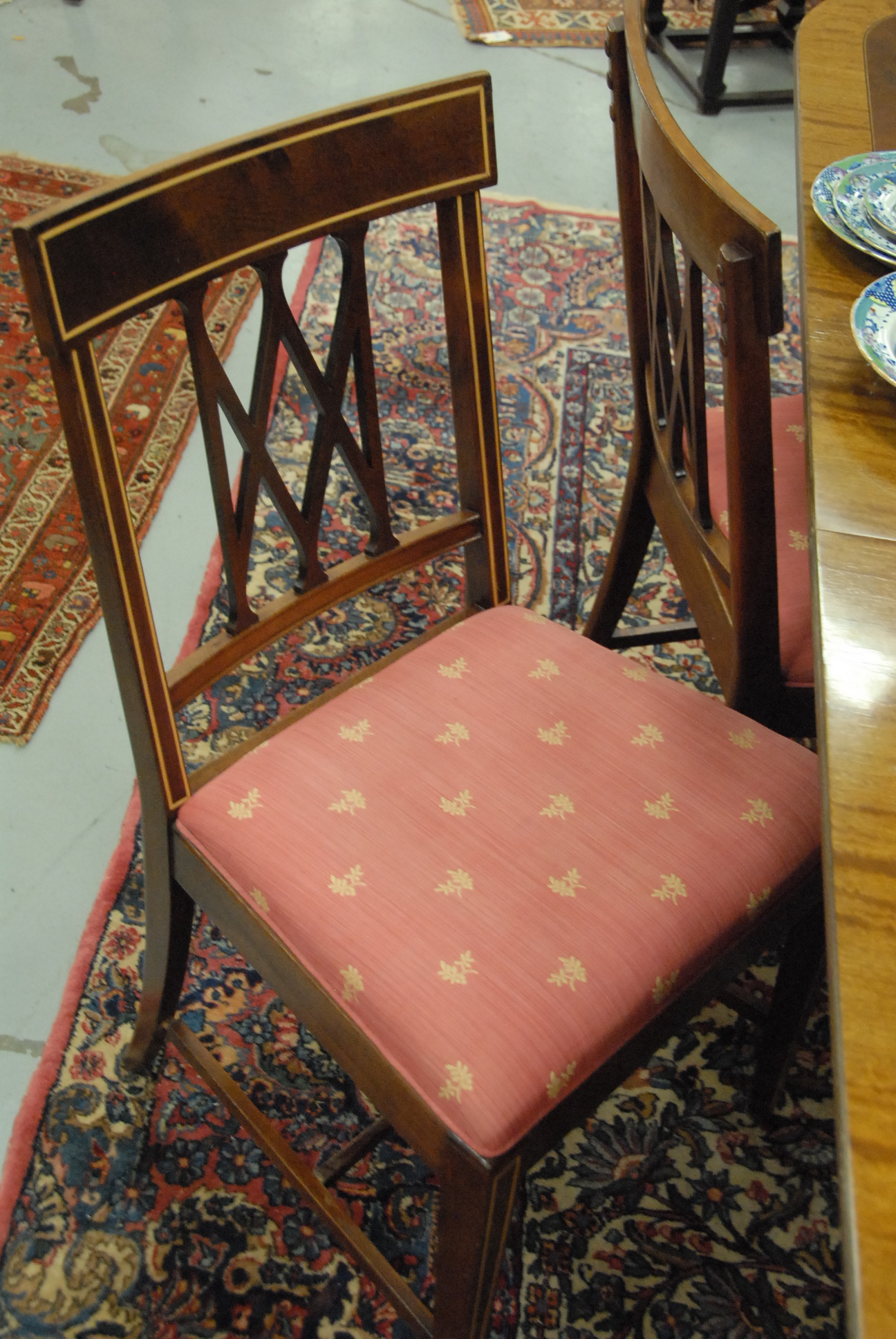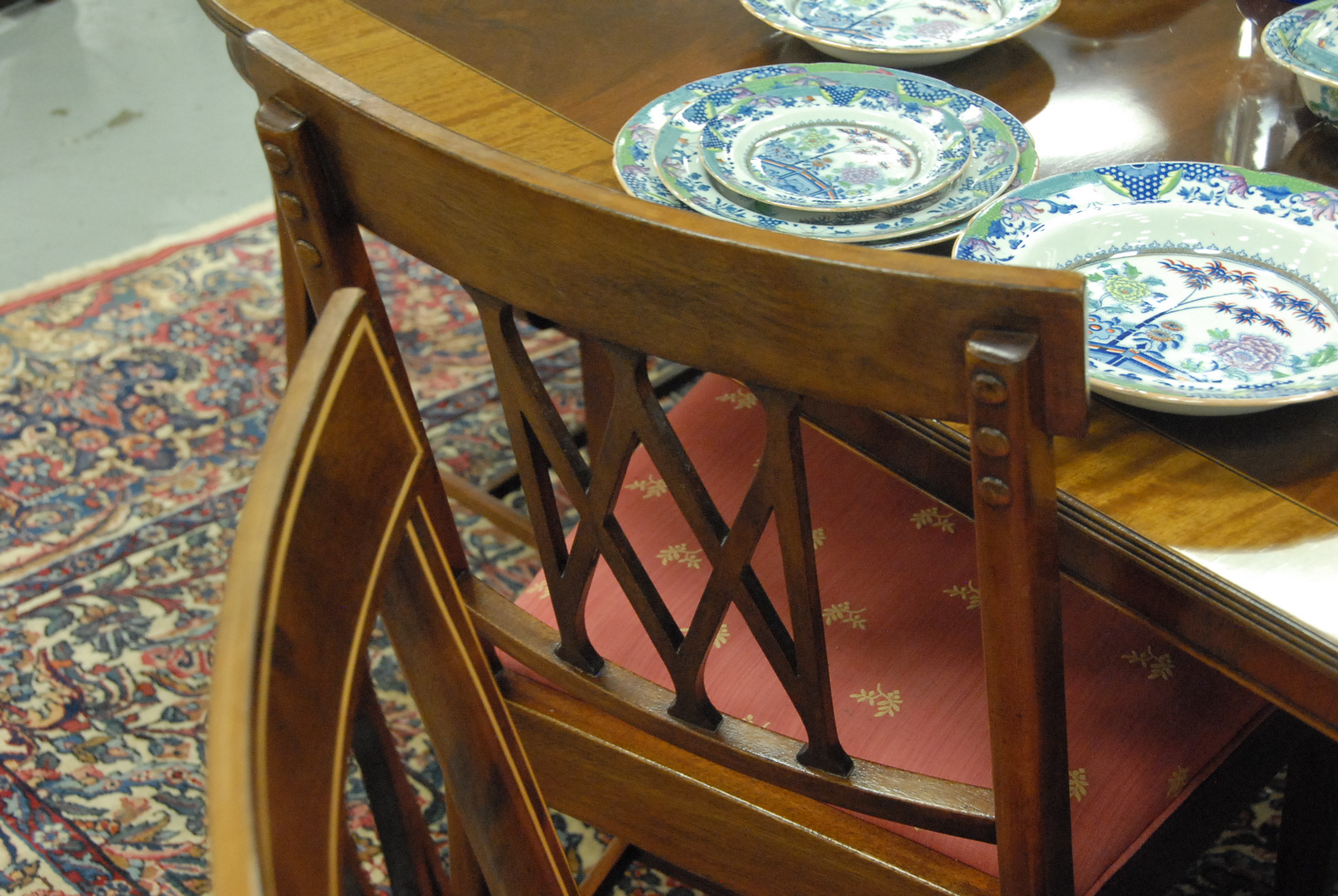 Set of eight Federal style mahogany dining chairs with rose covered seats.