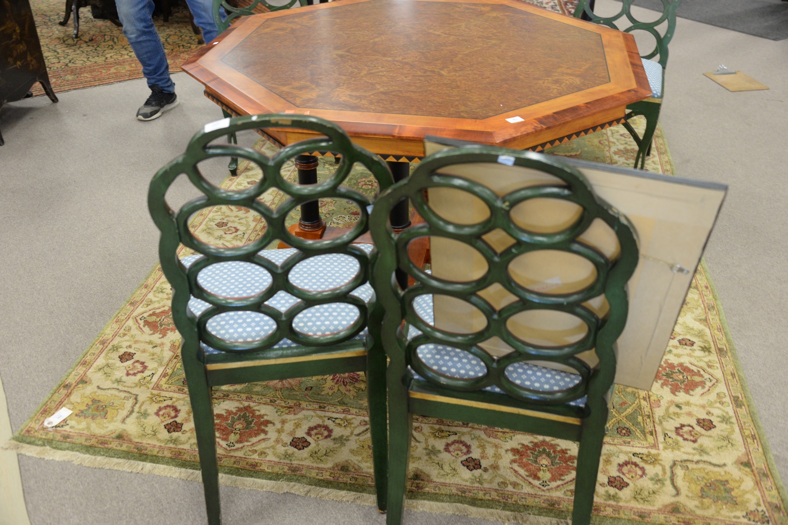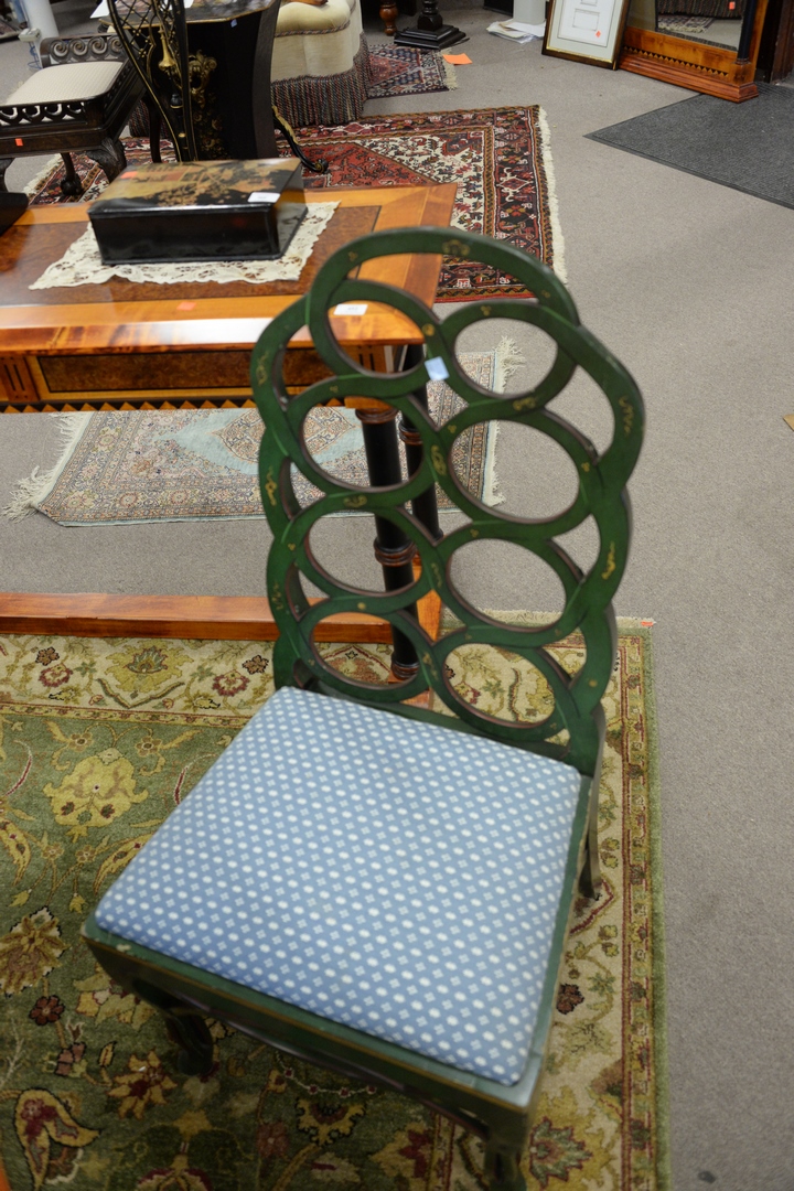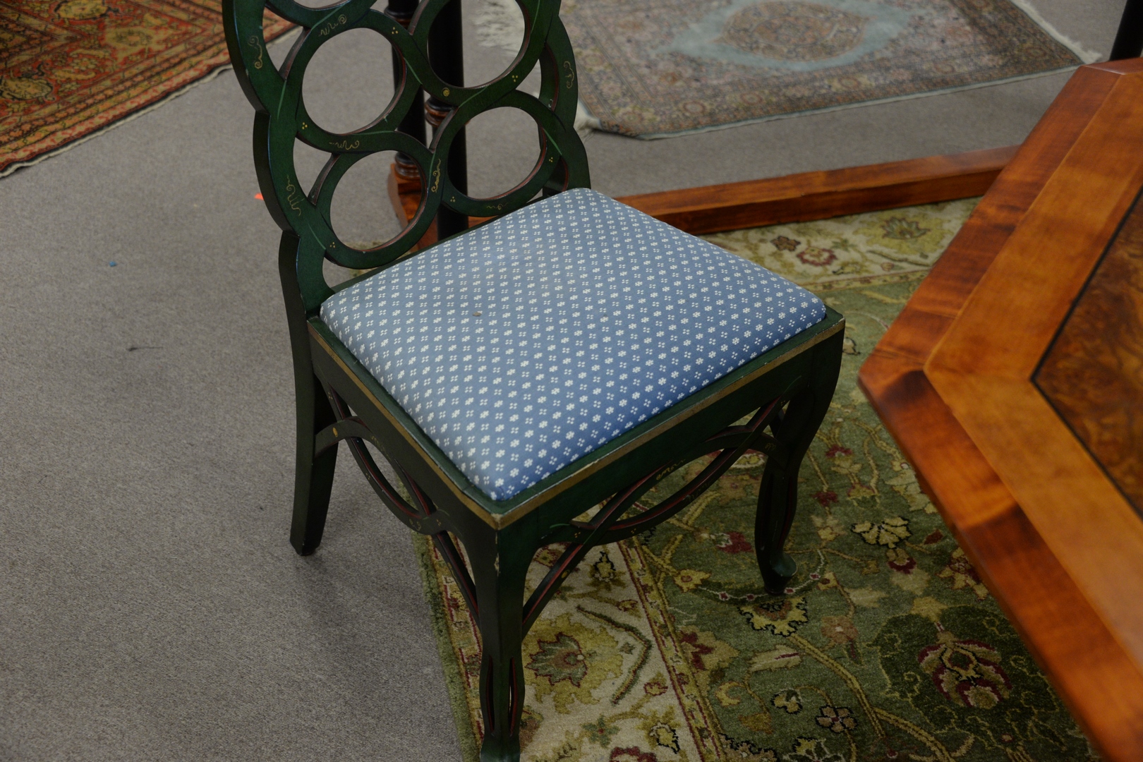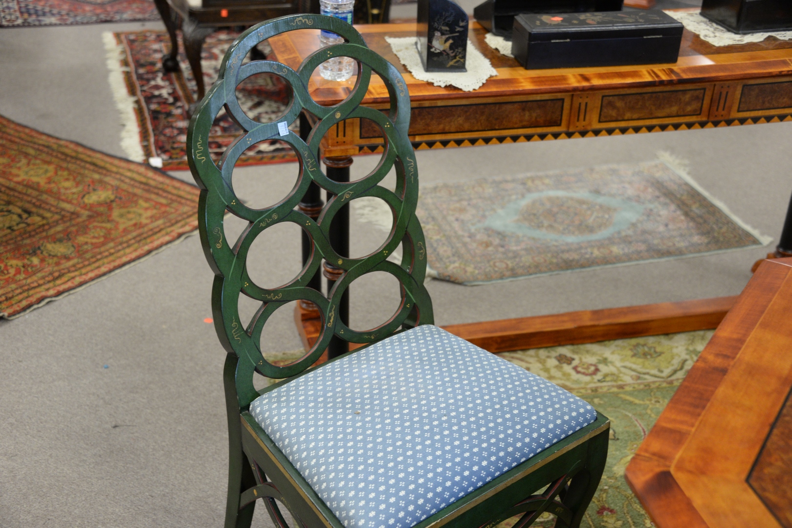 Lot 455: Set of Four Contemporary Side Chairs, green painted with gilt decoration some paint loss, seat height 18 inches.