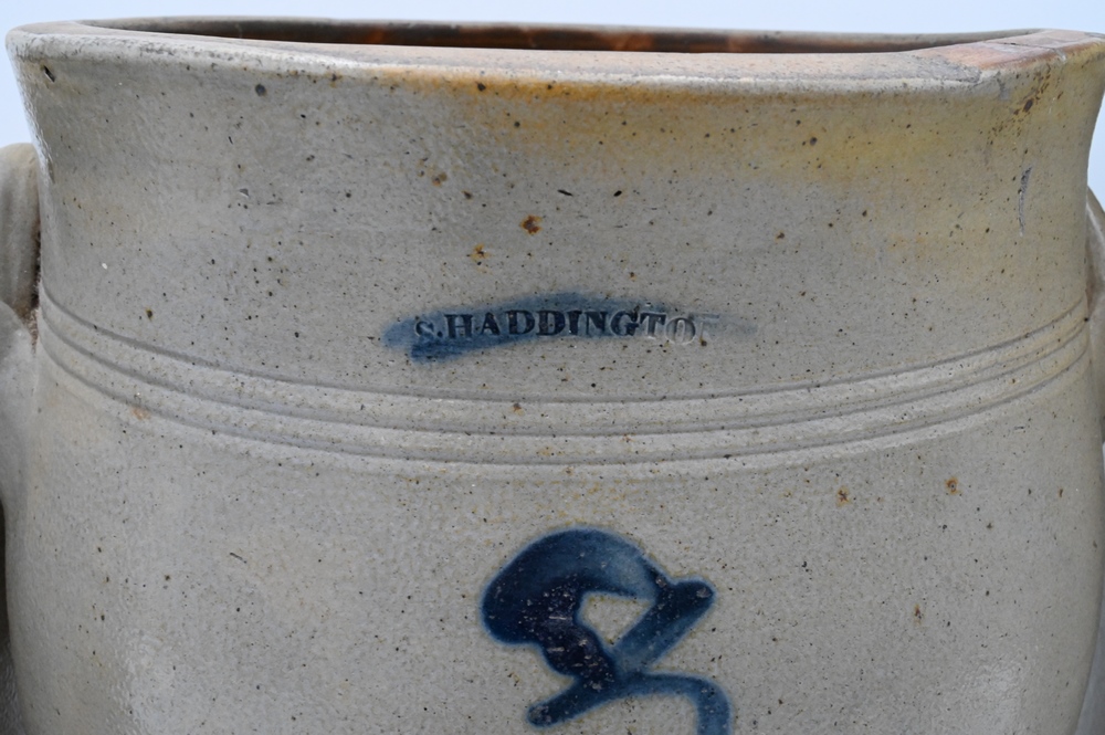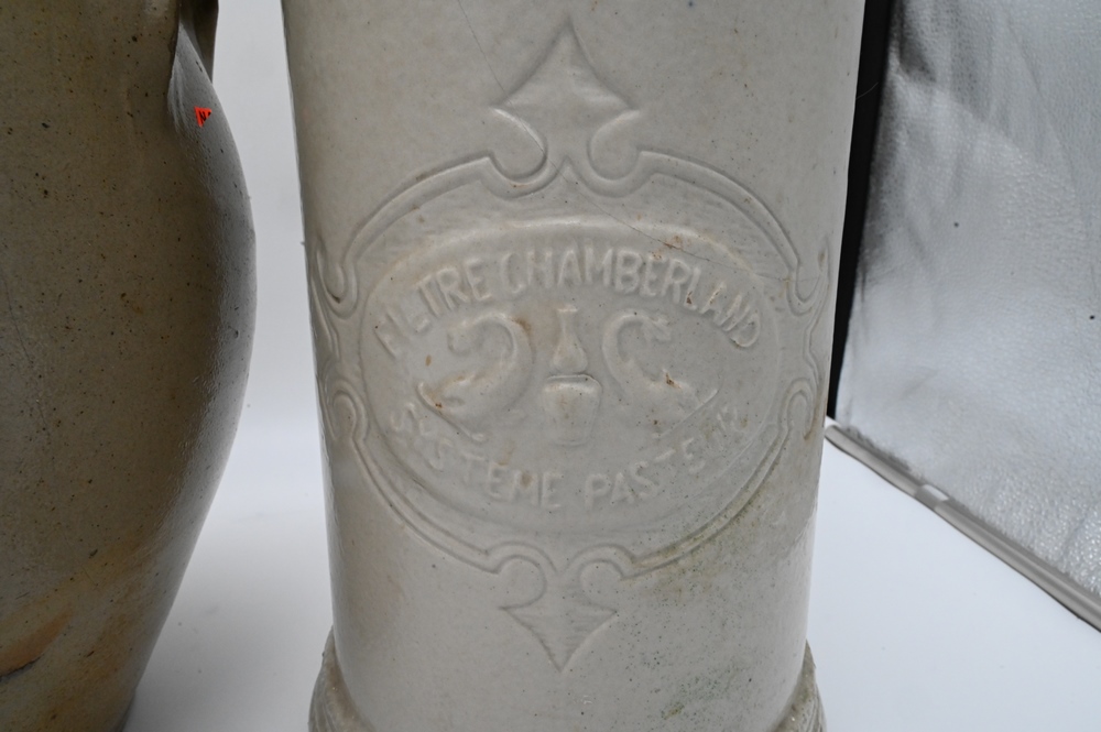 Lot 455: Three Stoneware Pieces, to include a crock with blue decoration, marked S. Haddington; Filtre Chamberland system pasteur stoneware container with spigot hole (hairline), height 15 inches; along with a crock marked Burger and Lane, Rochester, New York. Provenance: Estate of Bruce Sasalla, East Hartford, Connecticut.