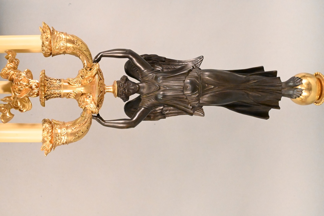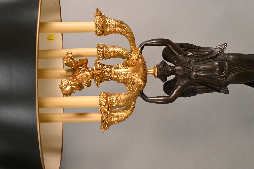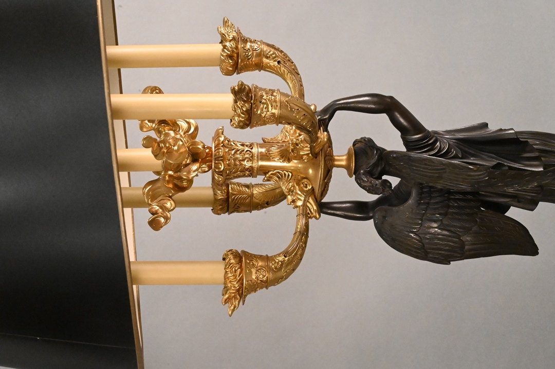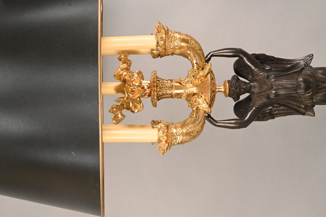 A Pair of French Empire Gilt and Patinated Bronze Figural Candelabra