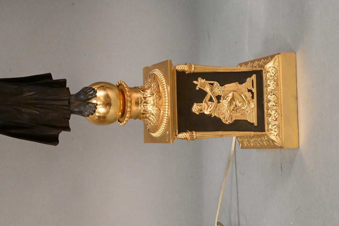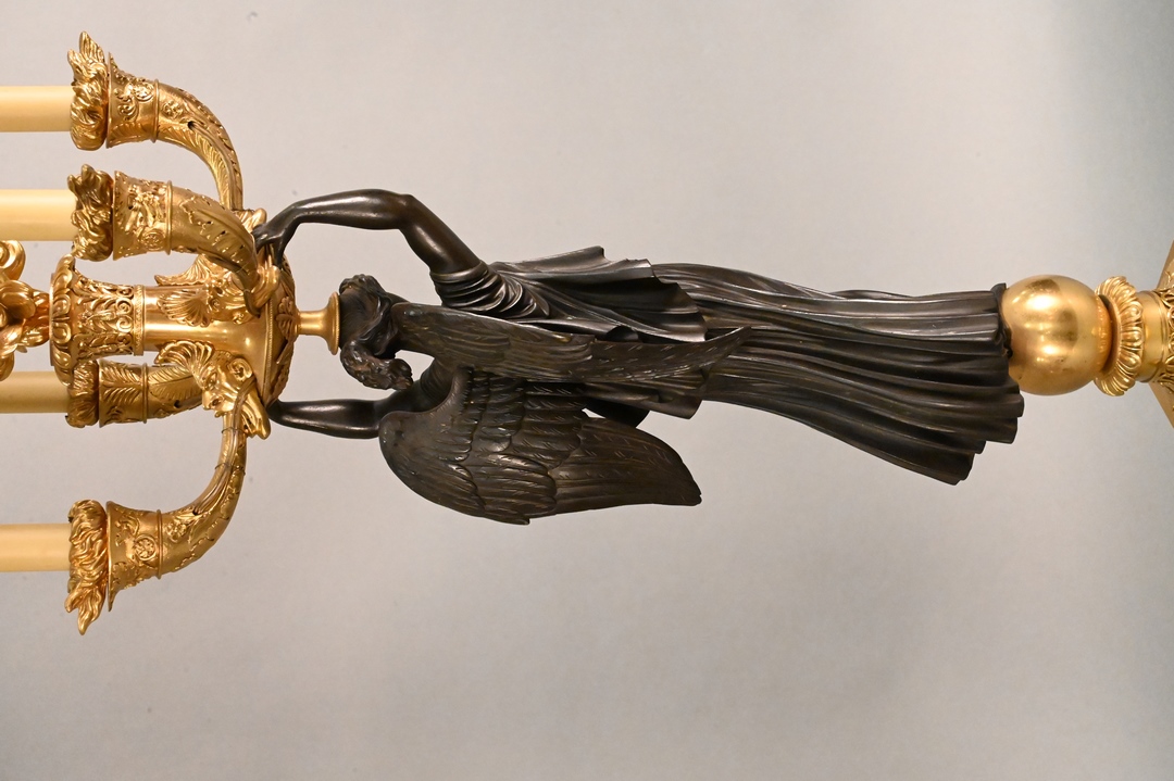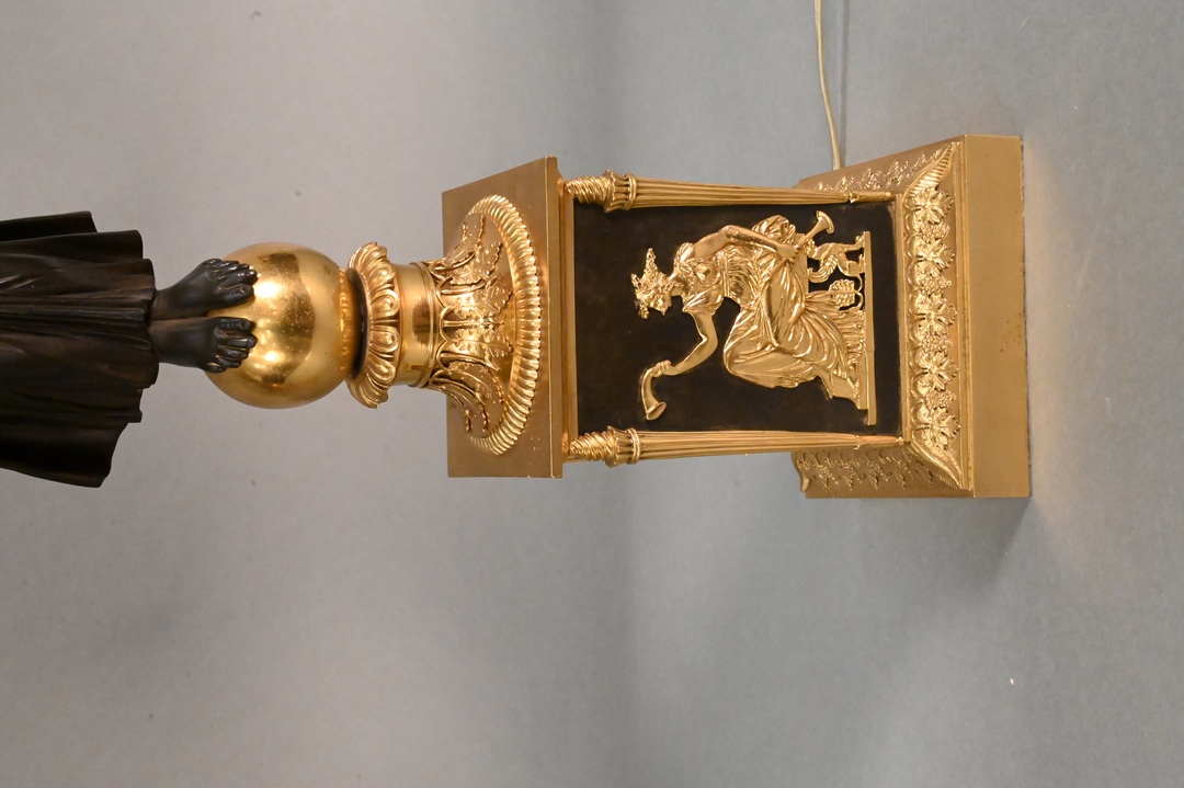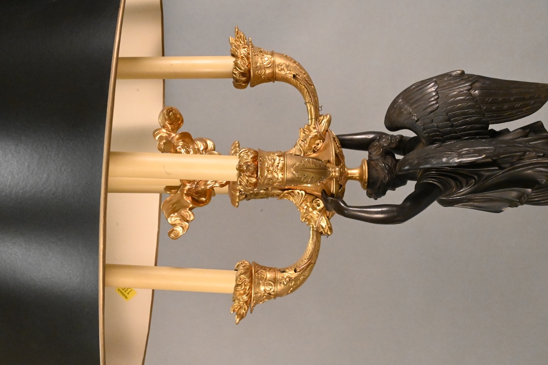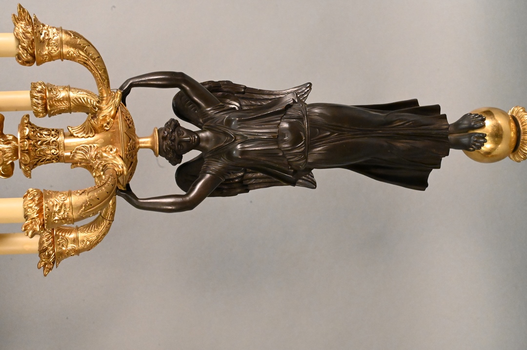 A Pair of French Empire Gilt and Patinated Bronze Figural Candelabra