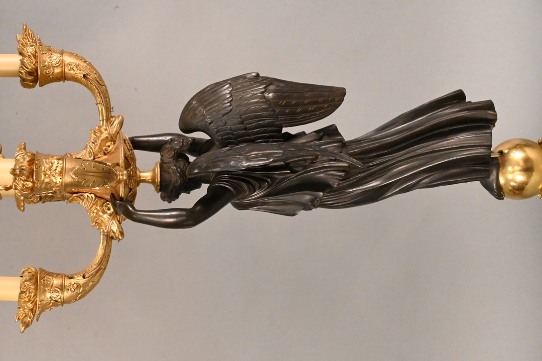 having three trumpet-shaped arms, cast with leaf mask heads and acanthus leaves below flambe collars and drip pans, elongated from grotesque mask heads, applied to vase-shaped central section, supported by winged female figures of victory standing on orb pedestals, above rectangular plinth on square bases